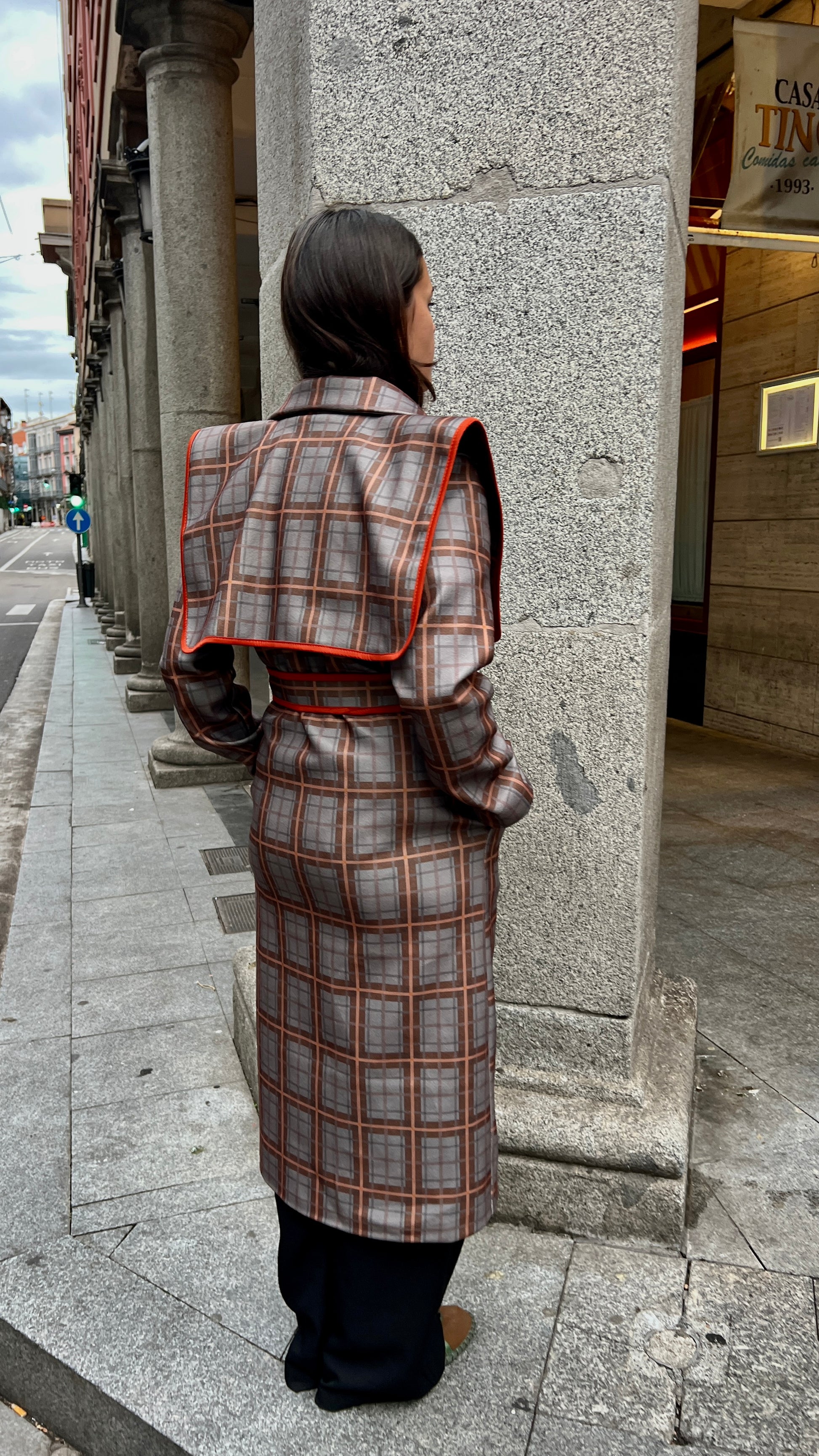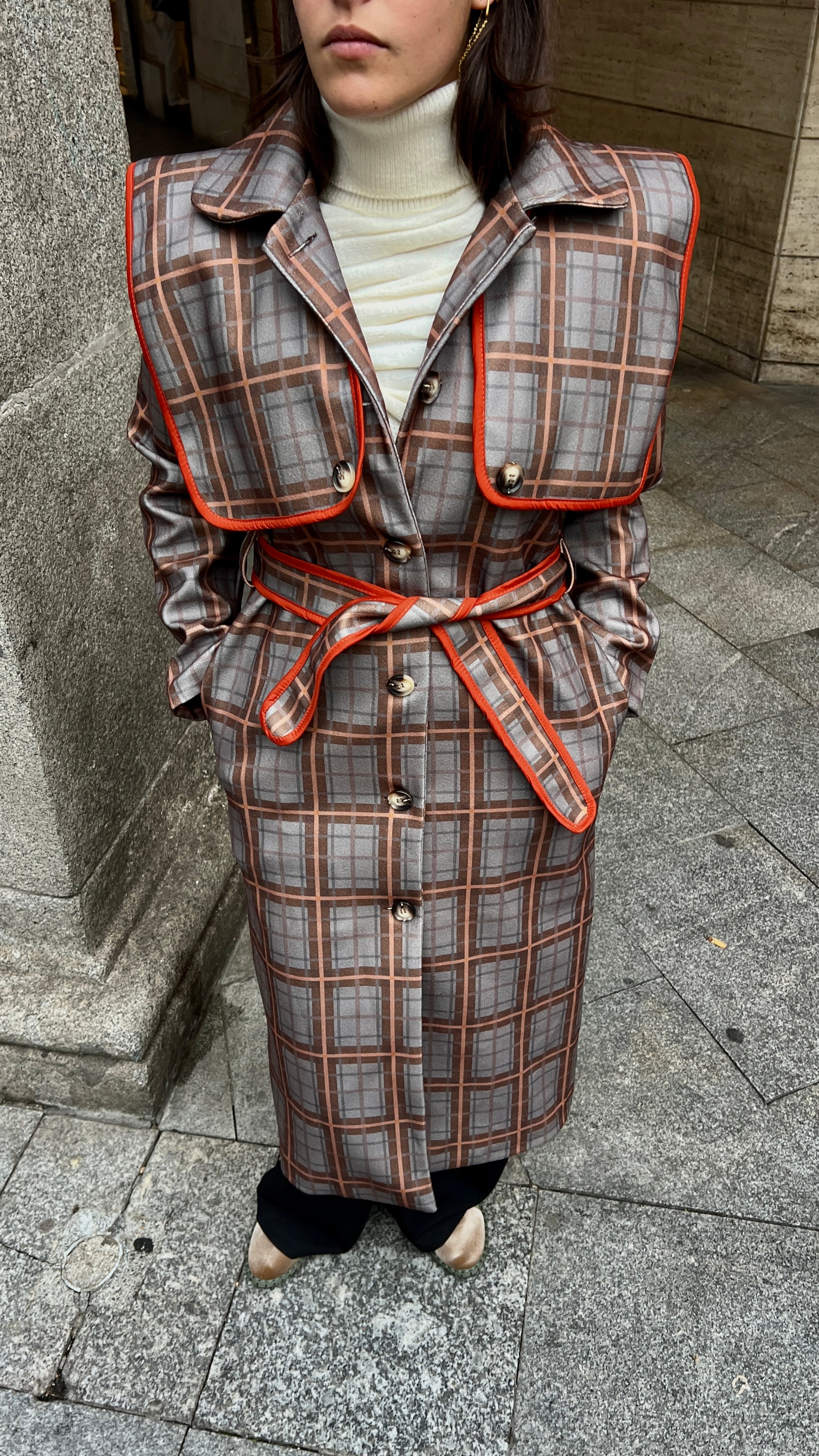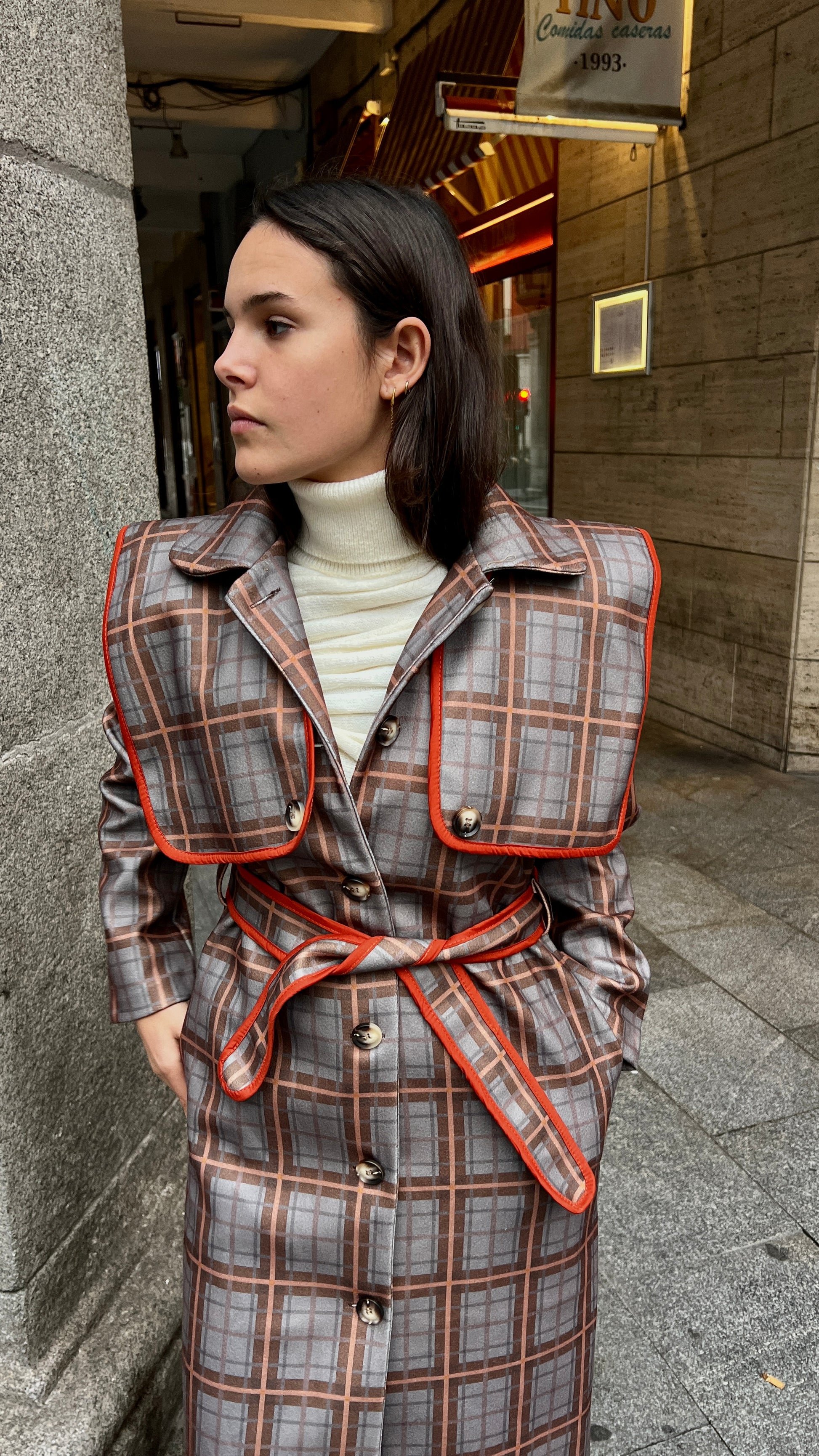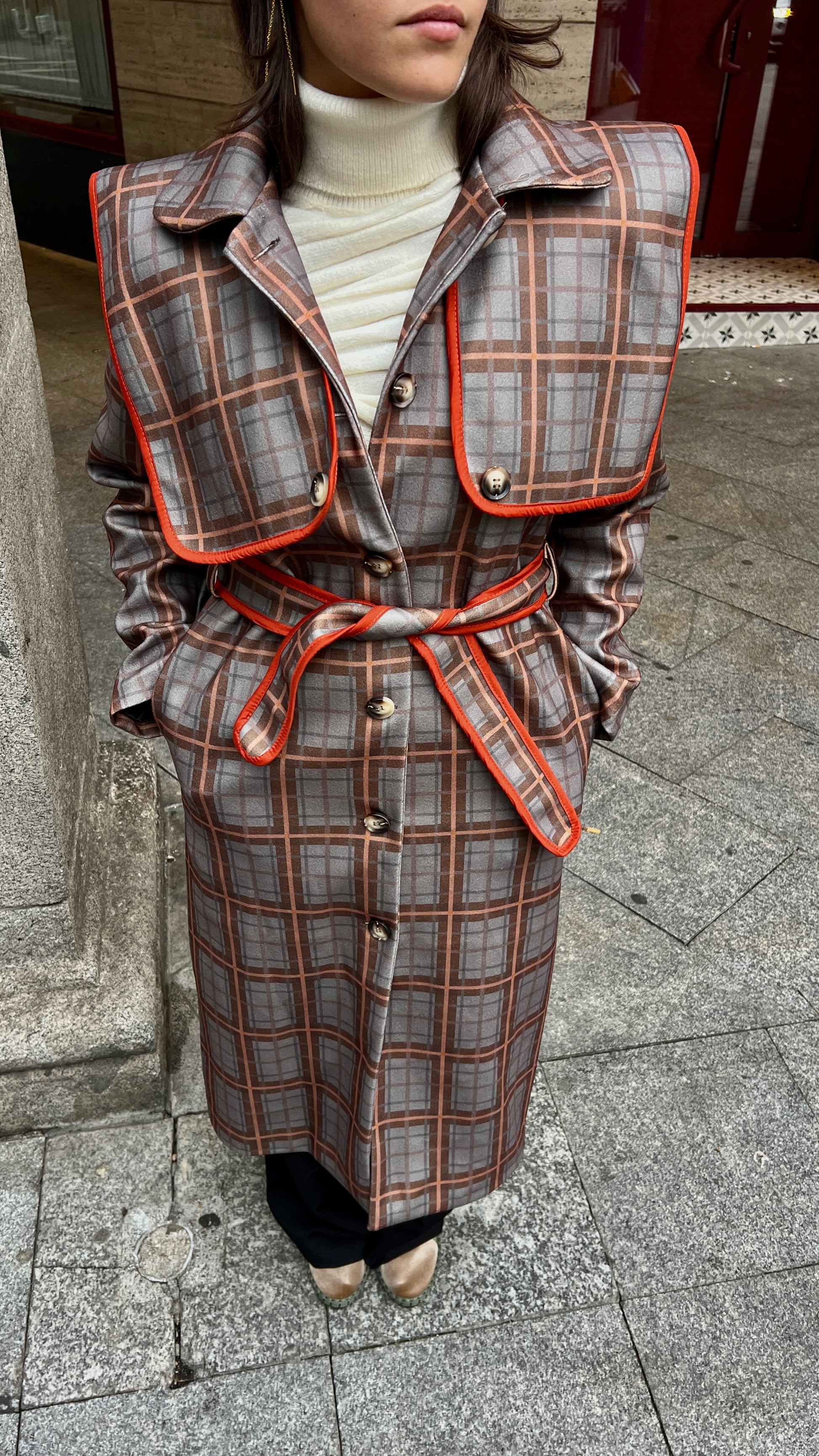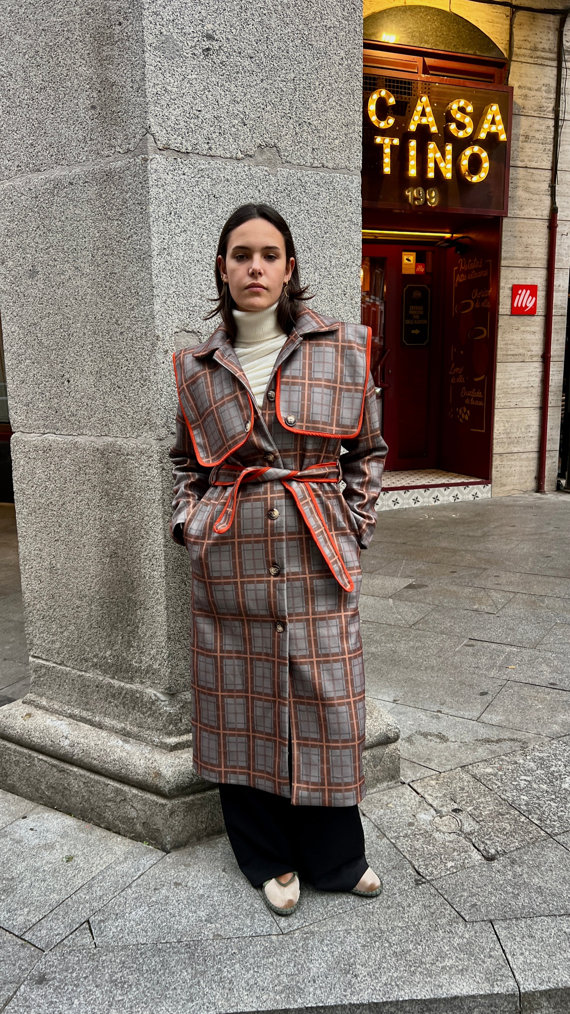 Abrigo largo estampado en un cuadro estilo escocés, solapa desmontable con ribete naranja que hace un contrate ideal con los tonos grises y caldera del estampado del propio abrigo, abotonado con cinturón y bolsillos. Confeccionado en polyester 100%, calentito.