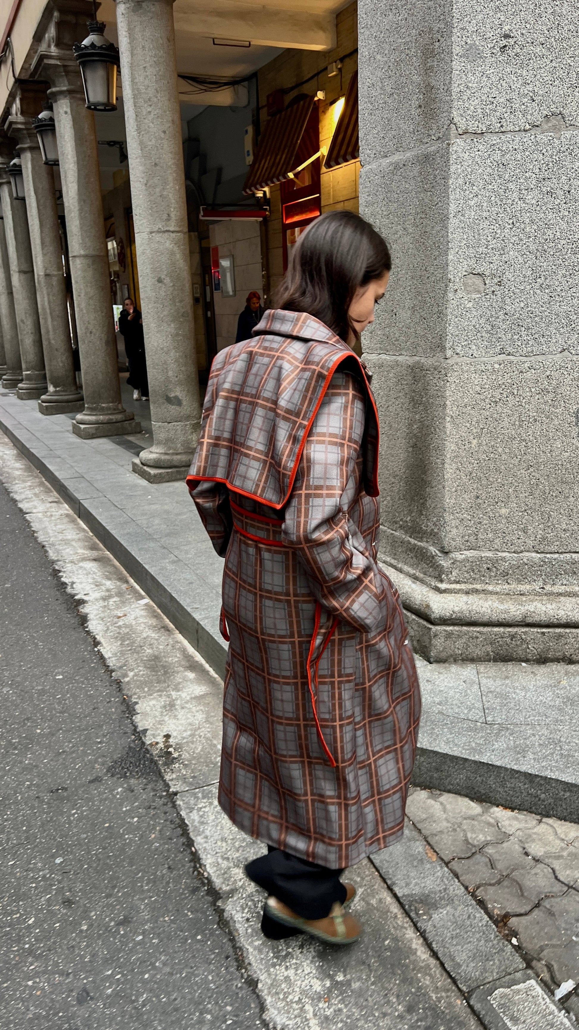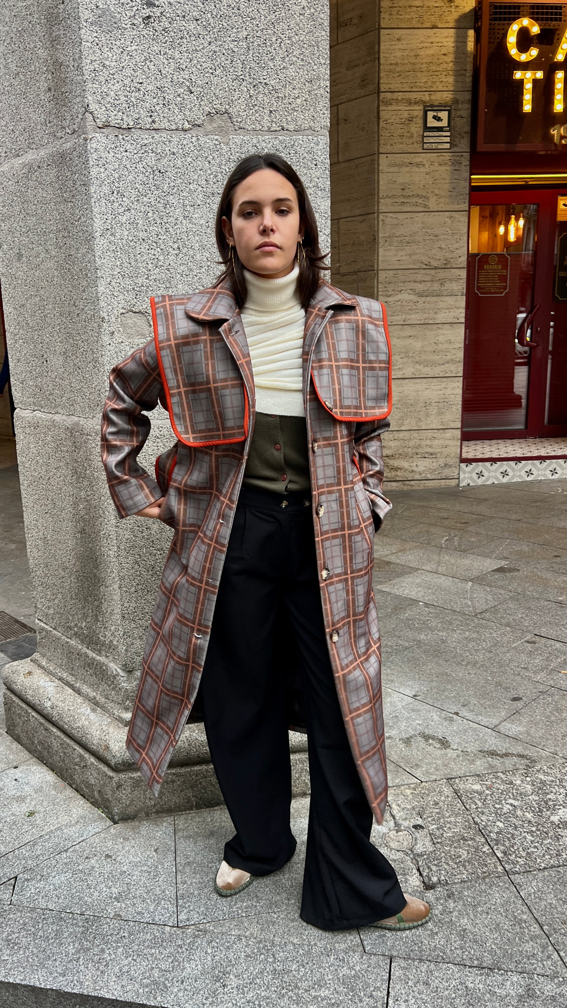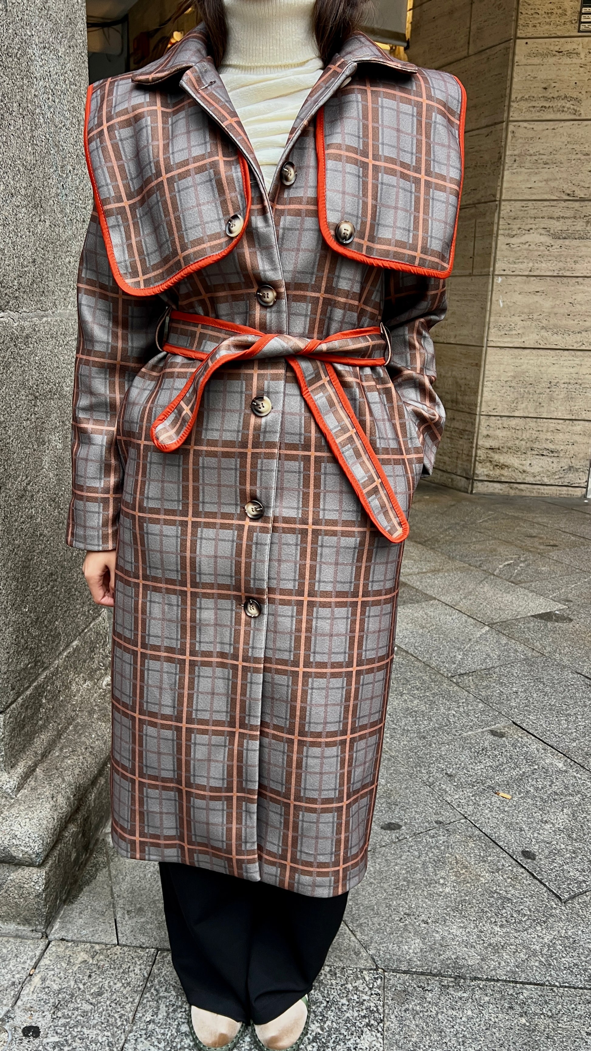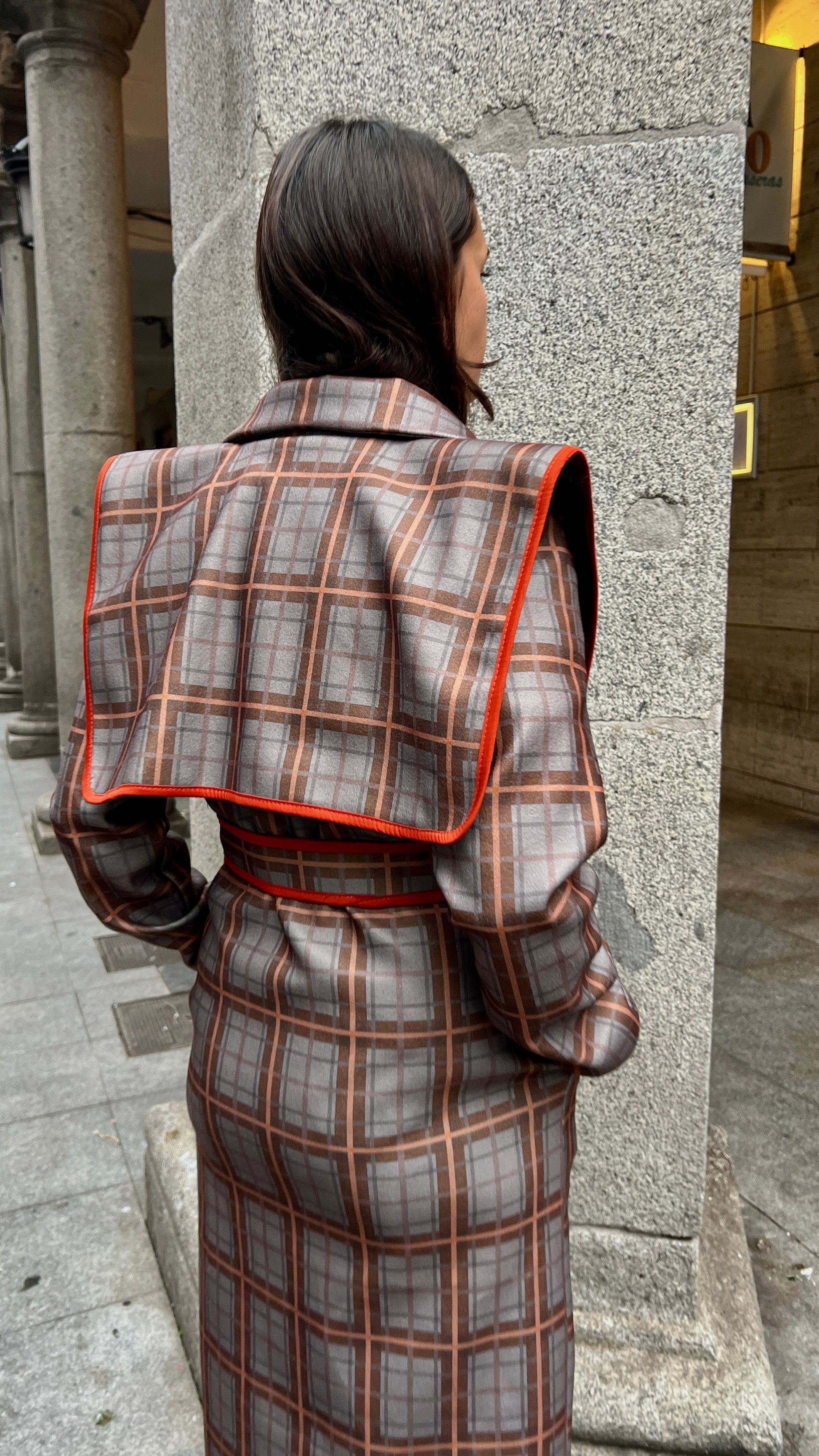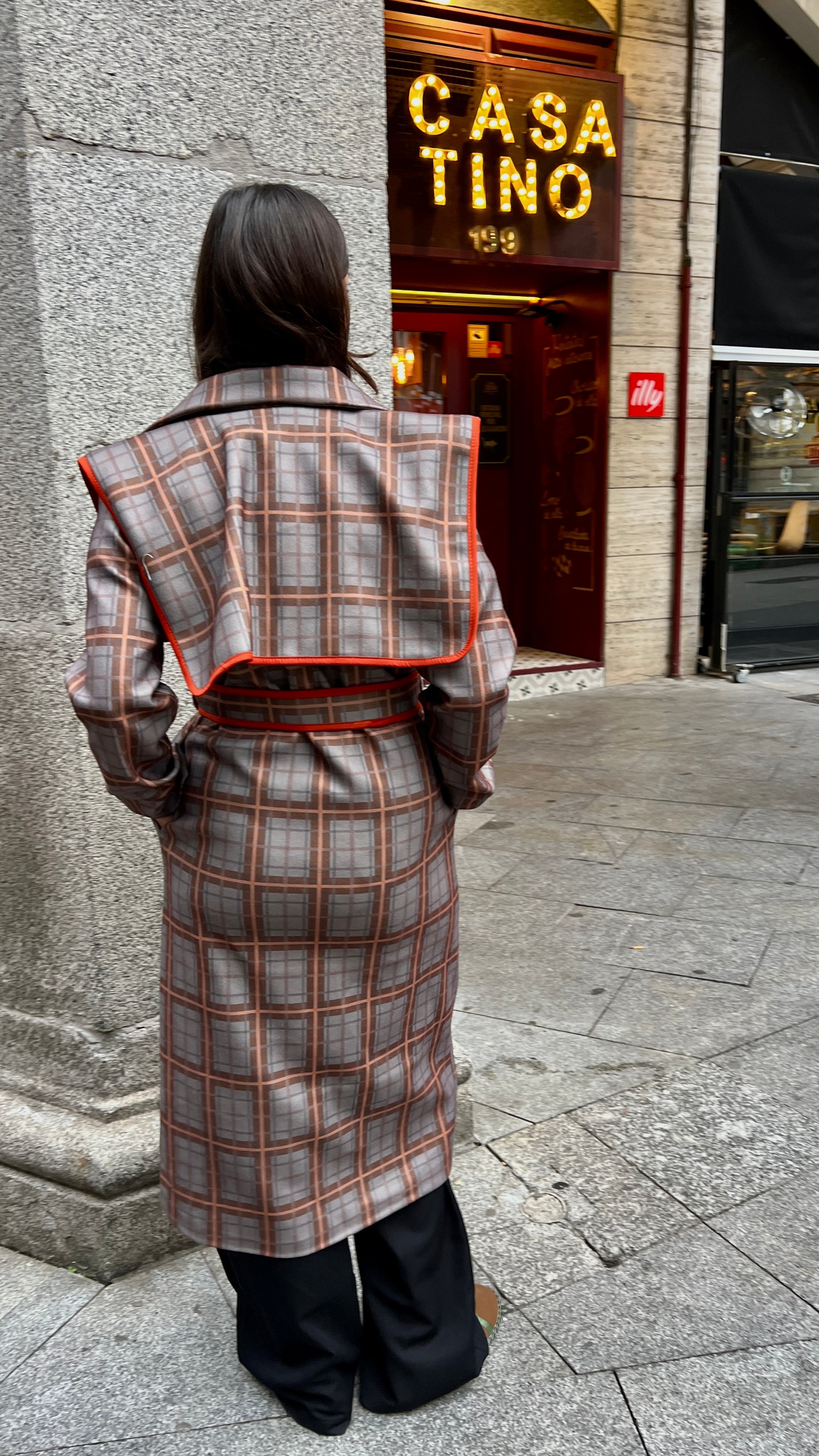 Abrigo largo estampado en un cuadro estilo escocés, solapa desmontable con ribete naranja que hace un contrate ideal con los tonos grises y caldera del estampado del propio abrigo, abotonado con cinturón y bolsillos. Confeccionado en polyester 100%, calentito.