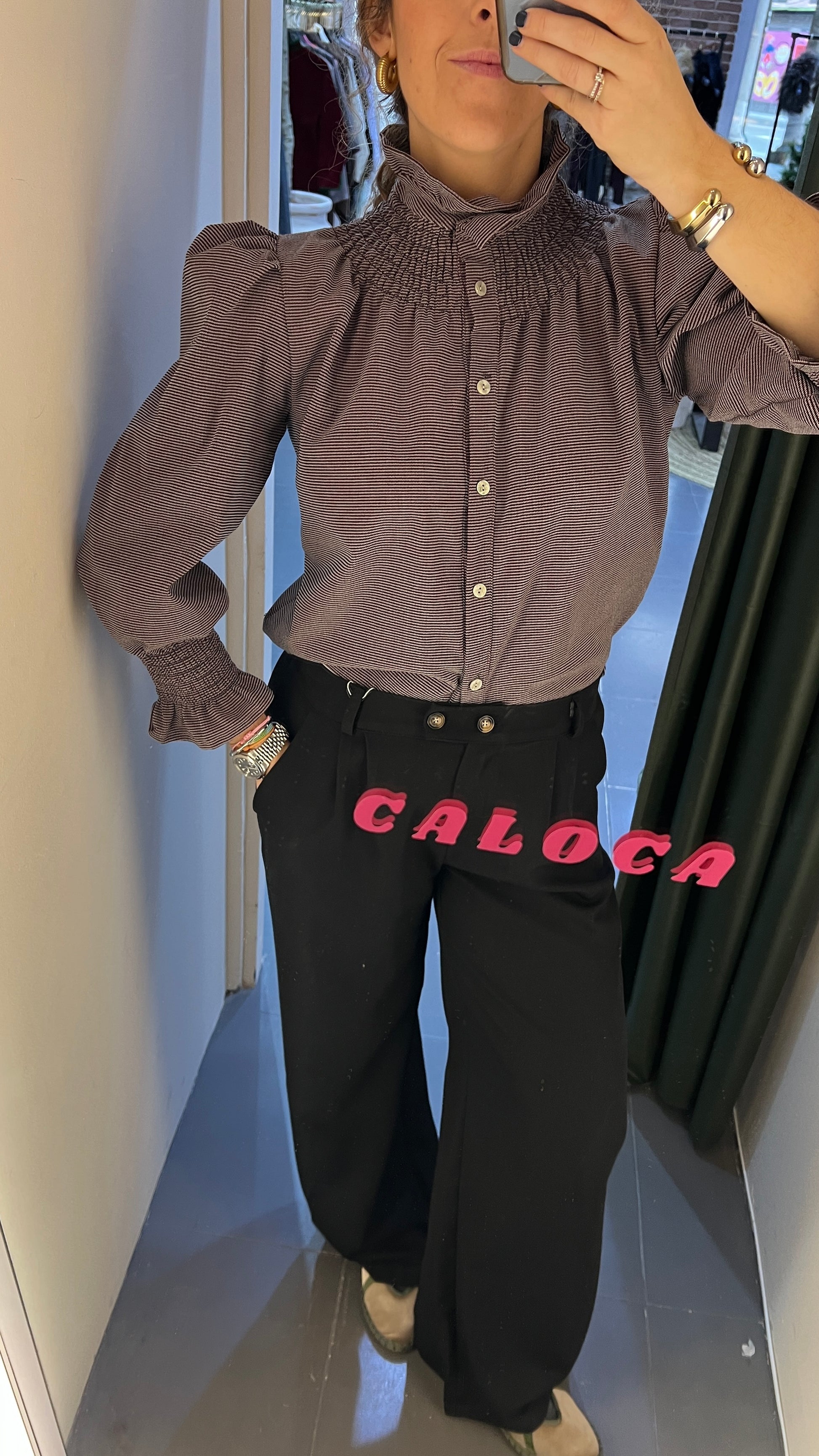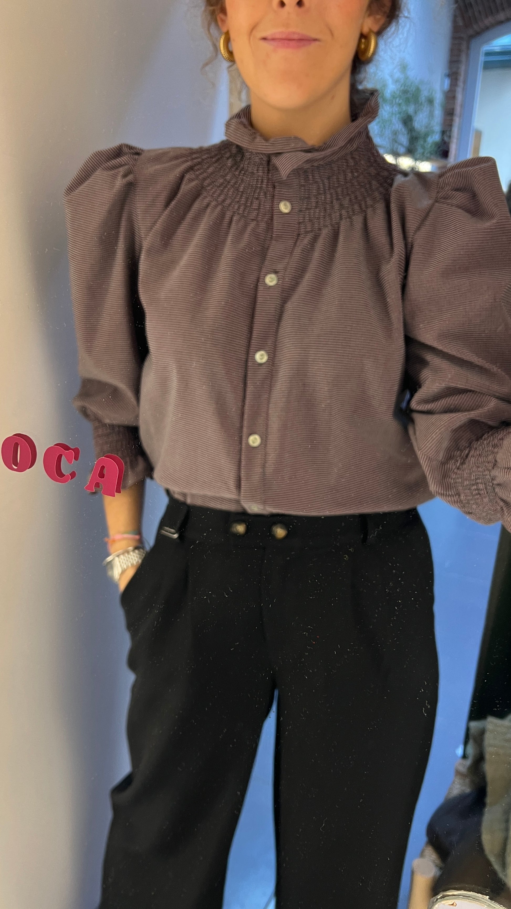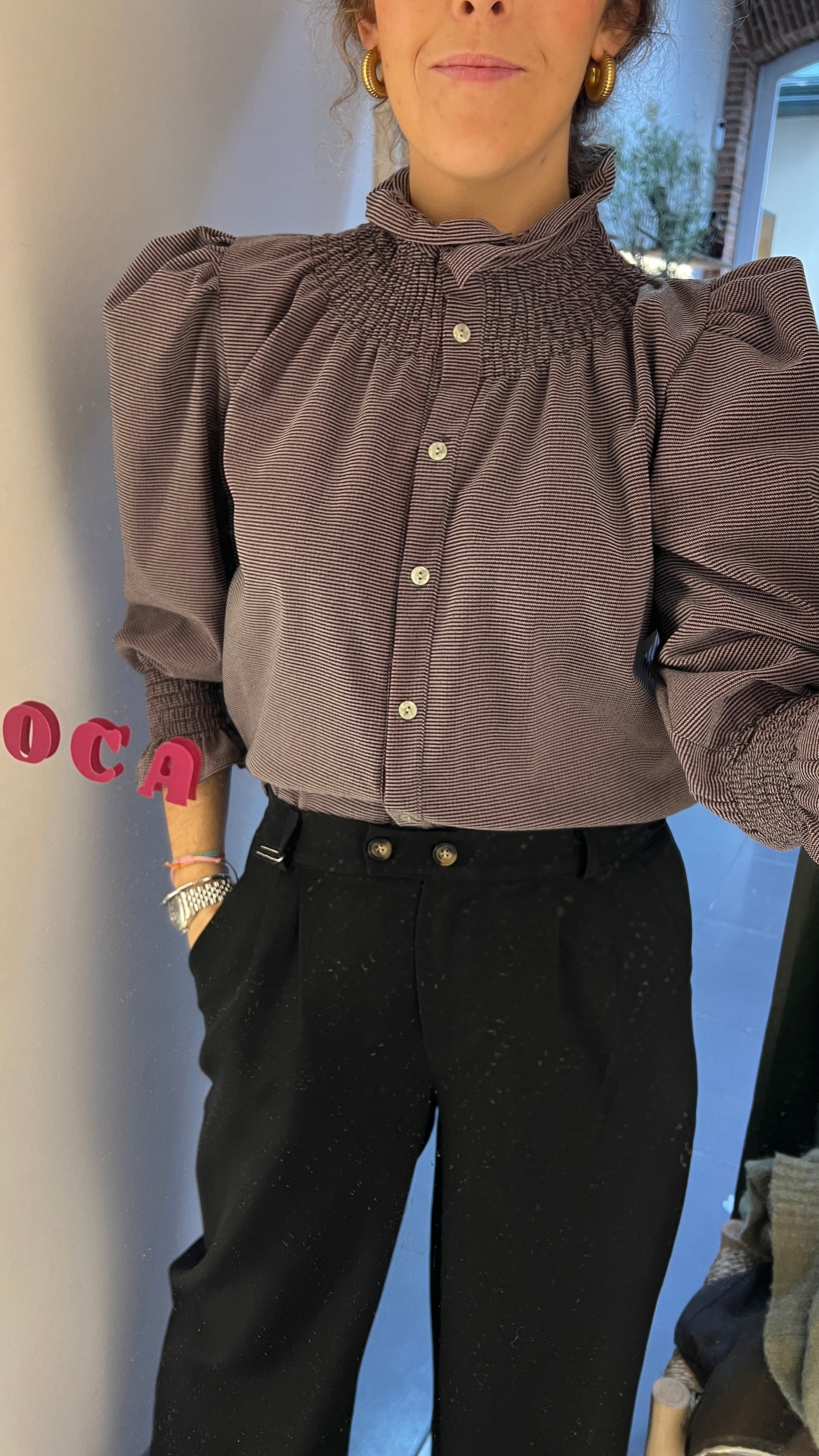 Blusa abotonada con mangas con abullonadas y nido de abeja en los puños. El tejido es elástico