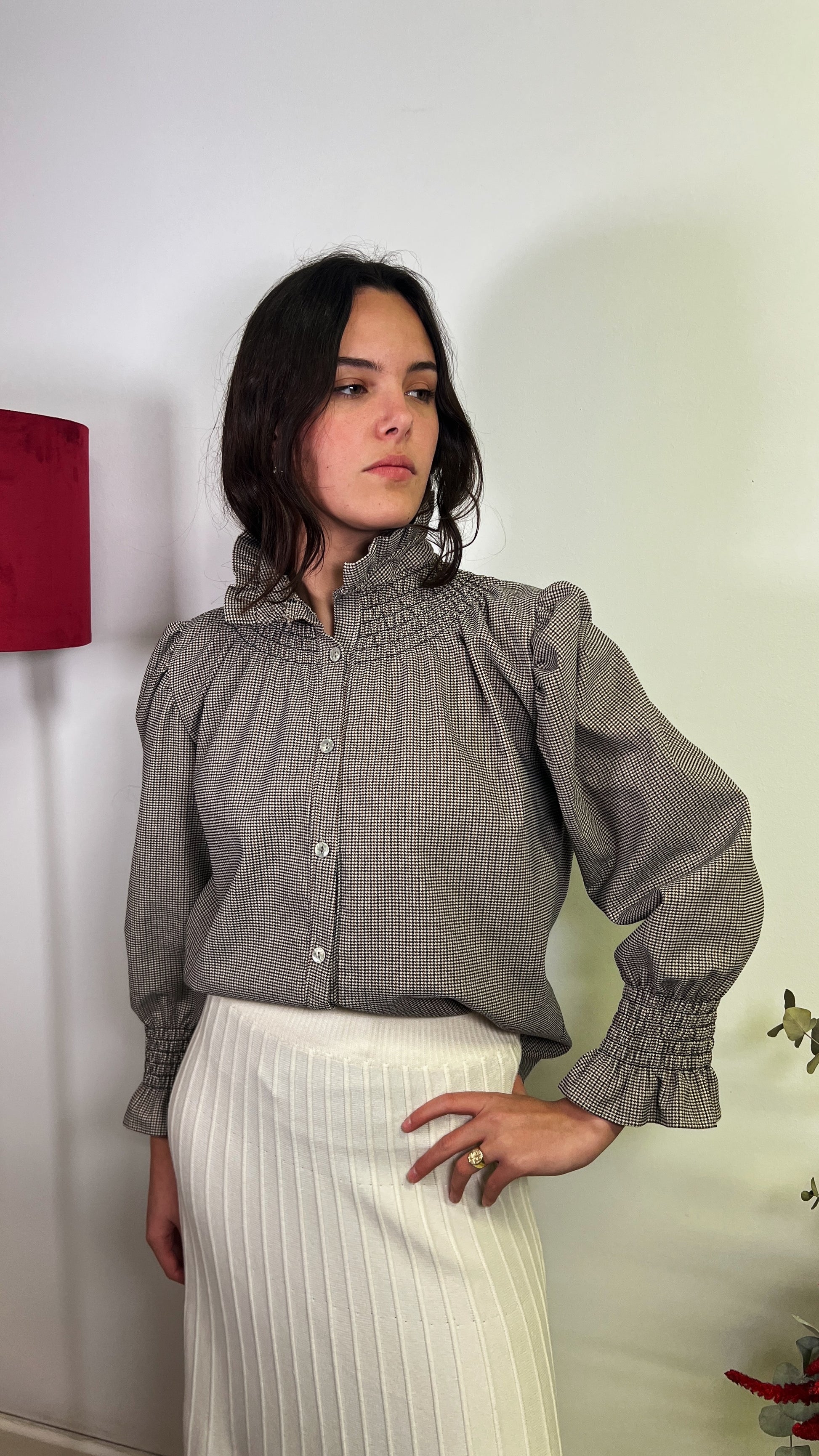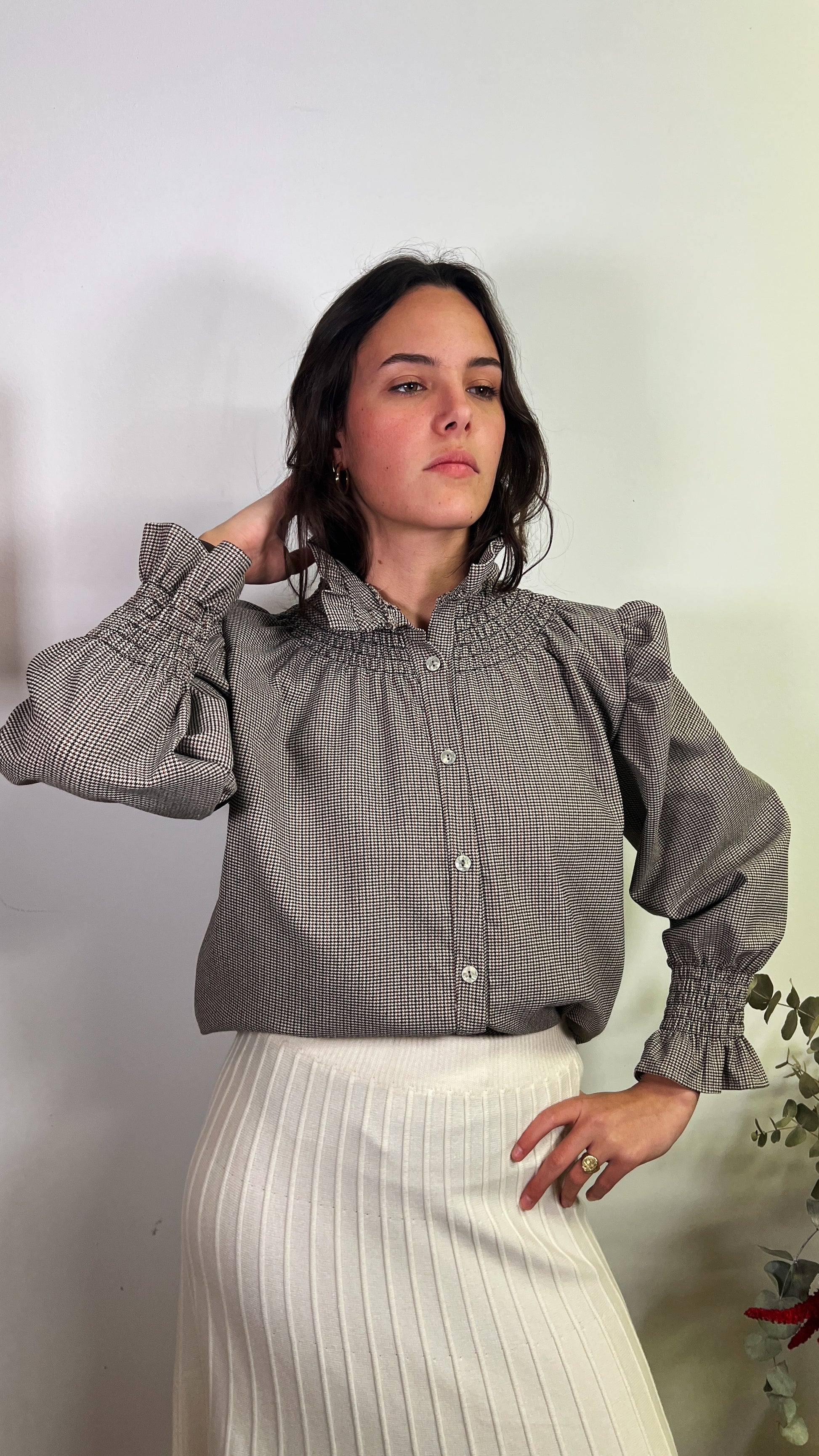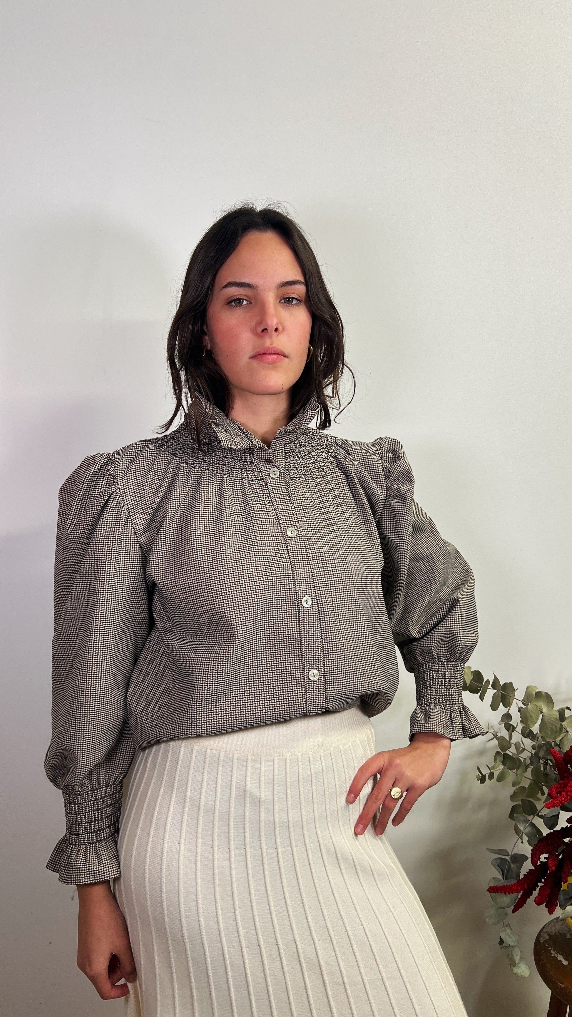 Blusa abotonada con mangas con abullonadas y nido de abeja en los puños. El tejido es elástico