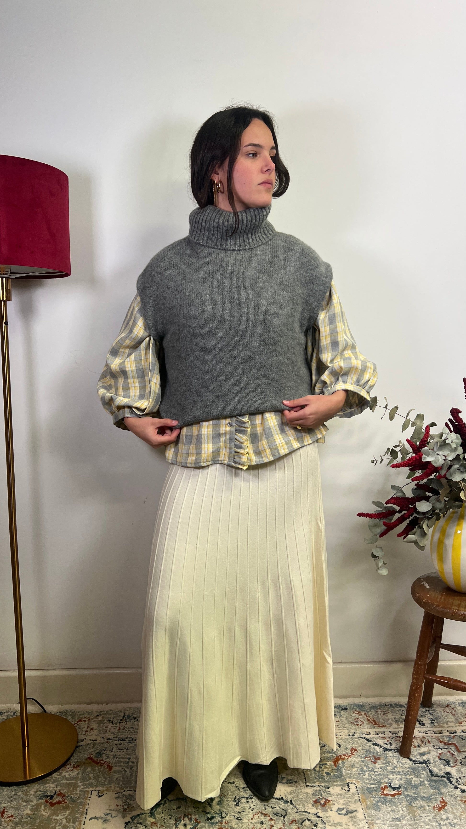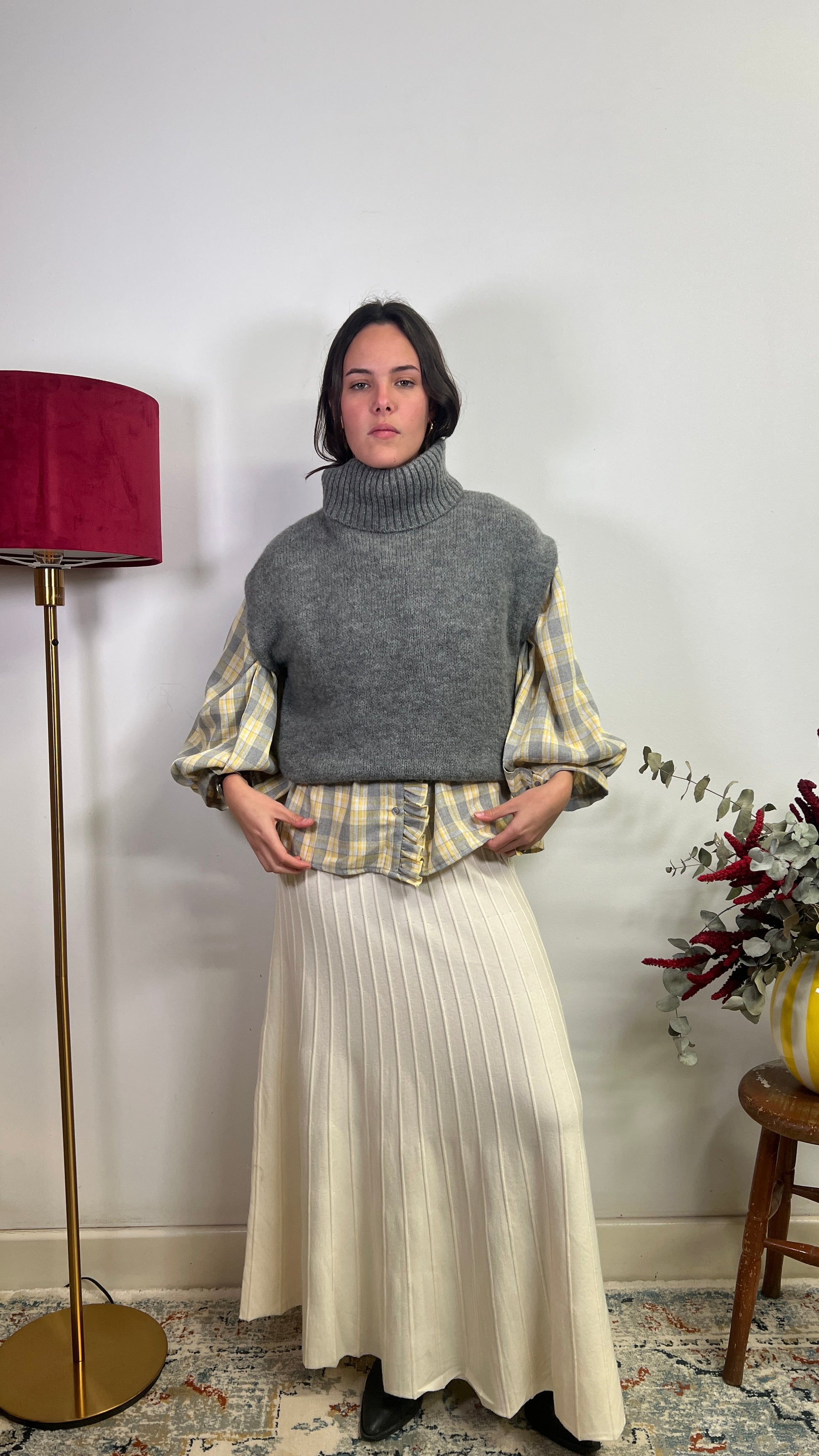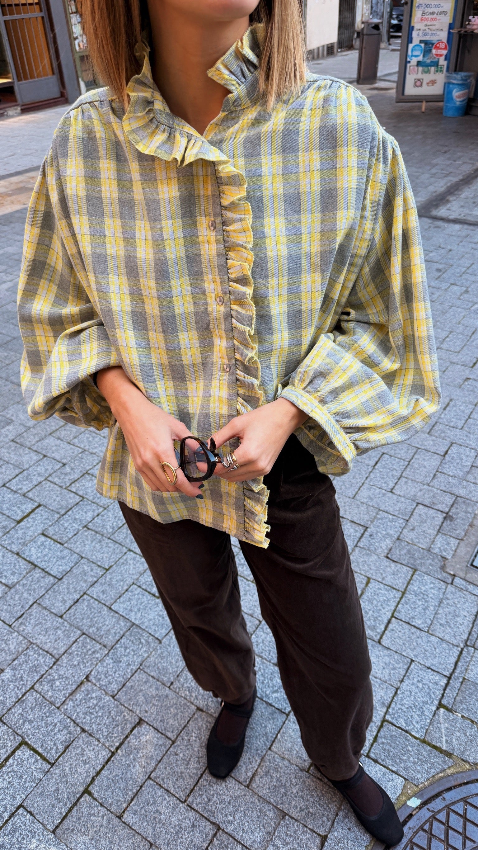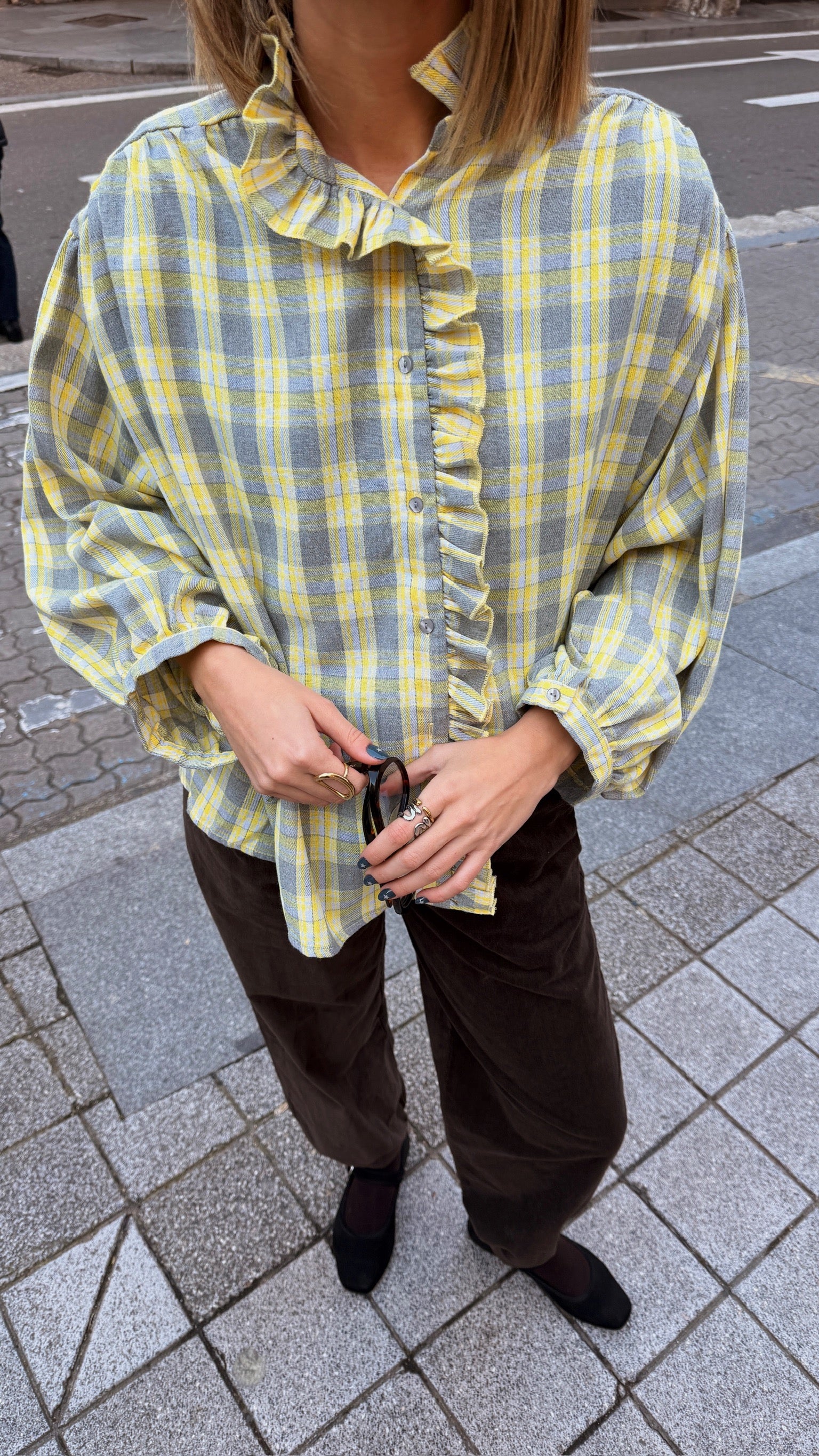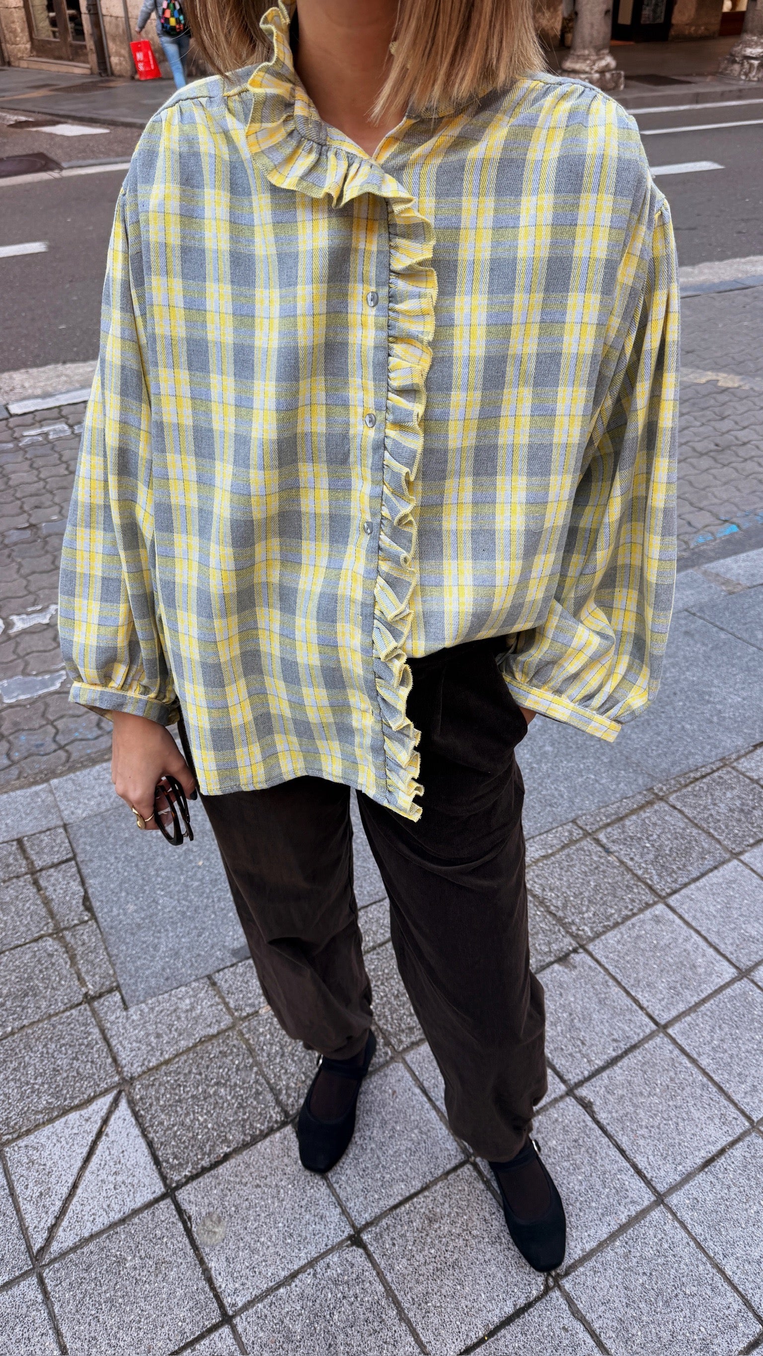 Blusa con estampado de cuadros y volante en el cuello, abotonada.