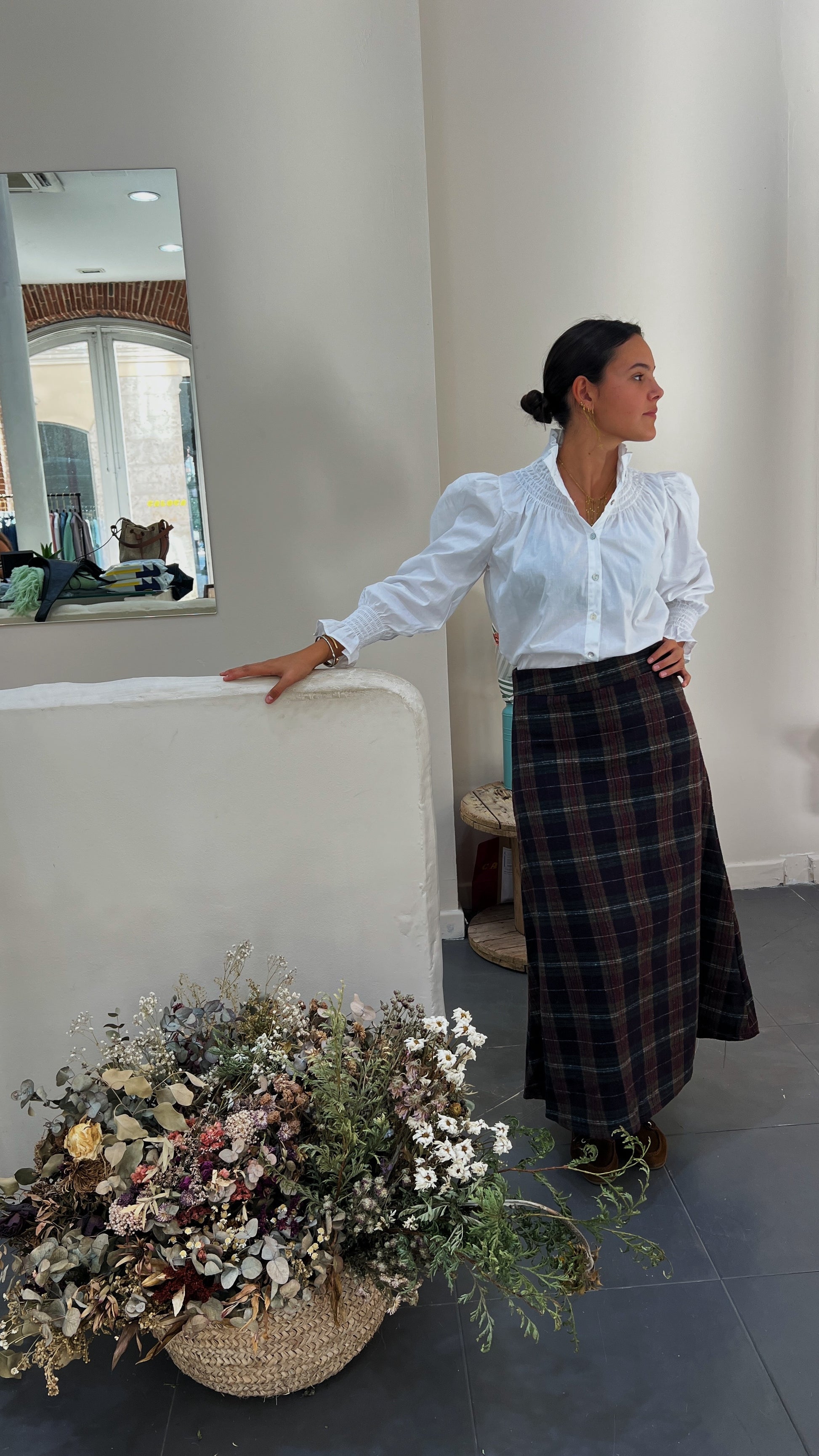 Blusa abotonada con mangas con abullonadas y nido de abeja en los puños.