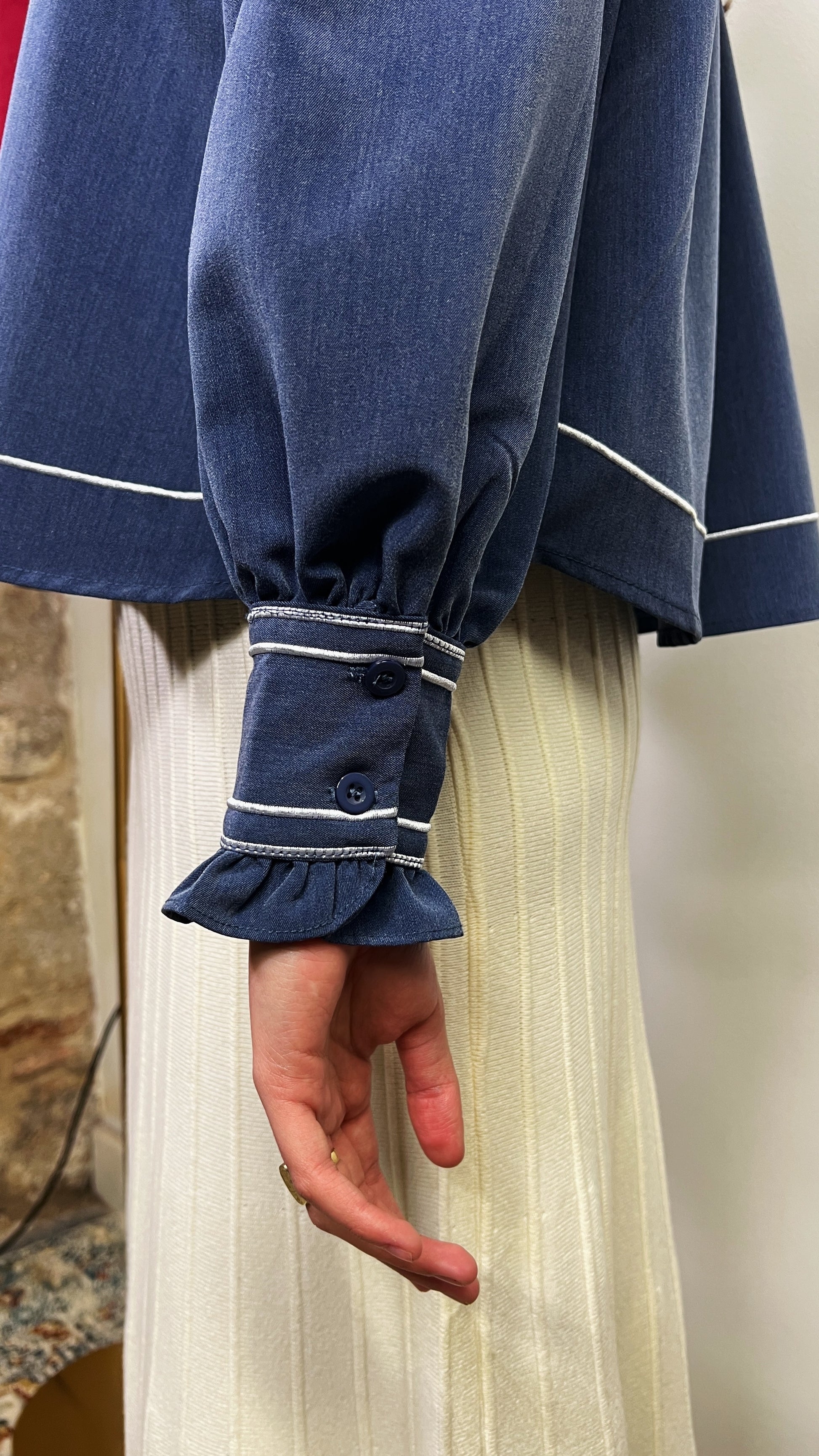 Blusa azul con detalles en blanco y volante en mangas