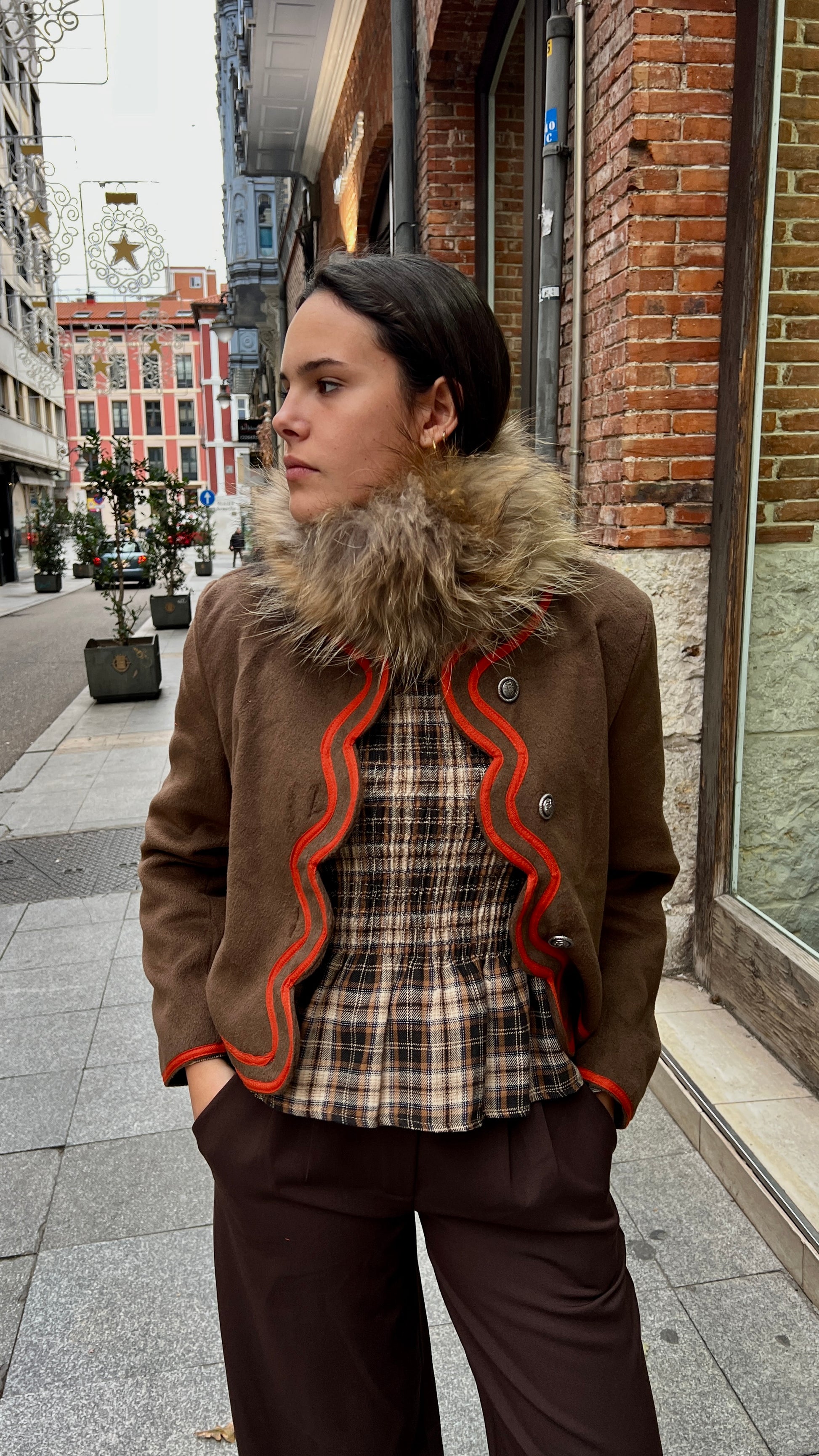 Chaqueta con un detalle en onda que forma el ribete naranja, Su corte estructurado y los botones metálicos frontales aportan un aire clásico y sofisticado, perfecto para combinar con camisas o blusas. Con hombrera.