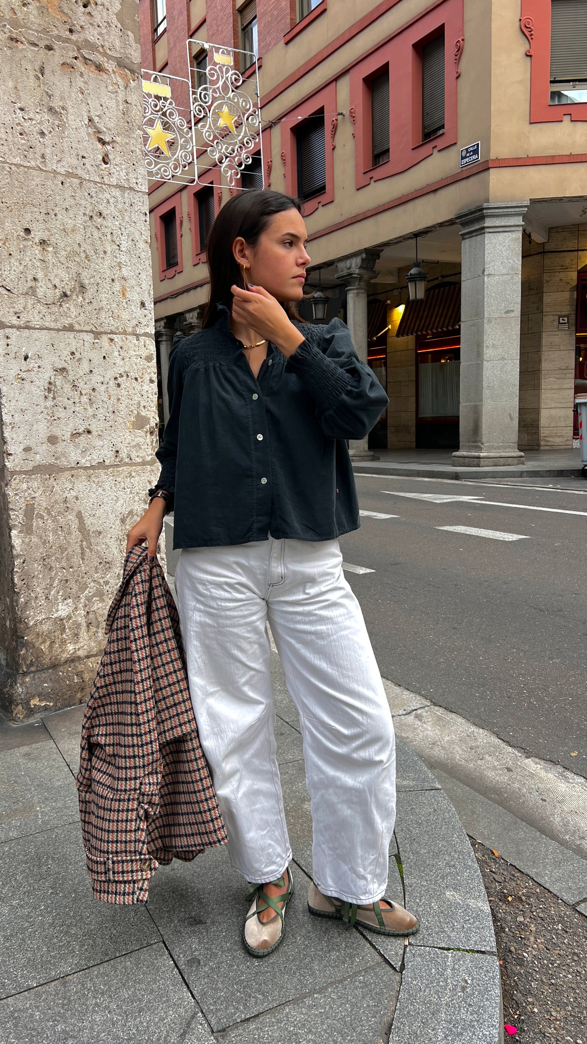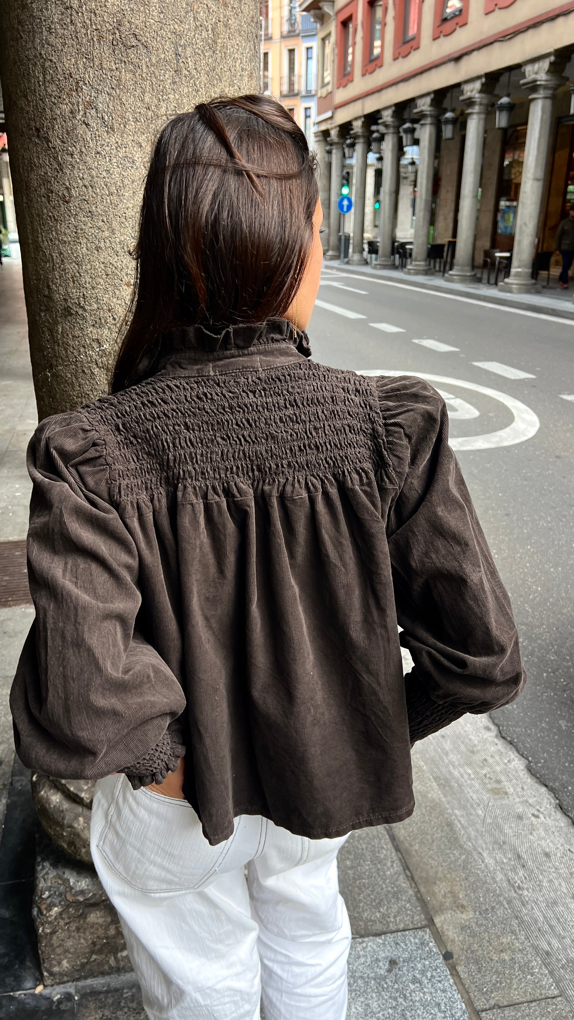 Blusa abotonada con mangas con abullonadas y nido de abeja en los puños.