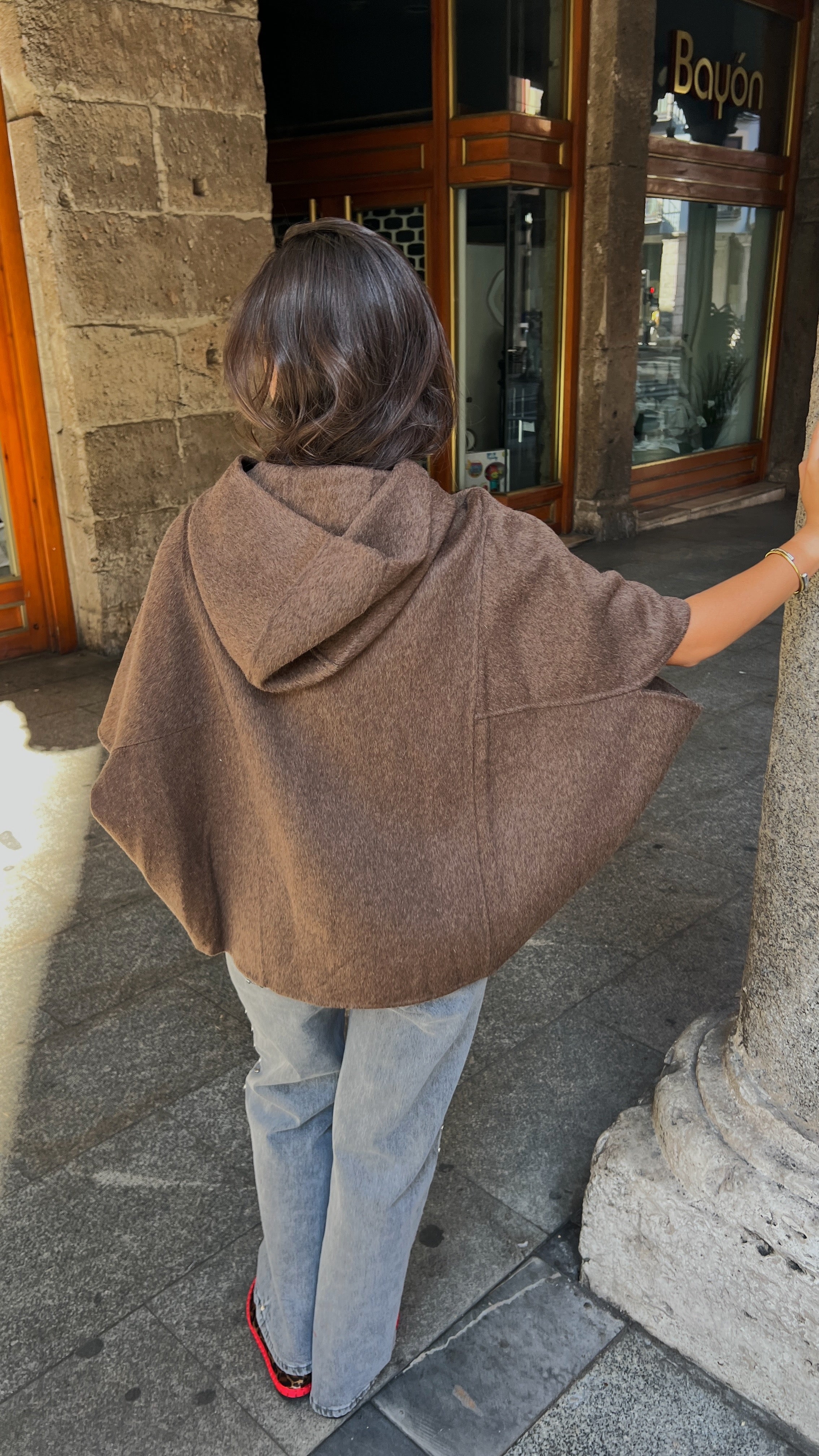 Chaqueta tipo capa en tono marrón chocolate con cierre de botones grandes y capucha. Su diseño amplio y ligero la convierte en una prenda ideal para entretiempo, combinando estilo y comodidad con un aire sofisticado y relajado.