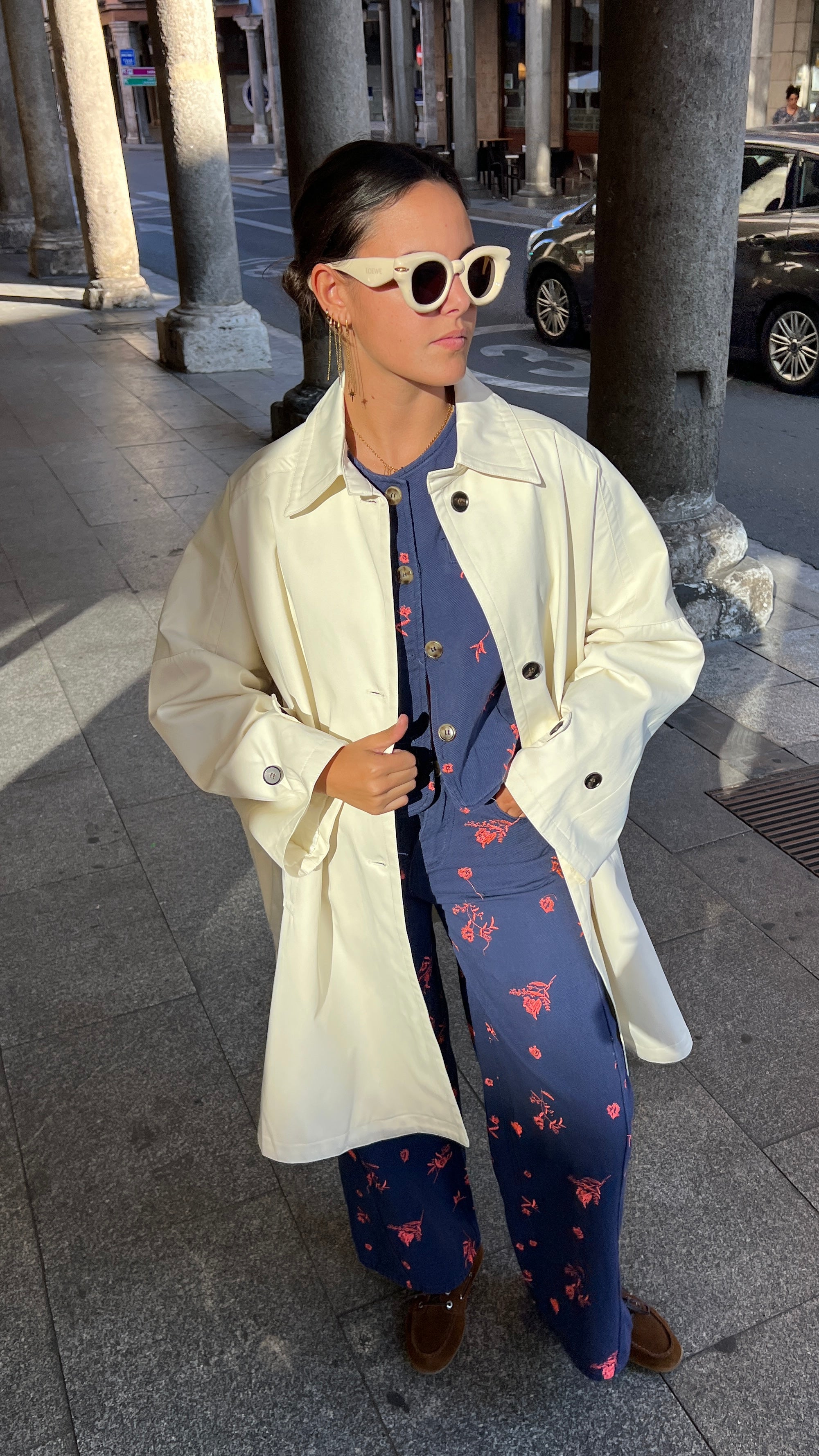 Gabardina oversize en tono crudo con acabado satinado. Ligera, versátil y con un diseño atemporal que eleva cualquier look. Ideal para entretiempo, con cierre de botones y detalles en puños. Talla única.