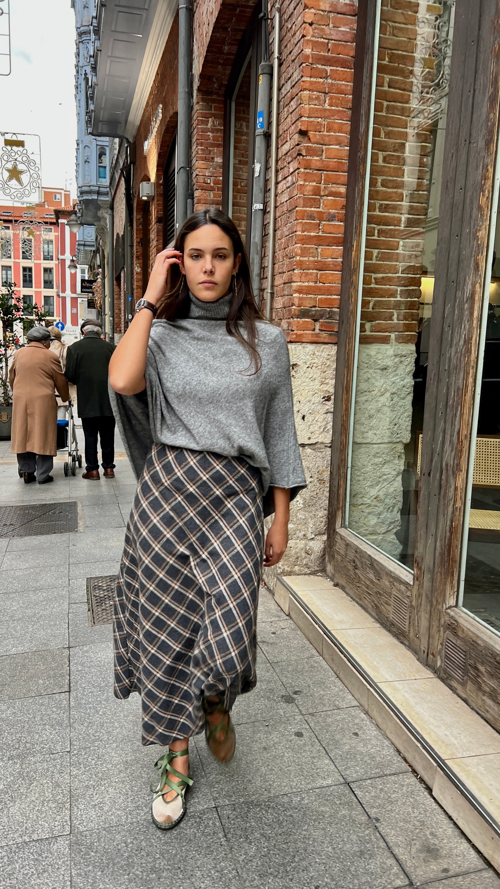 Poncho de punto en forma de pico, con cuello vuelto.