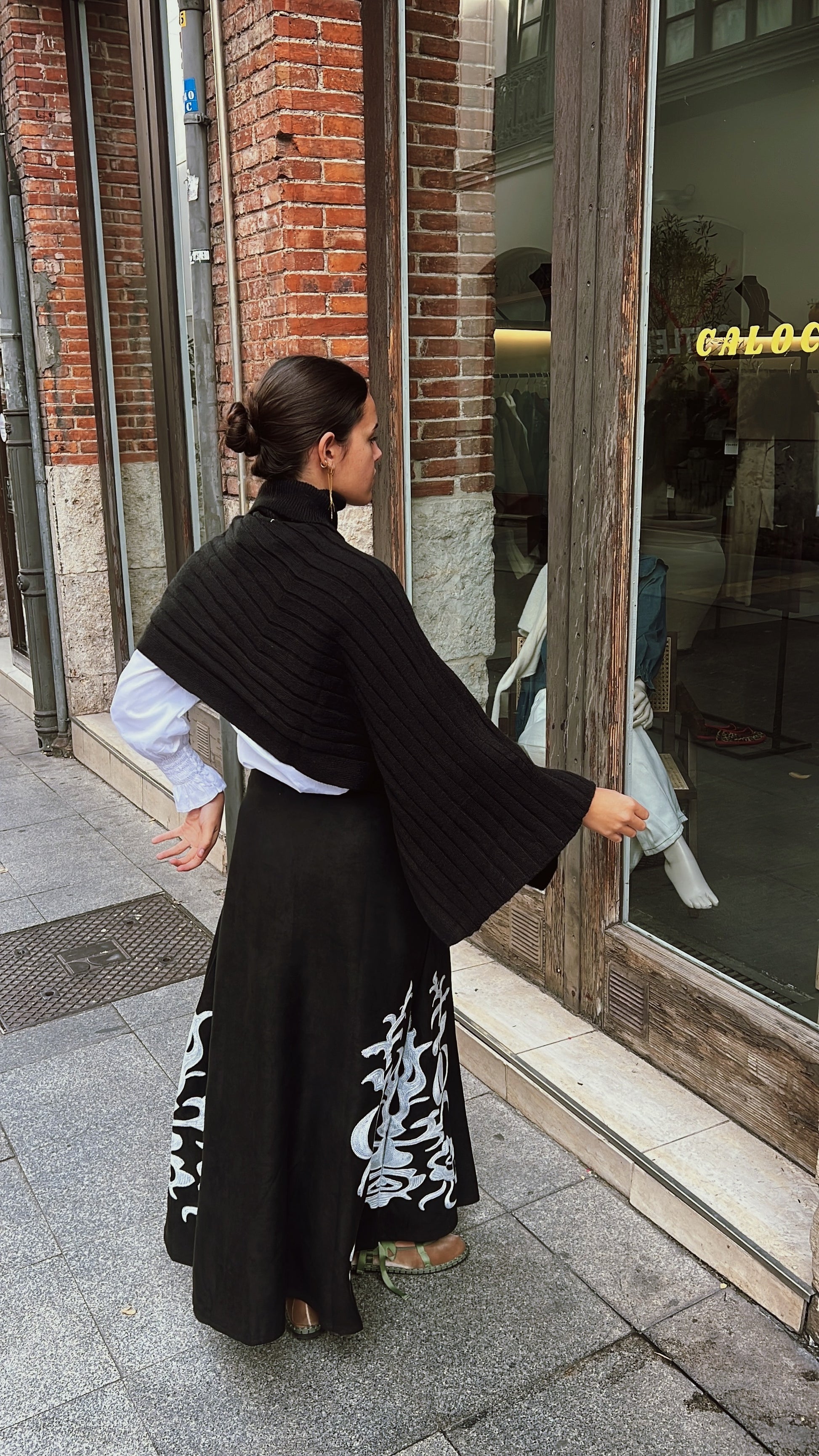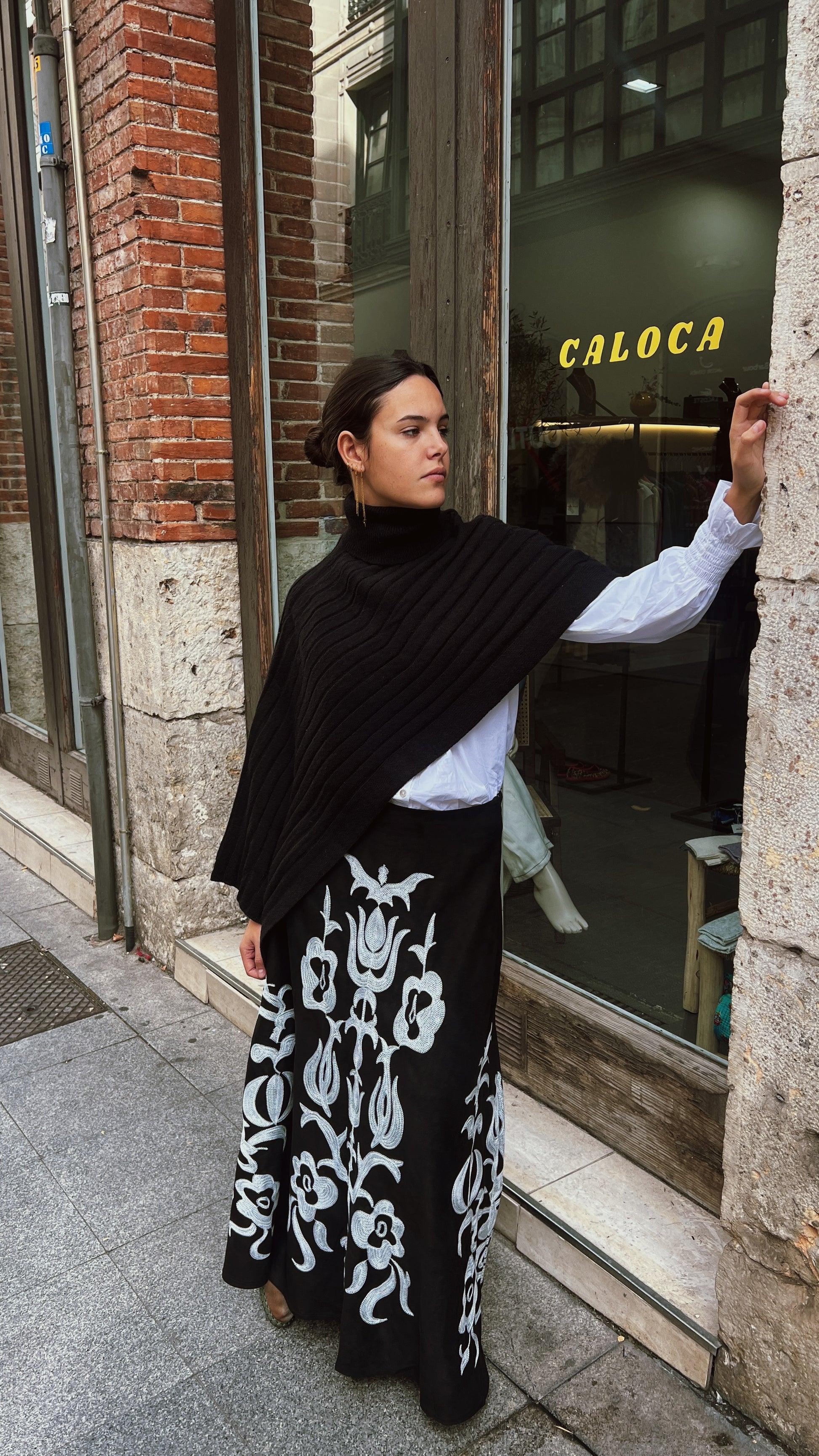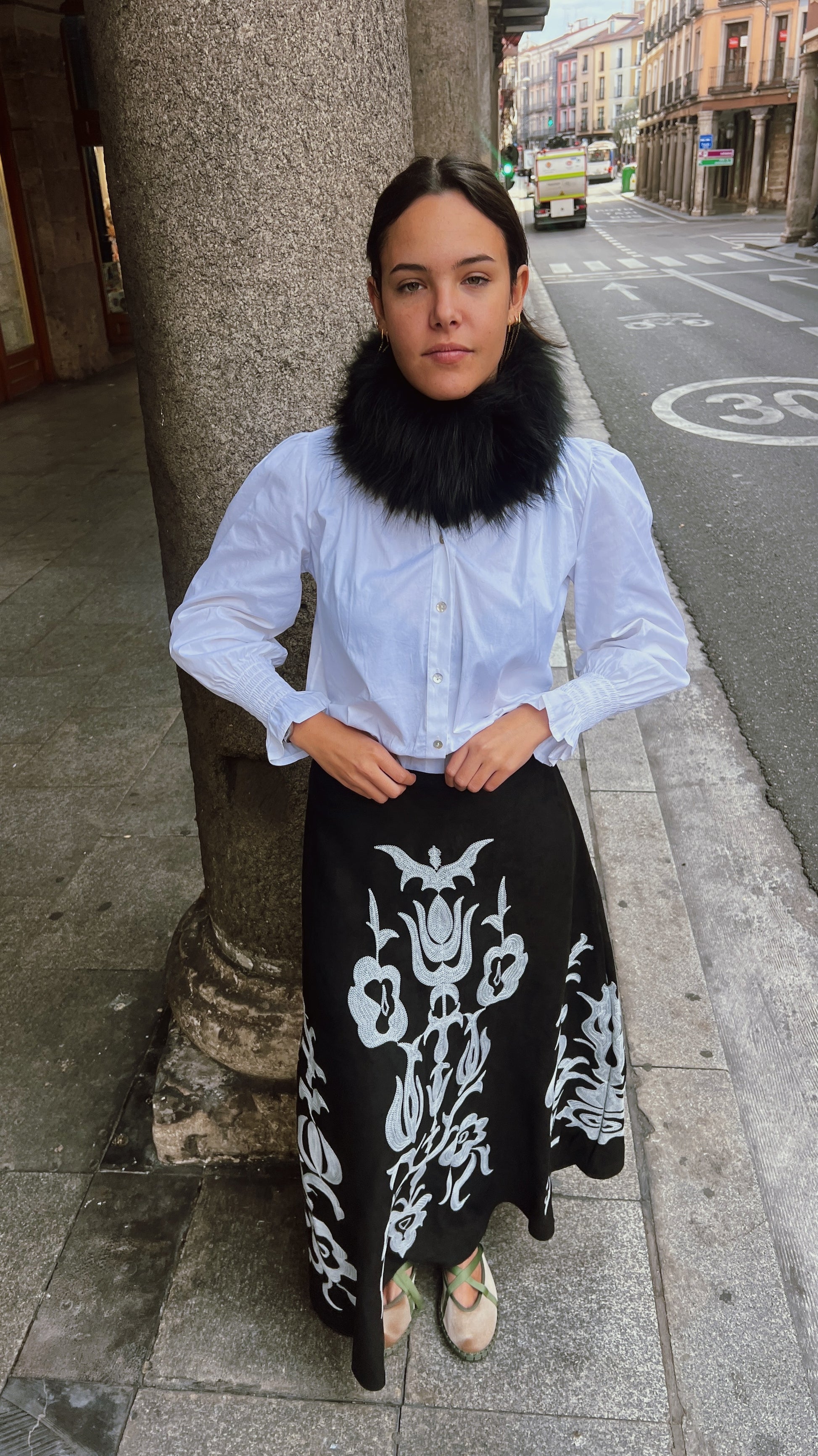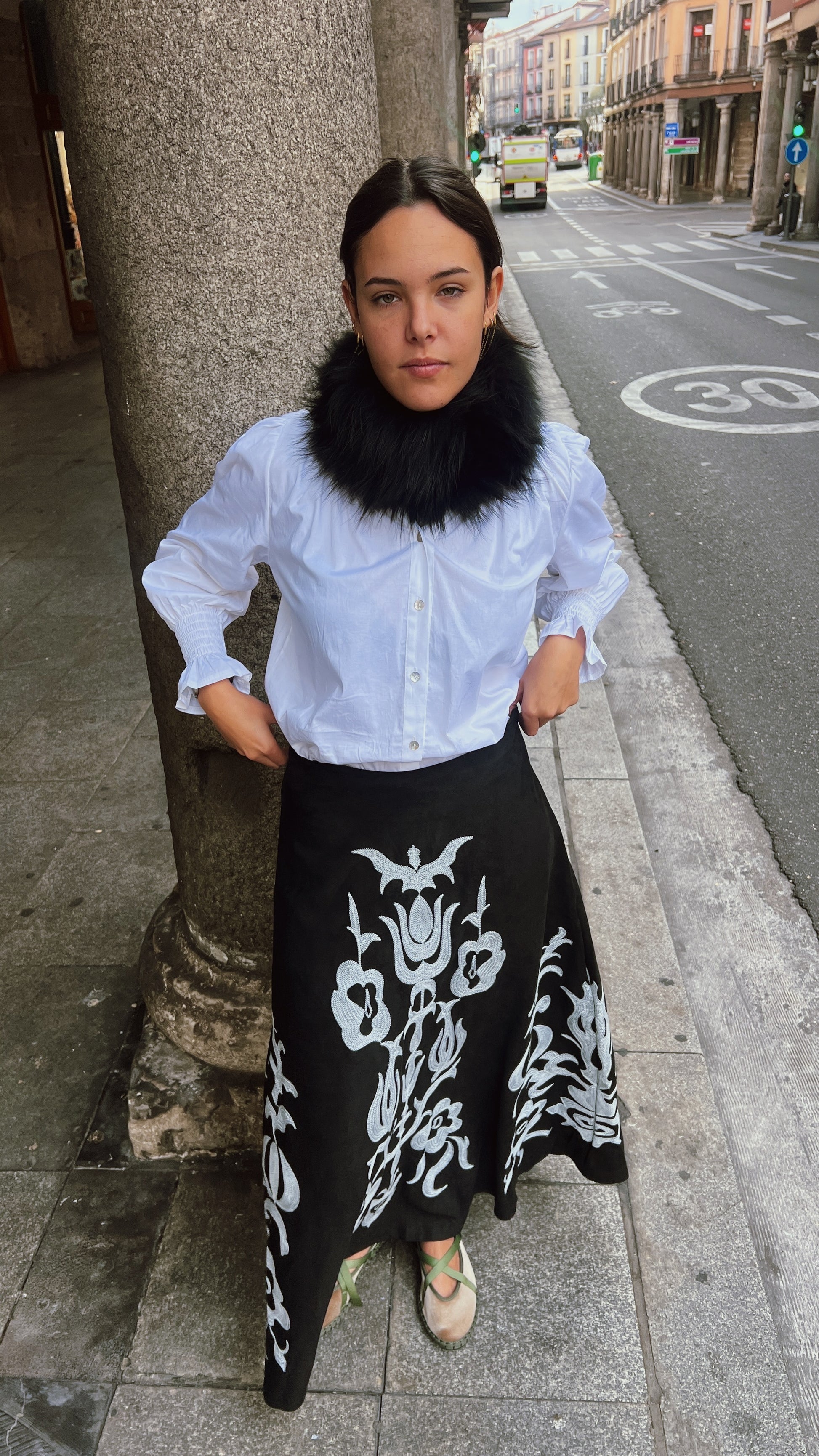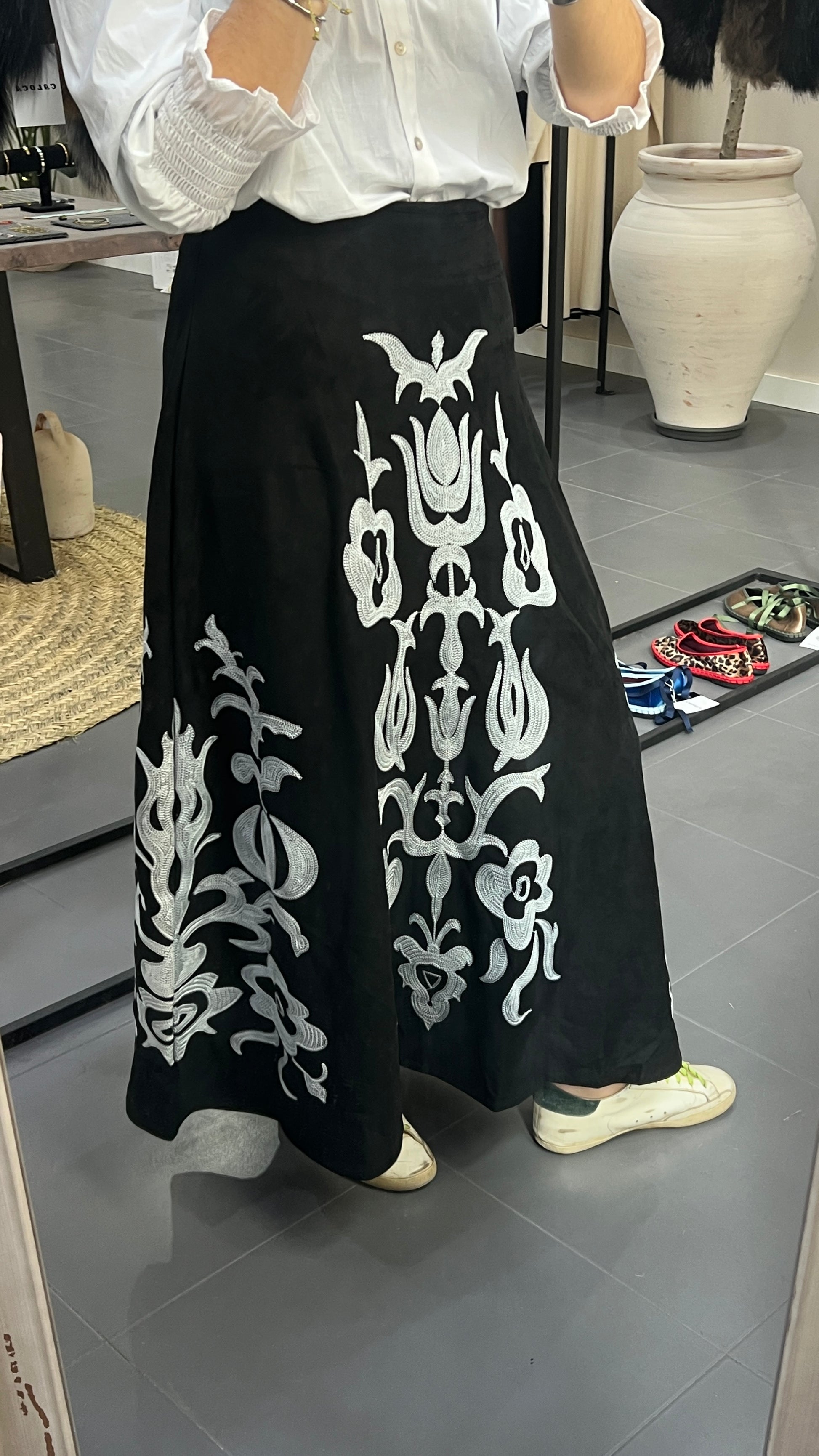 Falda larga con bordados en tonos blancos y efecto ante.