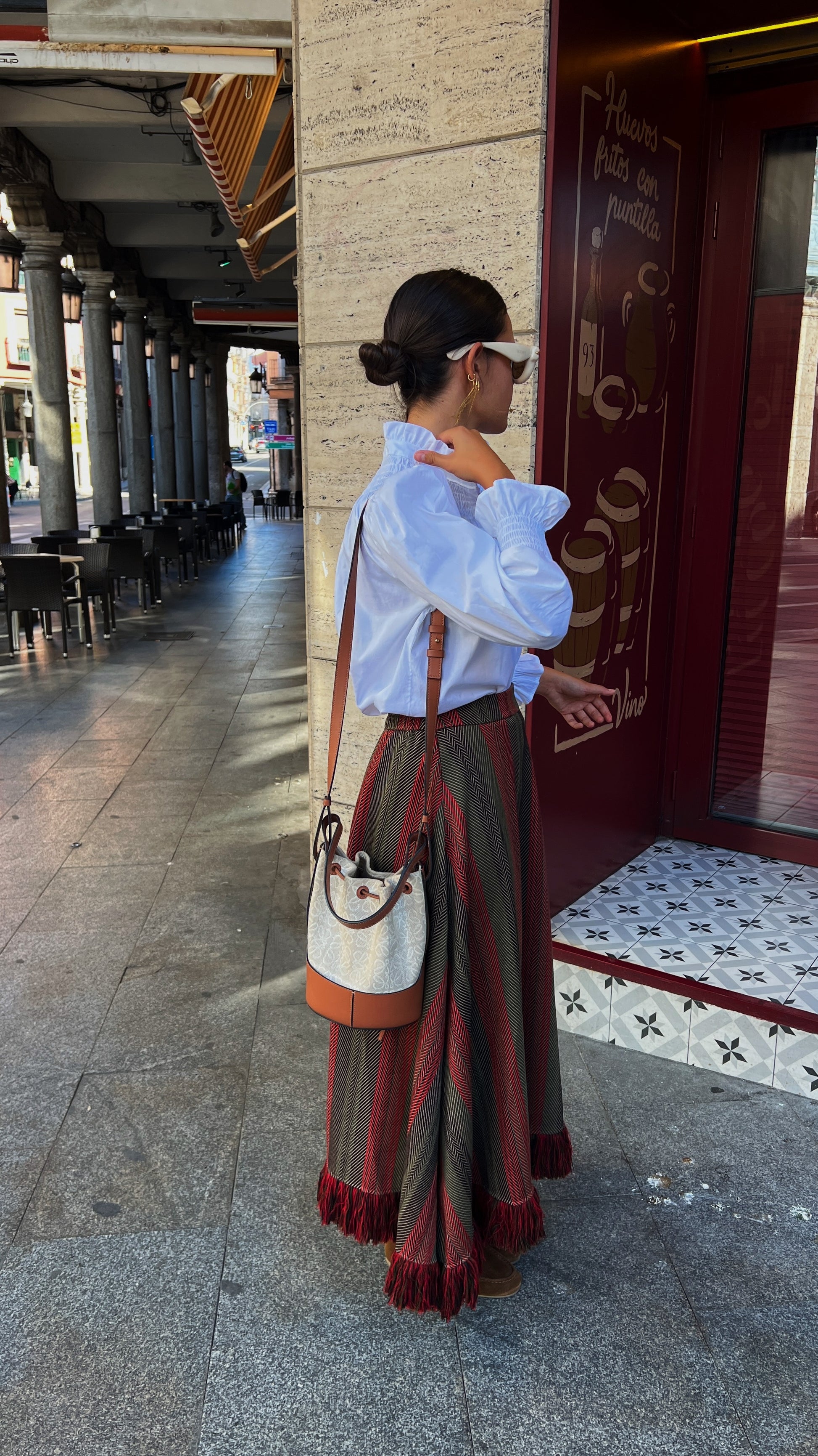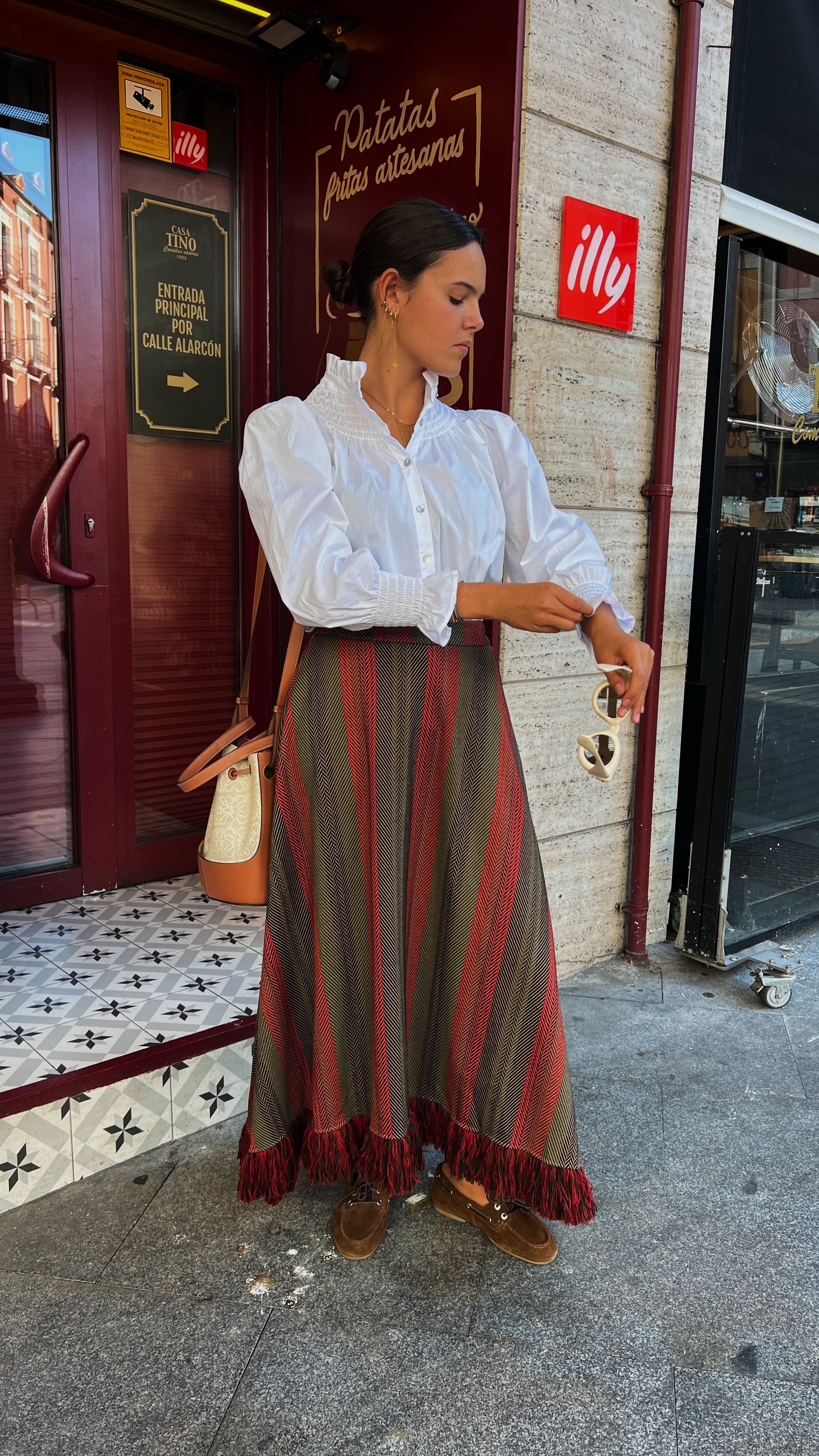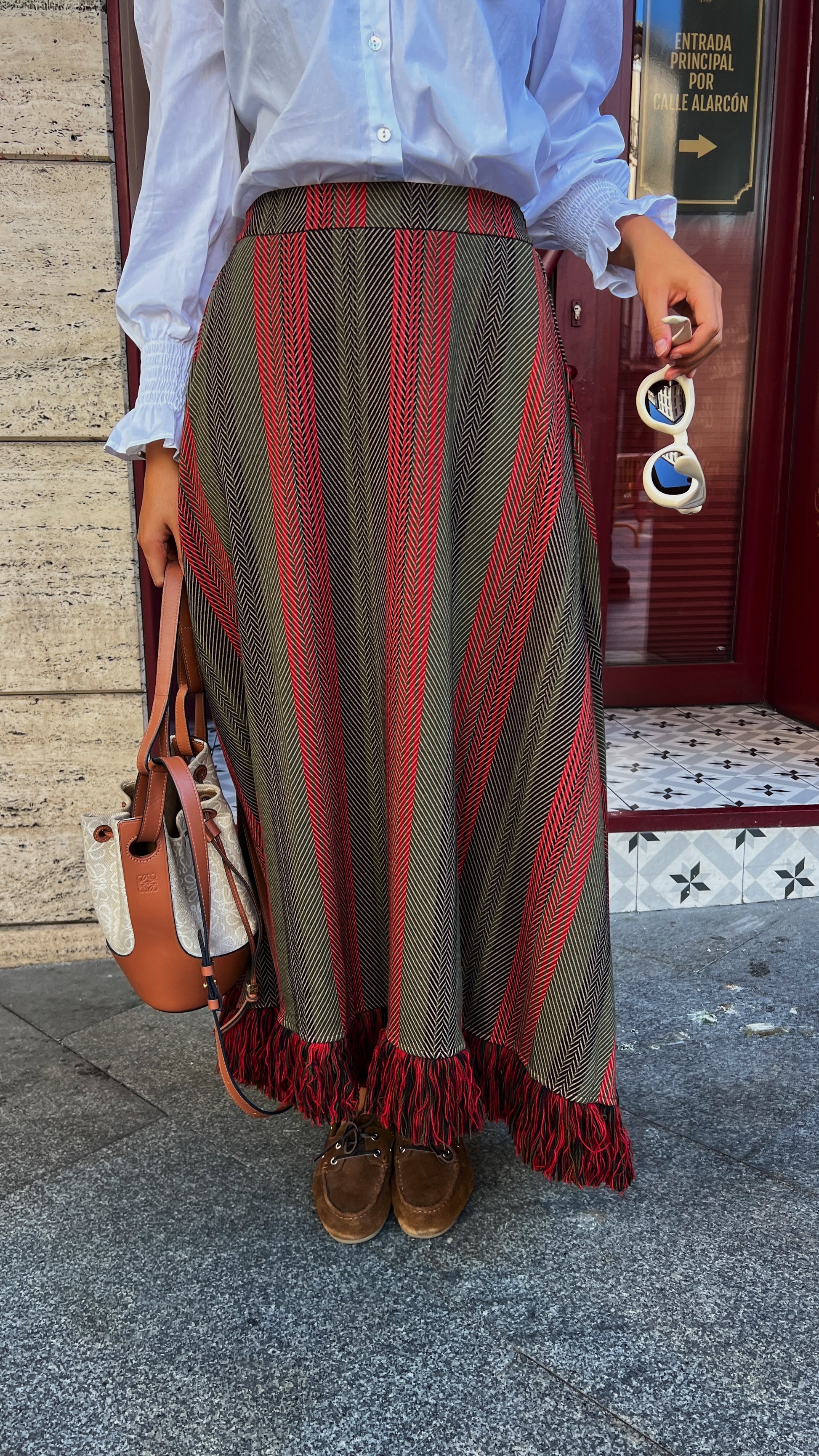 Falda larga de lana con estampado de espiga en tonos burdeos y marrones. De corte fluido y cintura alta, destaca por el detalle de flecos en el bajo que le aporta un aire artesanal y único. Perfecta para looks otoñales con personalidad. Corte evasé y elástico en la cintura, lo que hace que se ajuste perfectamente a la talla.