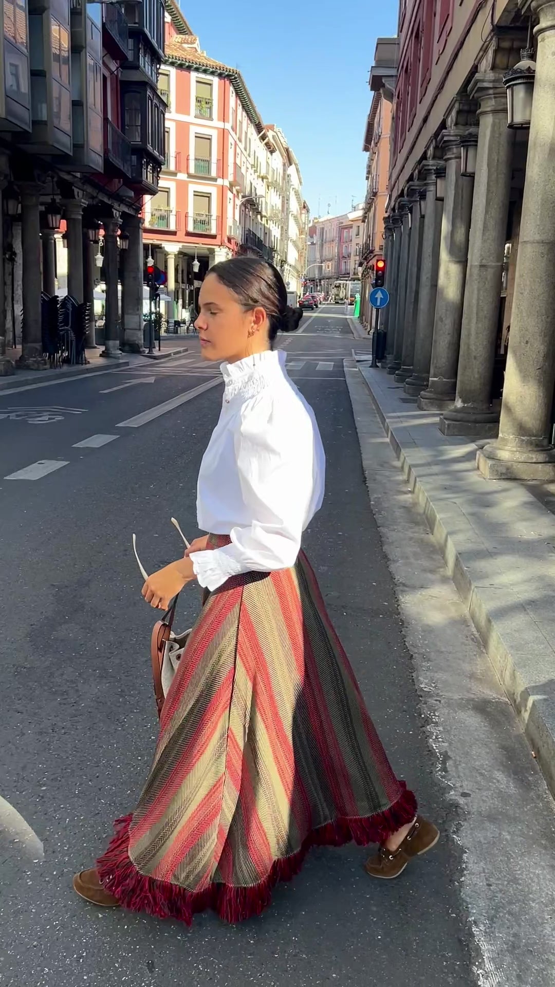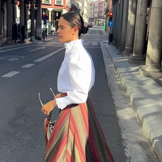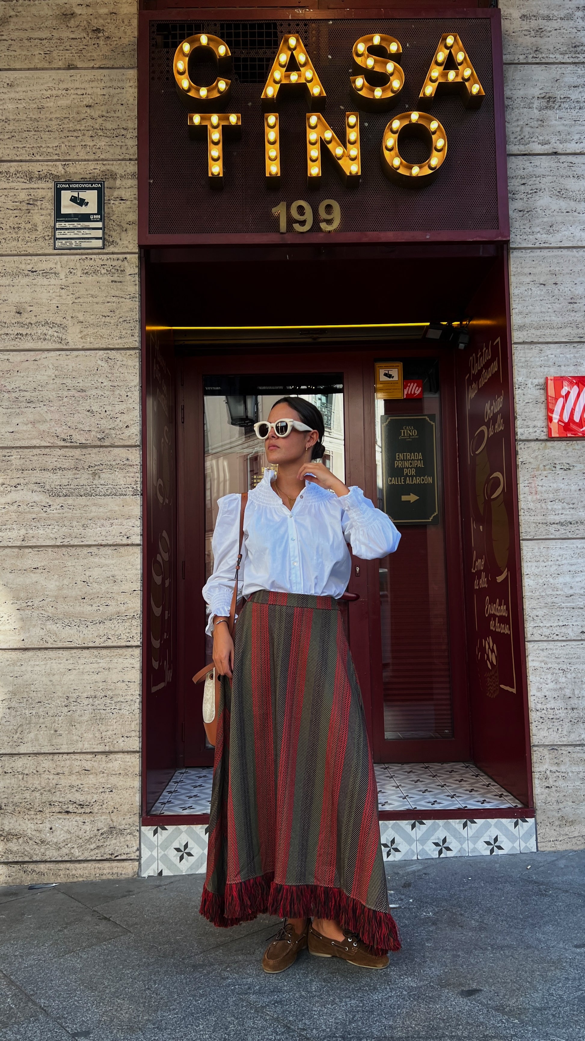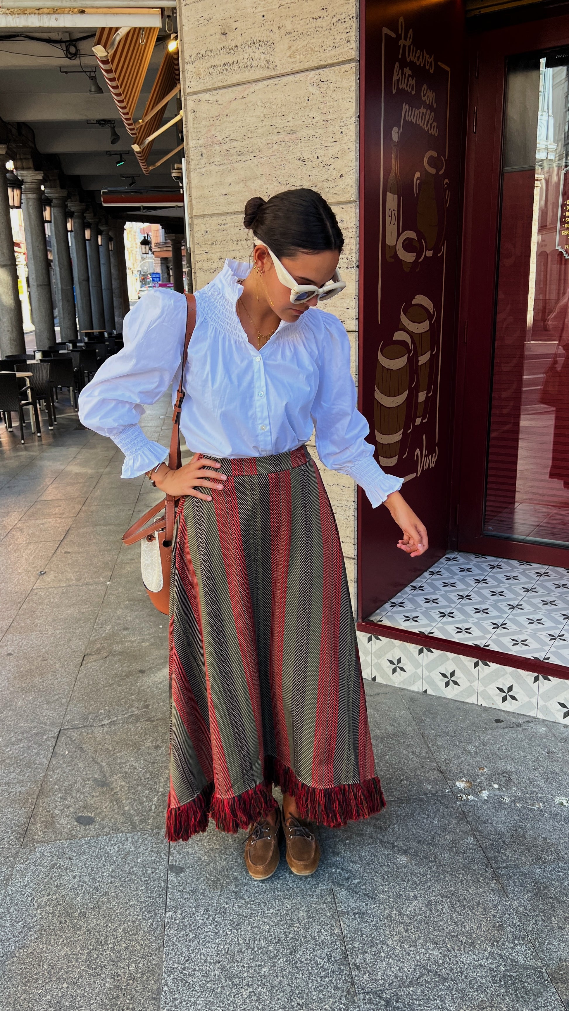 Falda larga de lana con estampado de espiga en tonos burdeos y marrones. De corte fluido y cintura alta, destaca por el detalle de flecos en el bajo que le aporta un aire artesanal y único. Perfecta para looks otoñales con personalidad. Corte evasé y elástico en la cintura, lo que hace que se ajuste perfectamente a la talla.