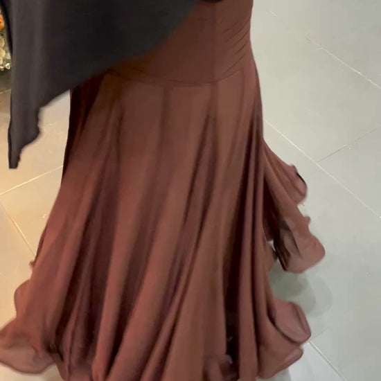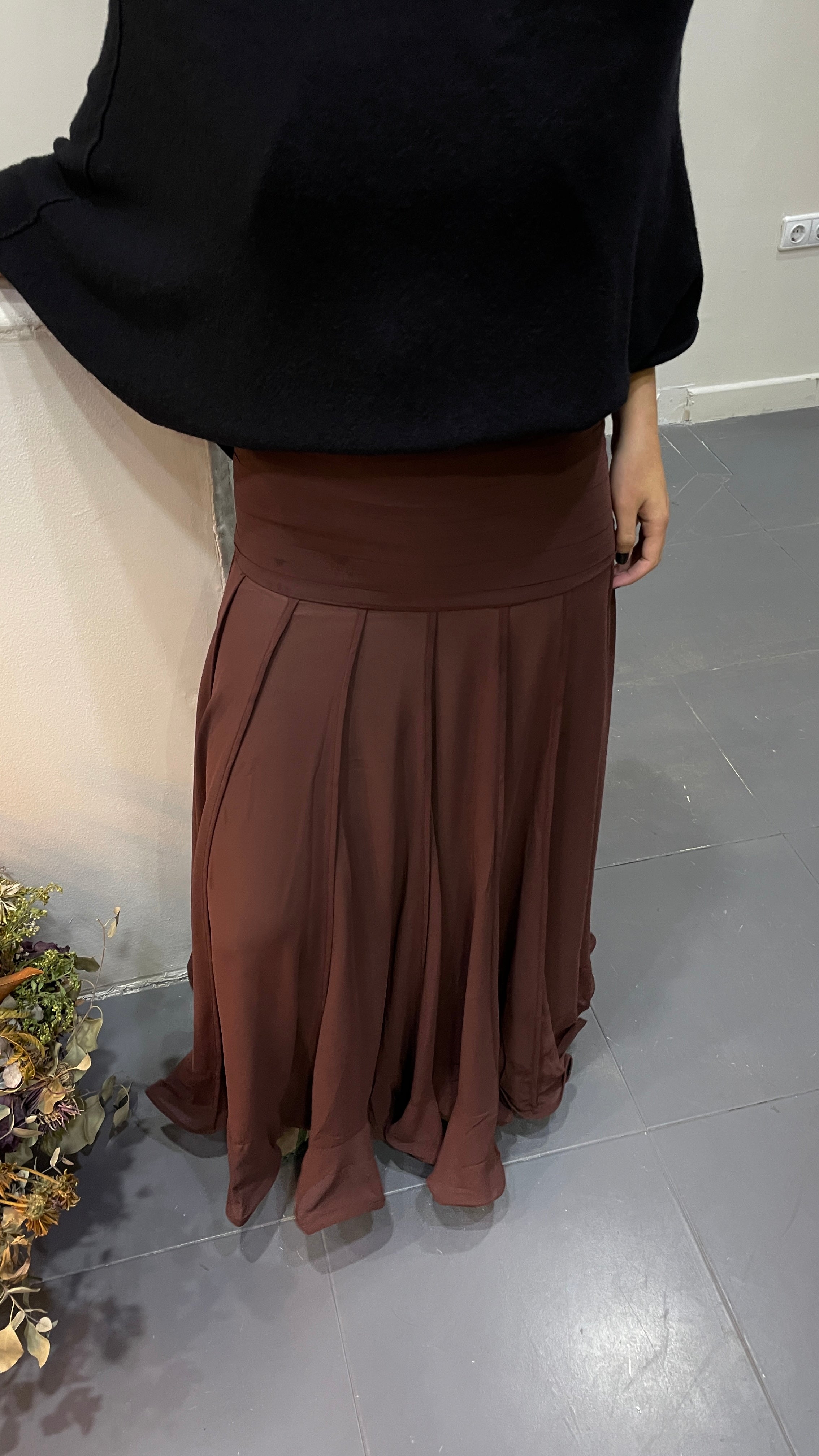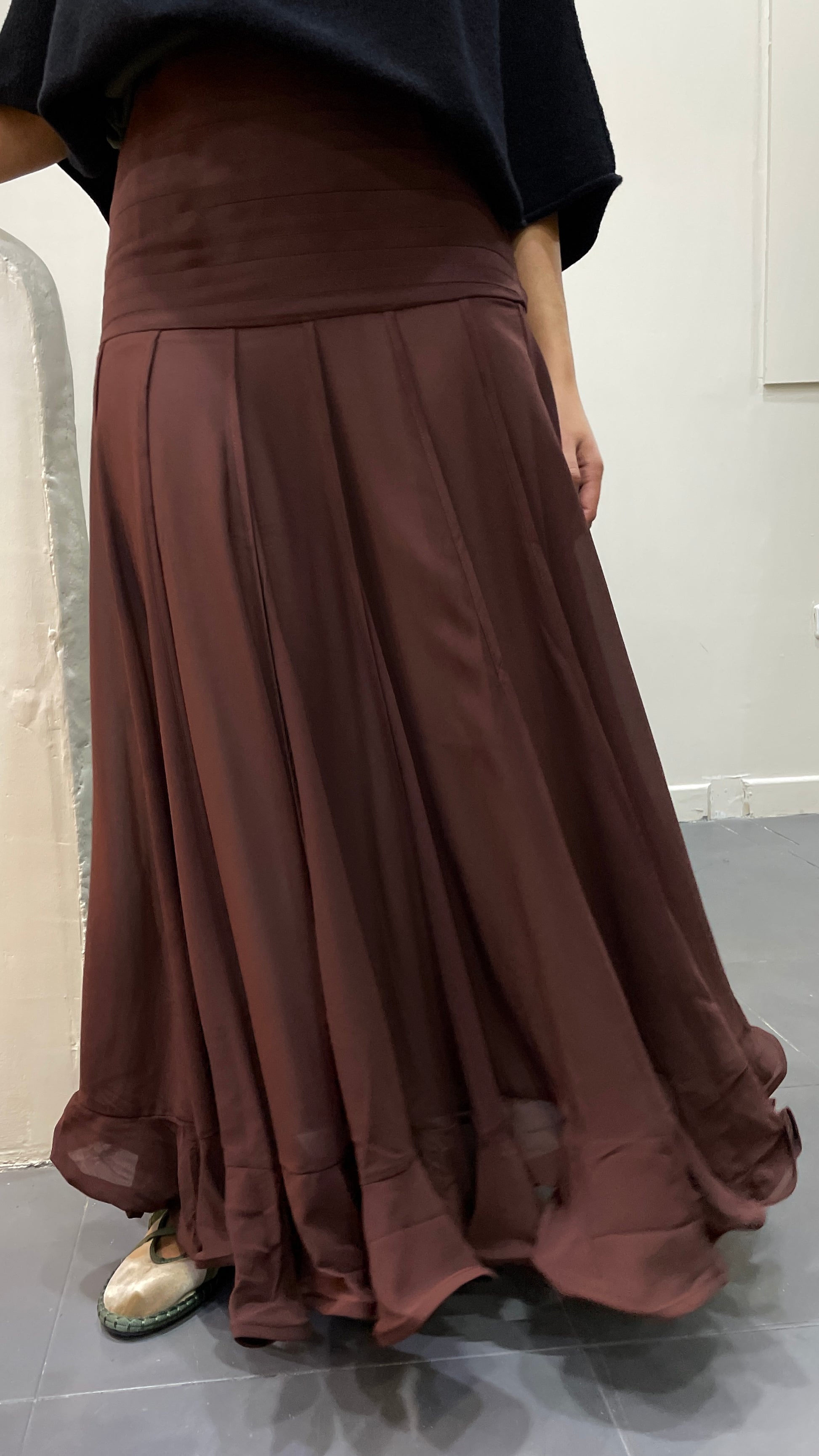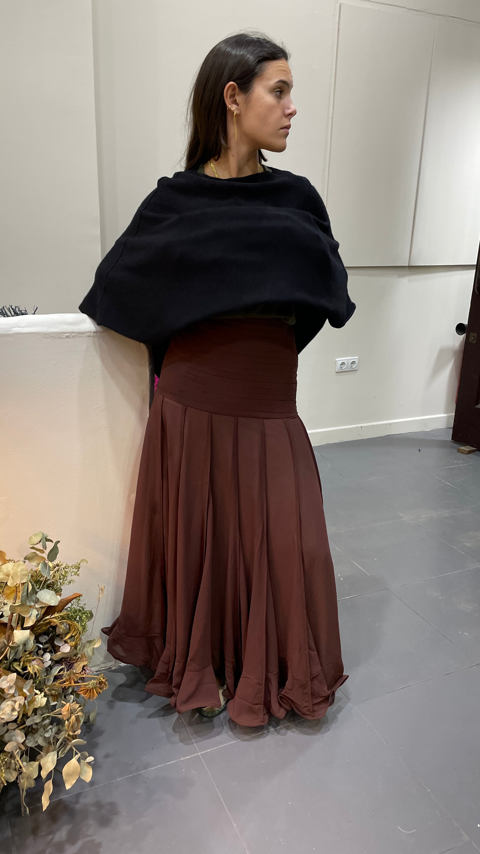 Falda caldera confeccionada en tul con un fajin de tiro alto del que salen tablas que acompañan el largo de la falda. con fuerte en el bajo que hace acentúa el movimiento y la frescura de la falda.