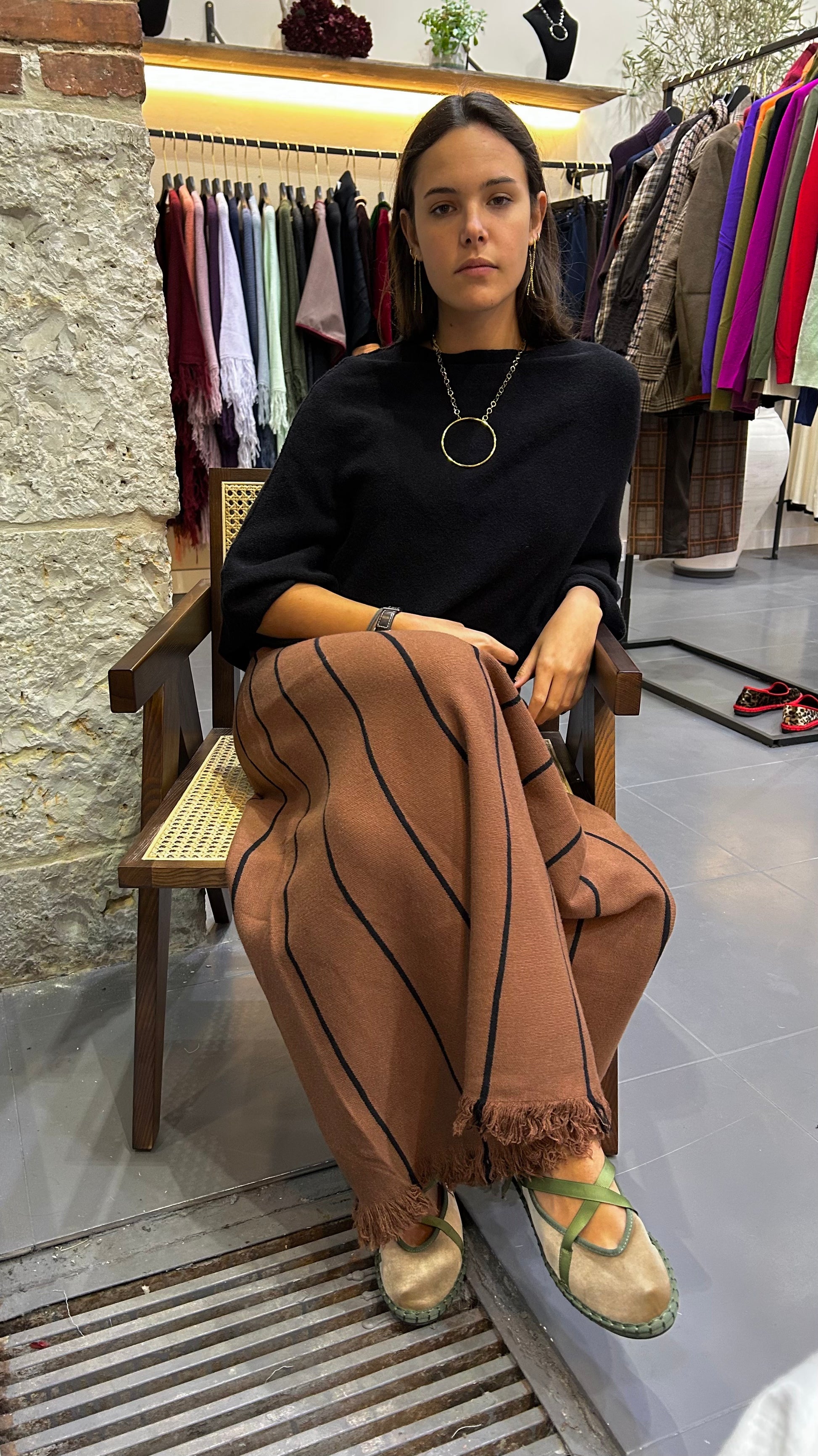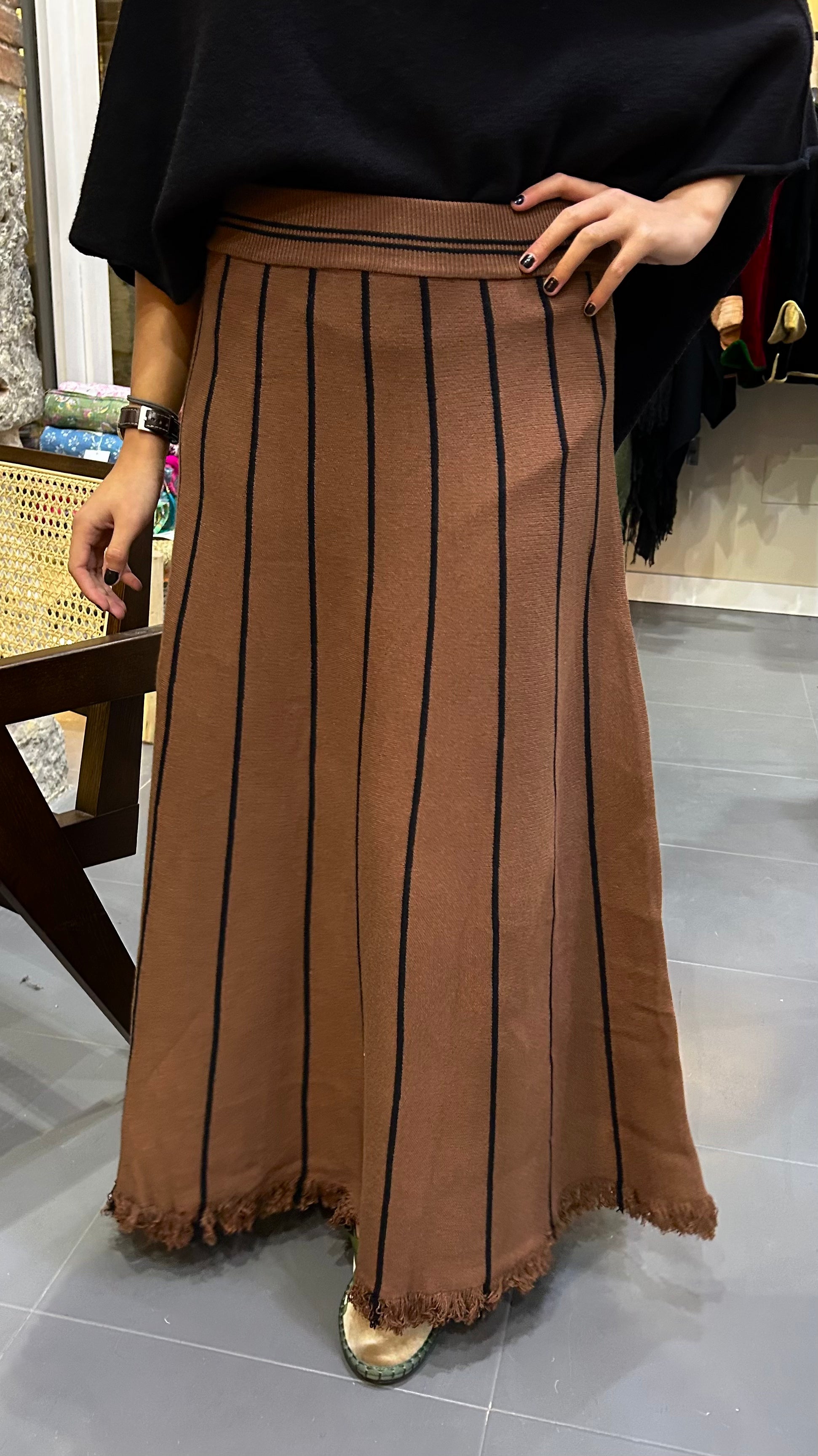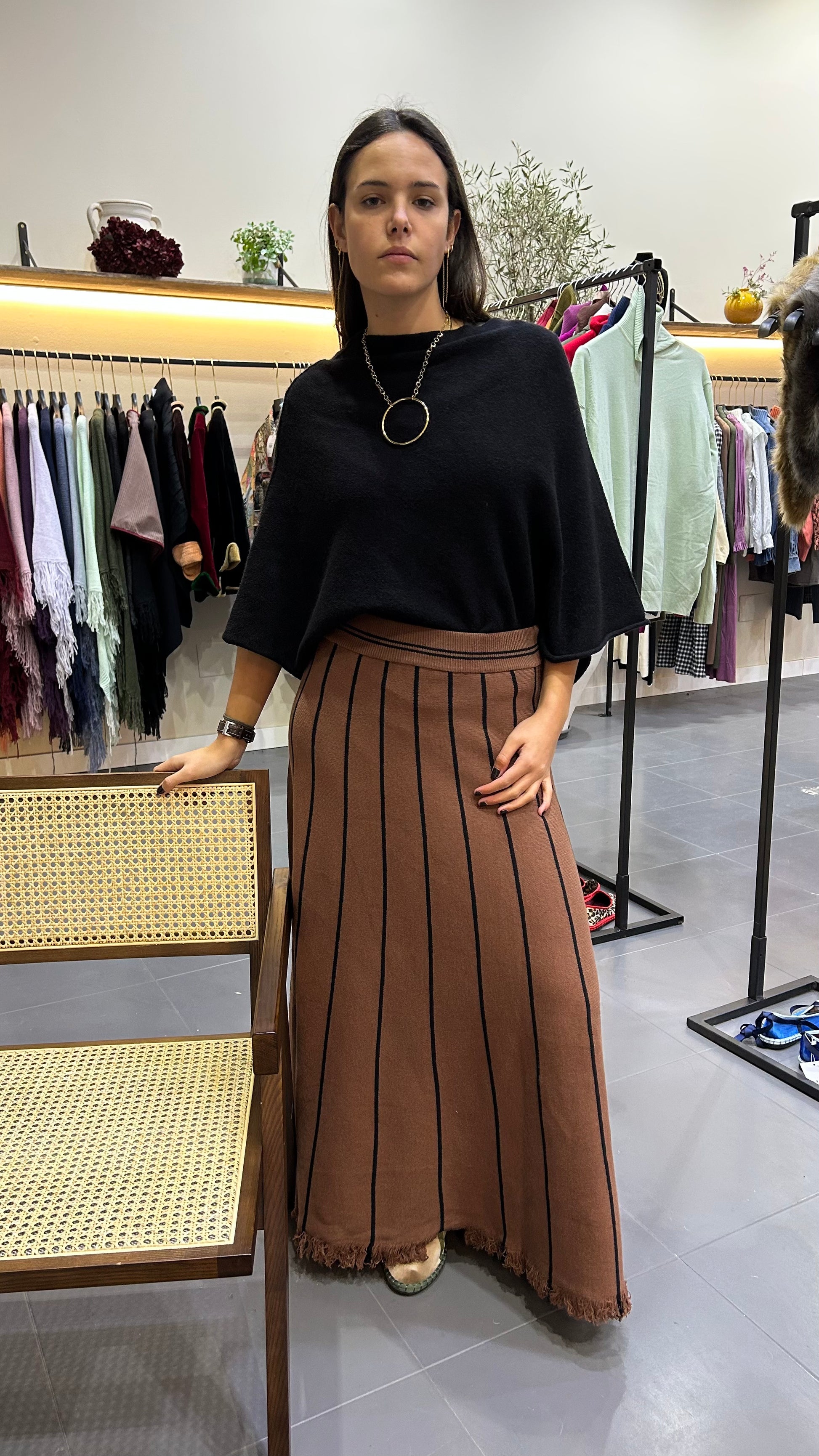 Falda de punto con corte evasé, confeccionada en un punto muy rico y calentito, con rayas verticales en tonos negros y un acabado de flecos cortitos en el bajo.