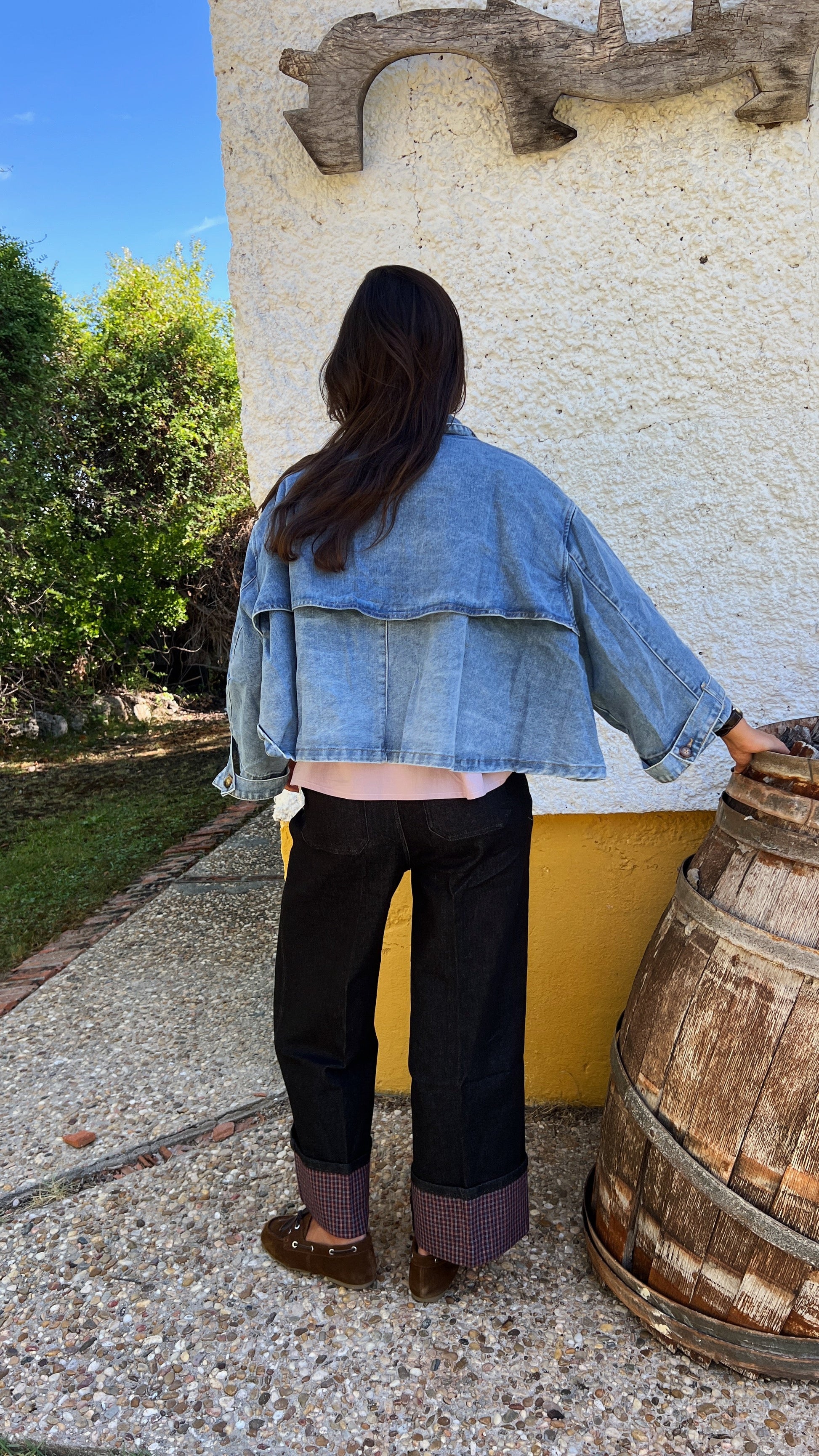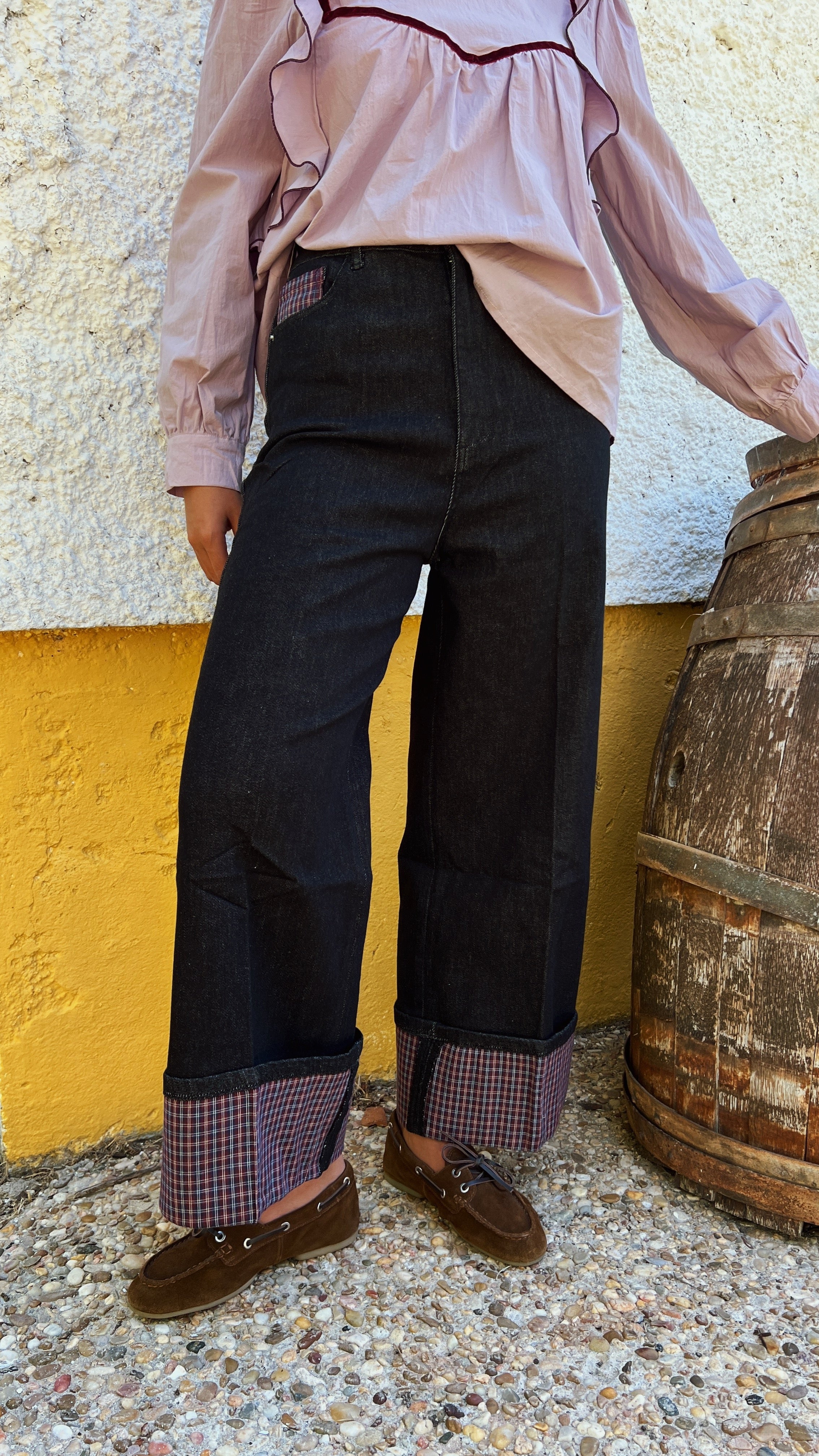 Pantalón denim tiro alto con diseño recto y bajo vuelto, con detalle de tejido interior estampado, contrastando así con el azul oscuro.