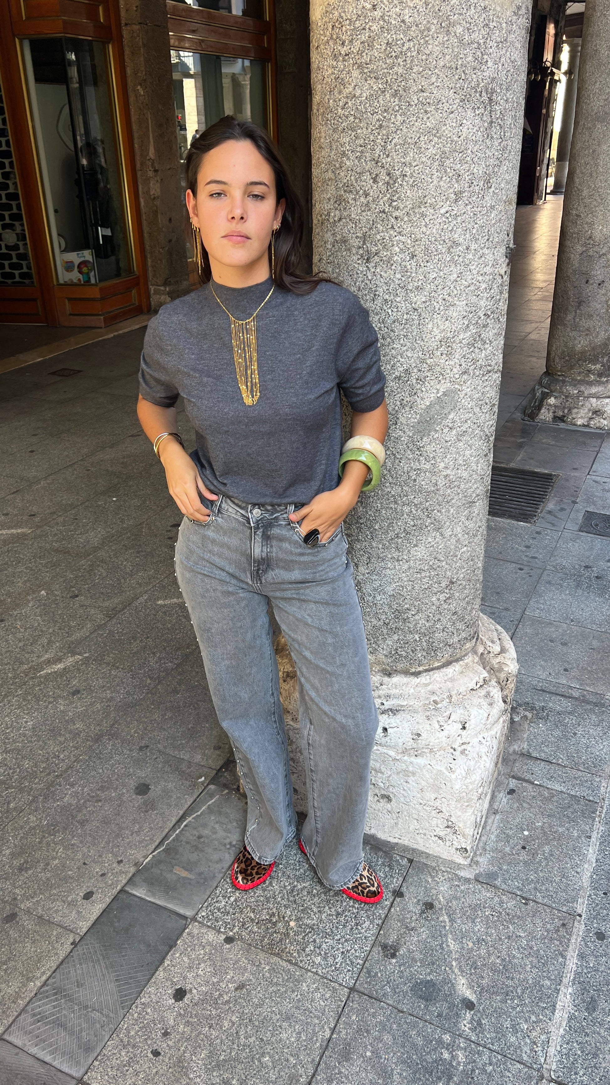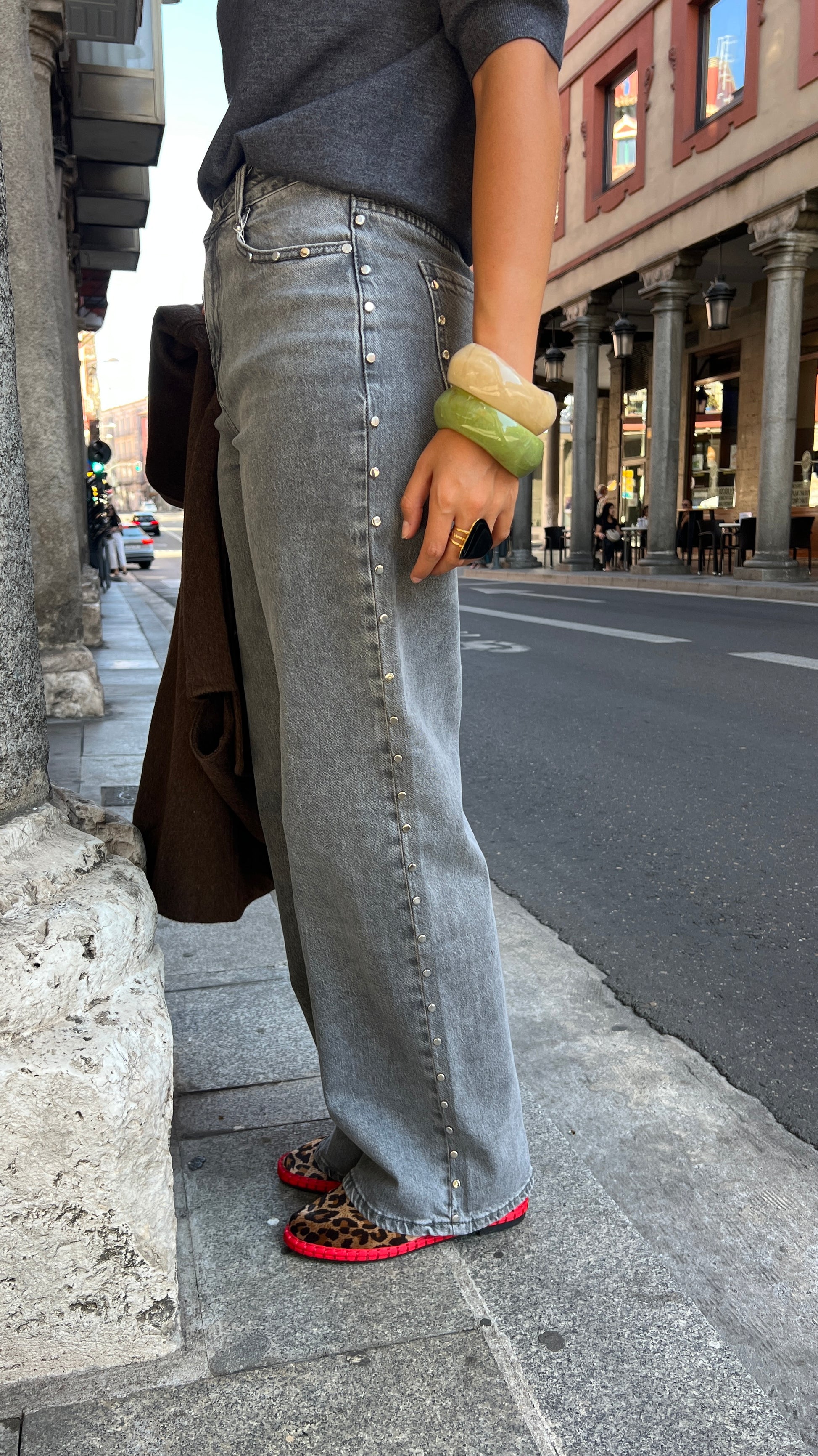 Pantalones vaqueros rectos con tachuelas en los laterales y bolsillos.