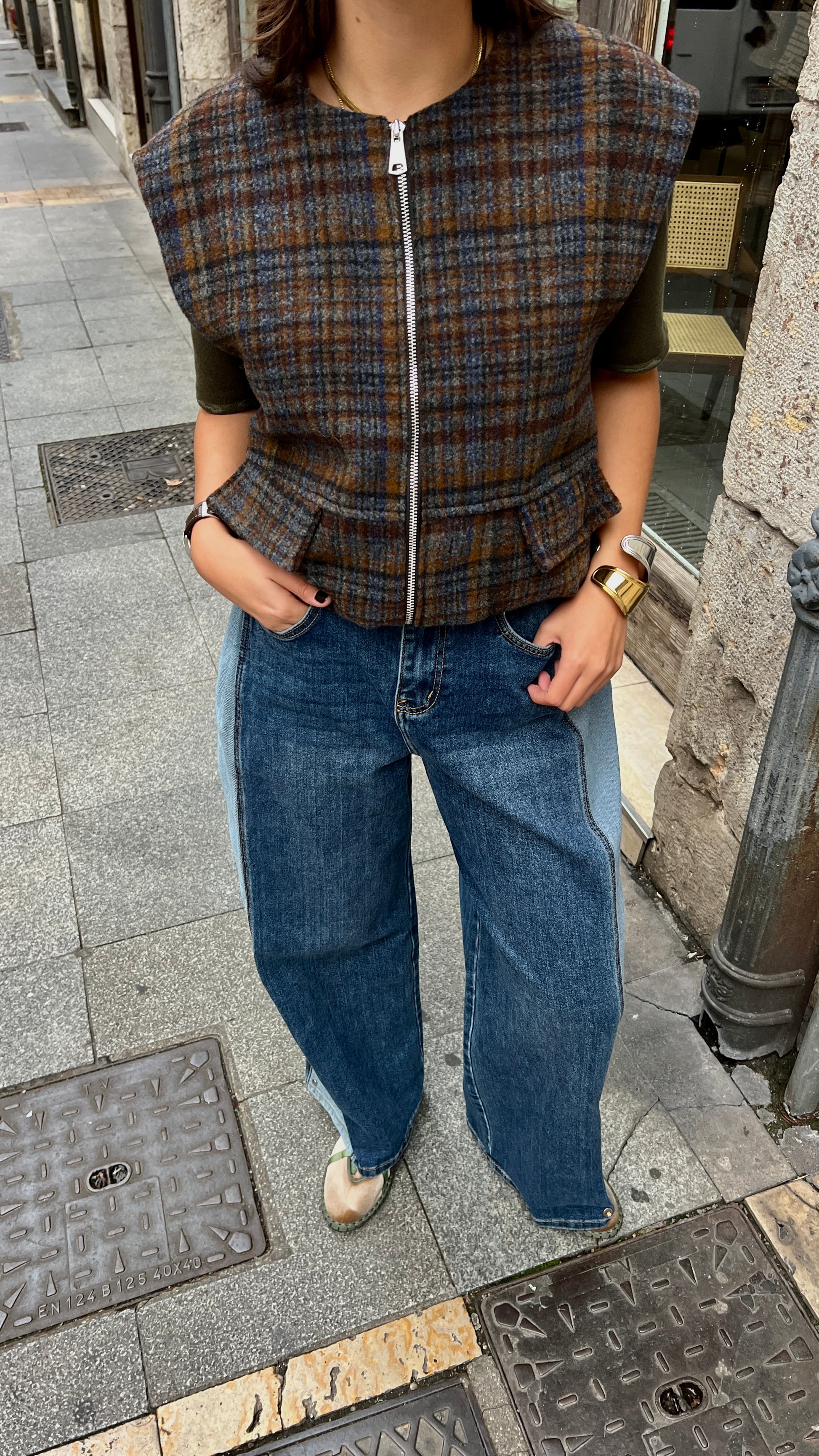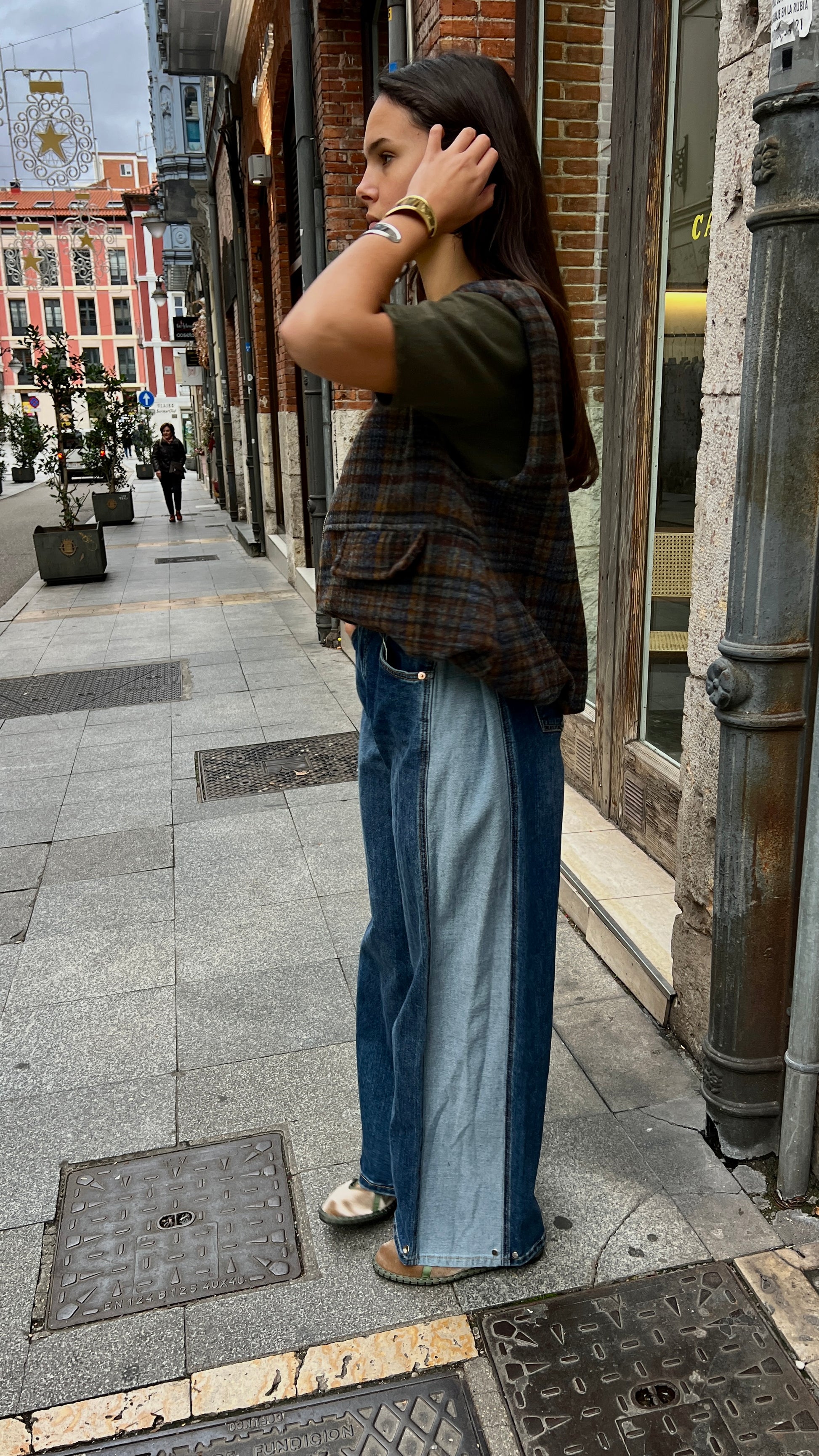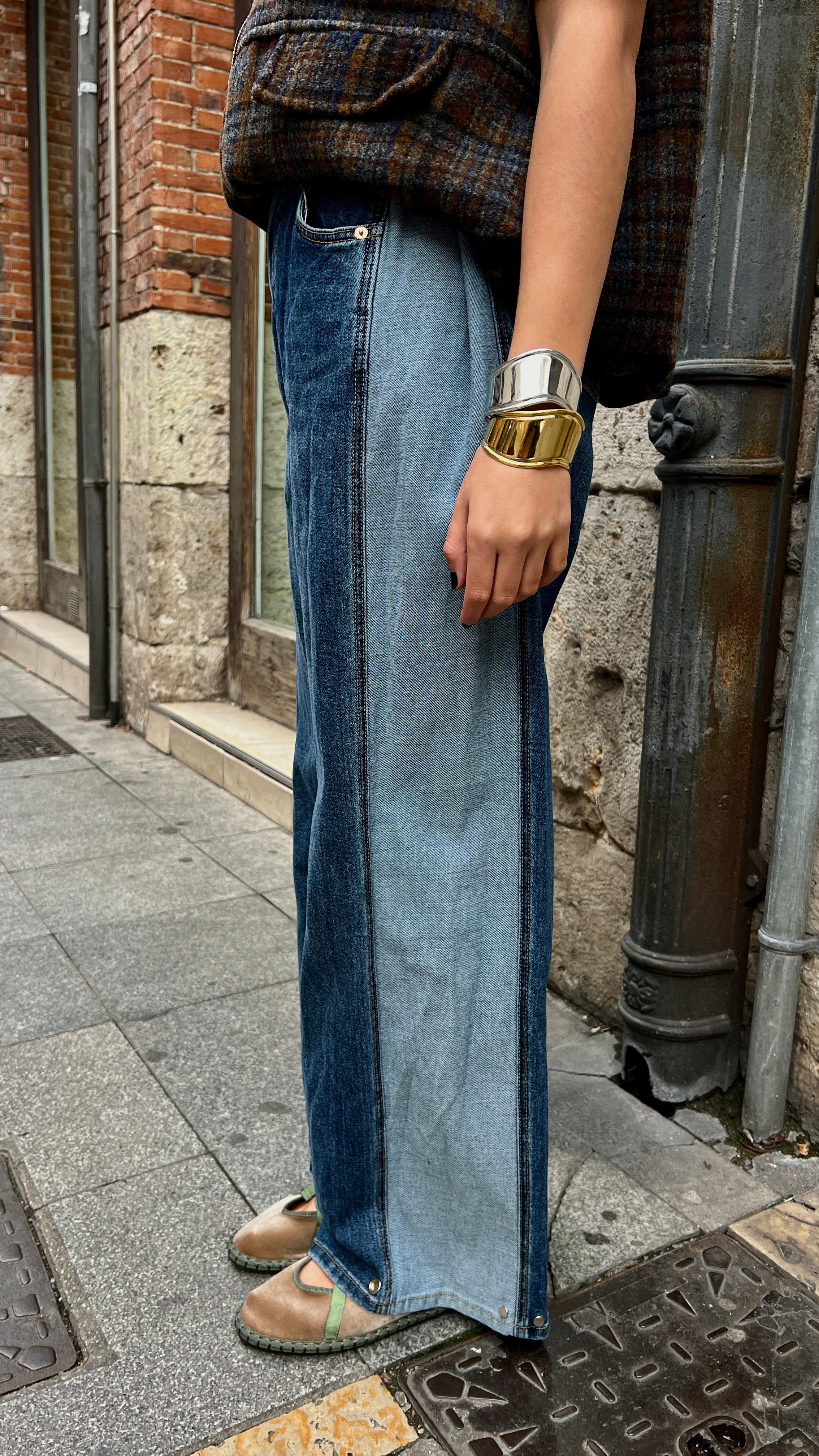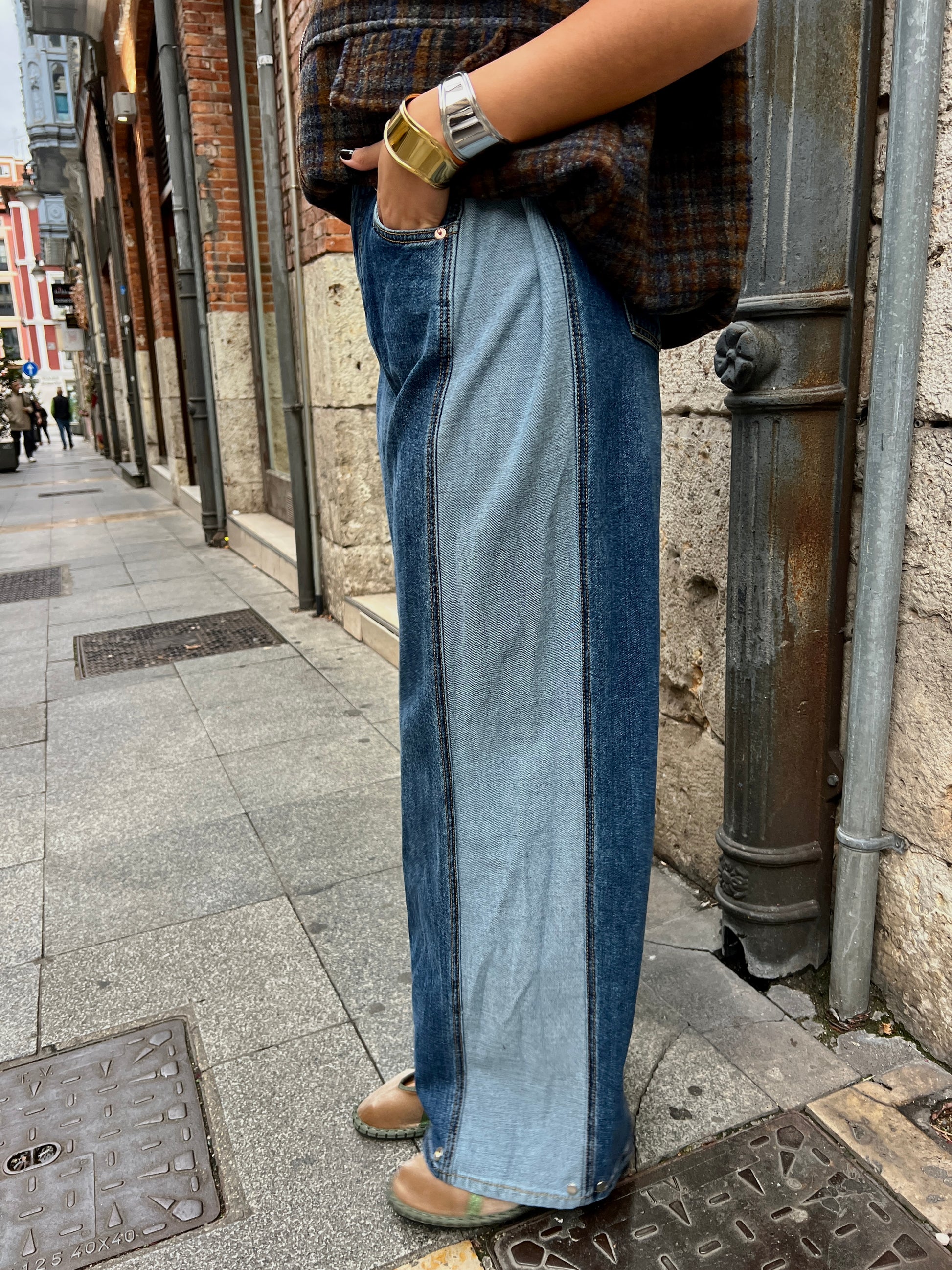 Jeans bi color, Tiro medio, tallan bien, recomendamos seleccionar la talla que suelas usar. Con detalle de tono más clarito en los laterales que se puede disimular con un botón que le hemos puesto en el final de la parte exterior lateral de cada pierna, cerradno este el pantalón cambia su forma a tipo globo.