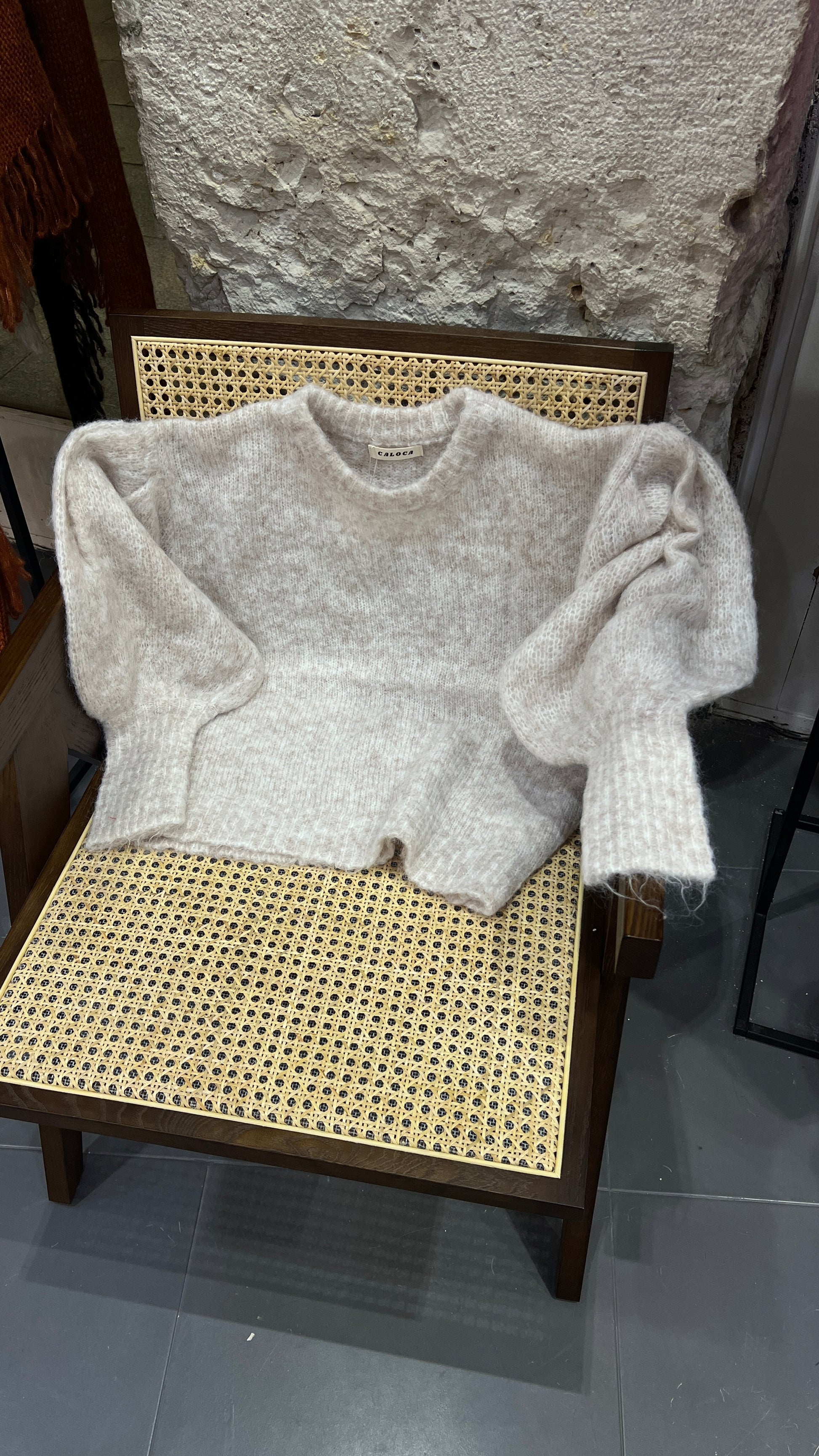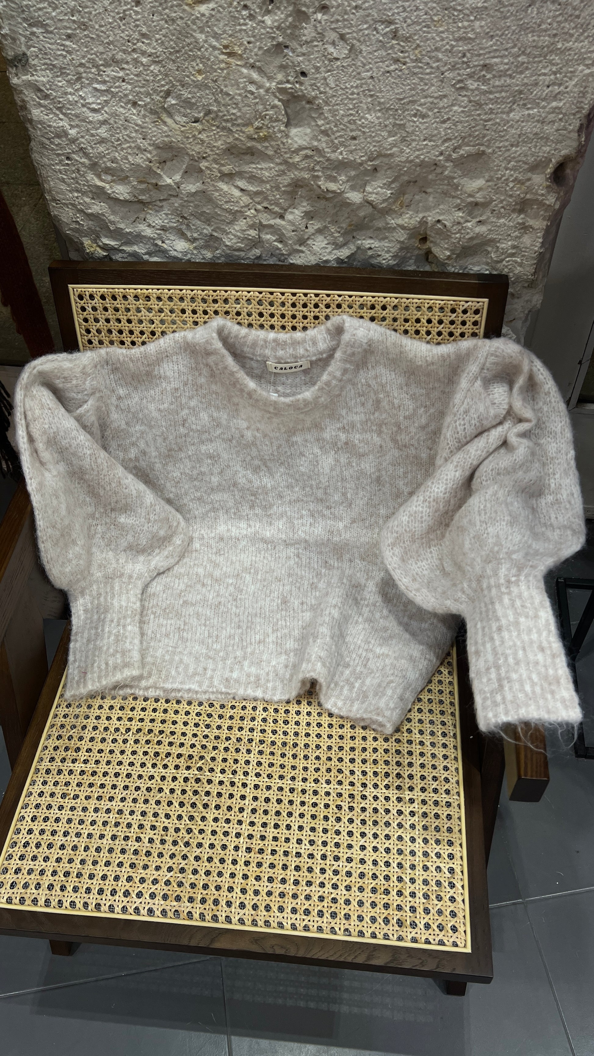 Jersey cuello redondo confeccionado en un punto muy calentito y suave con mangas abullonadas.