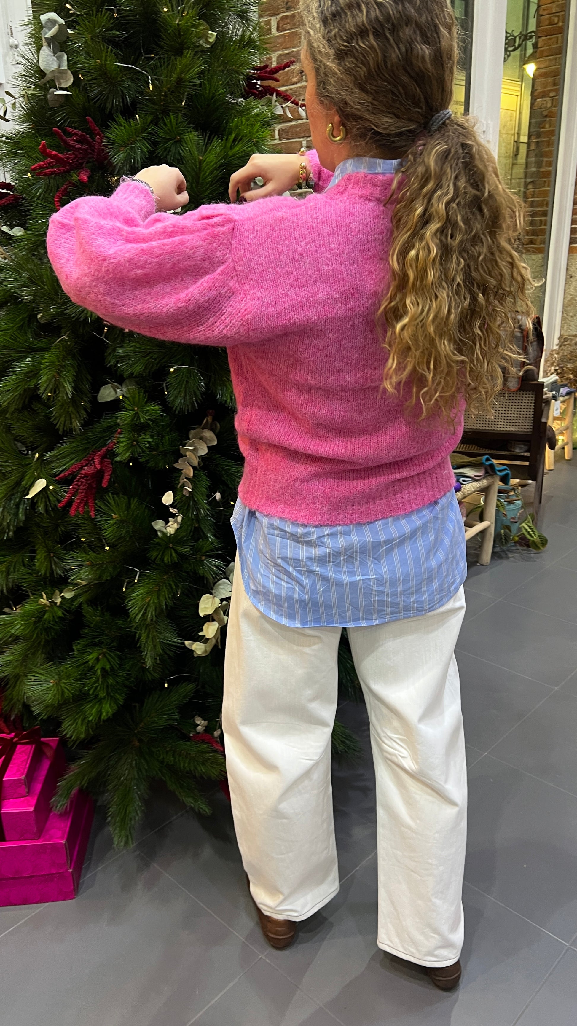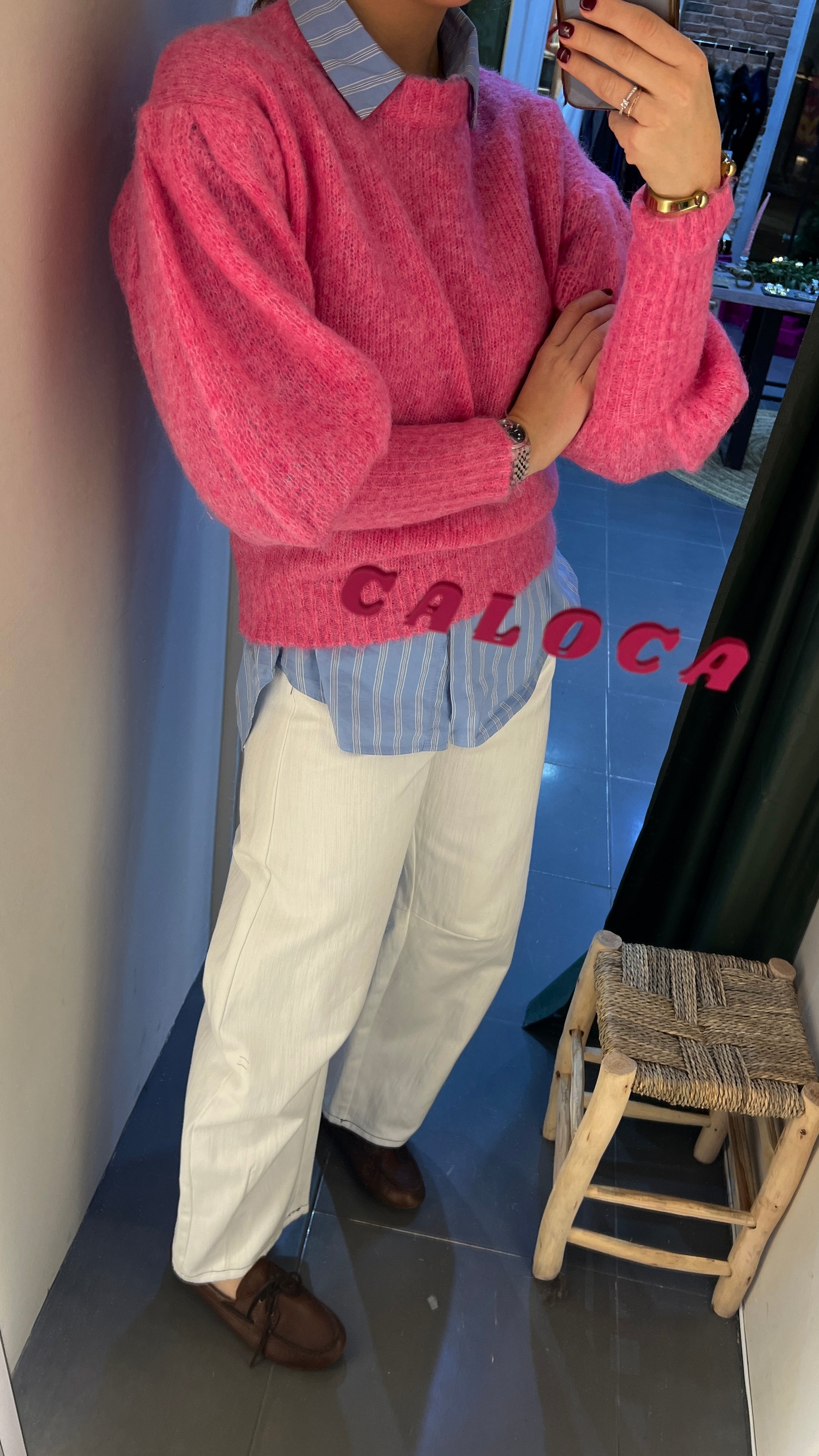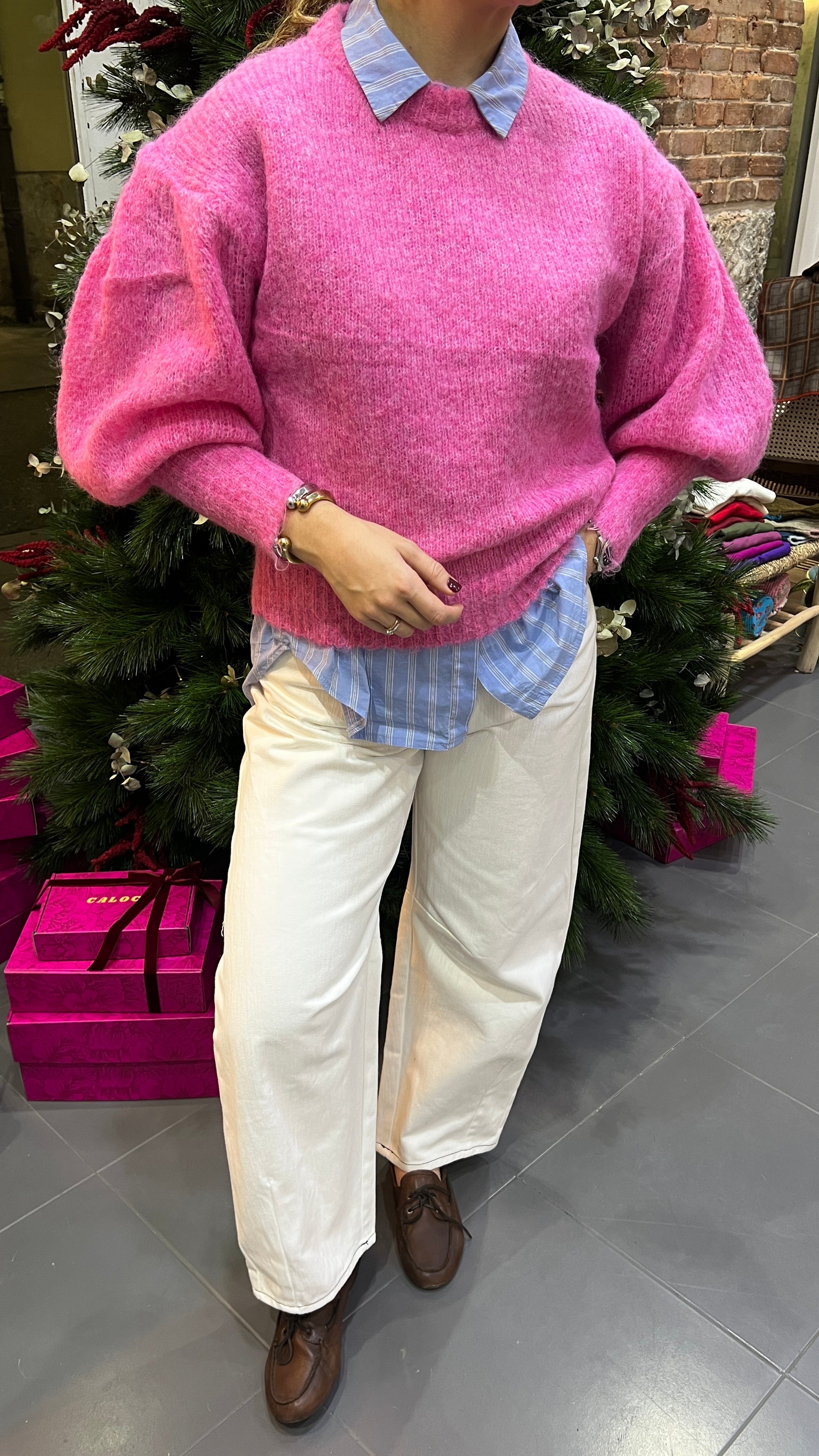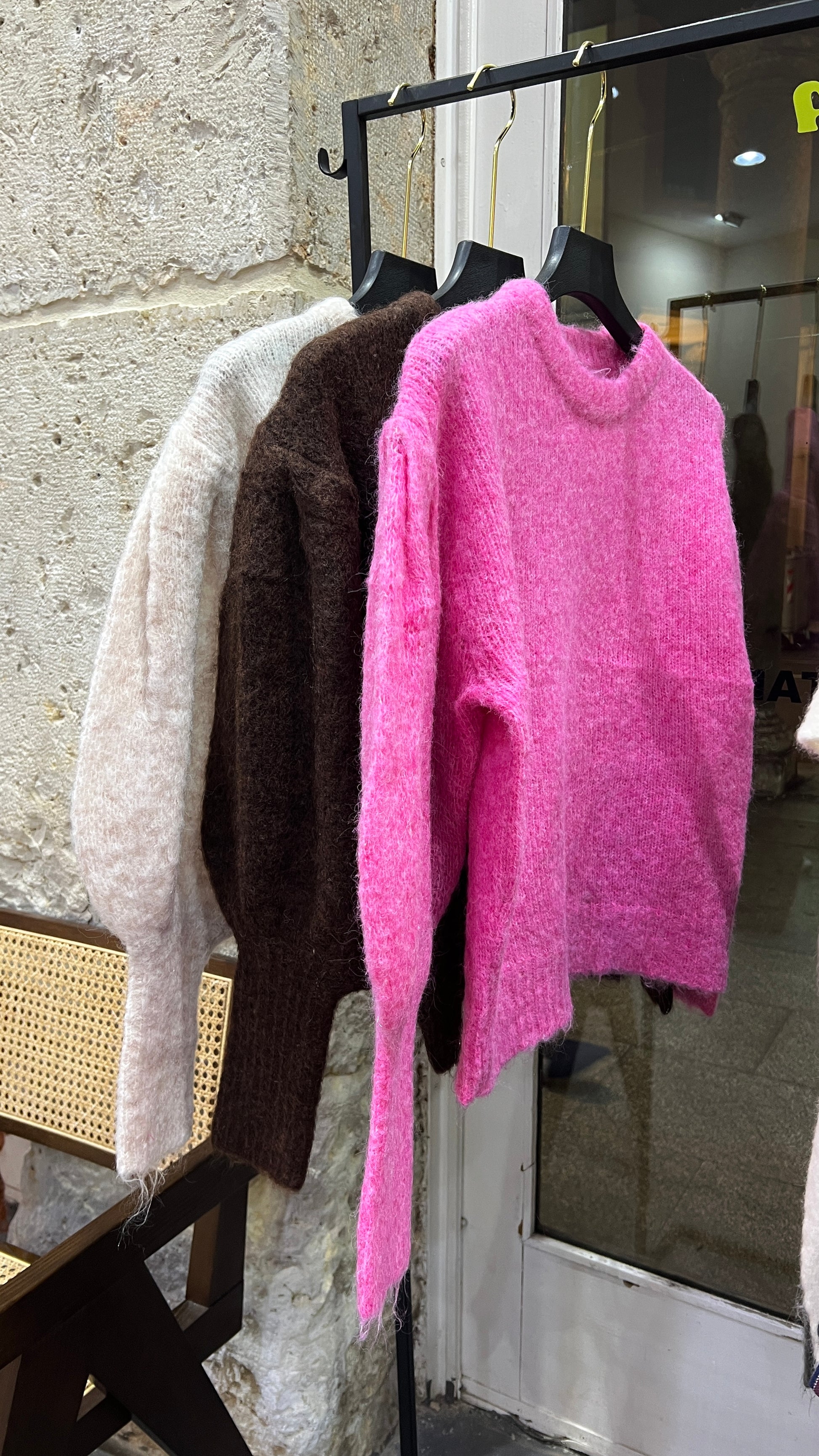 Jersey cuello redondo confeccionado en un punto muy calentito y suave con mangas abullonadas.