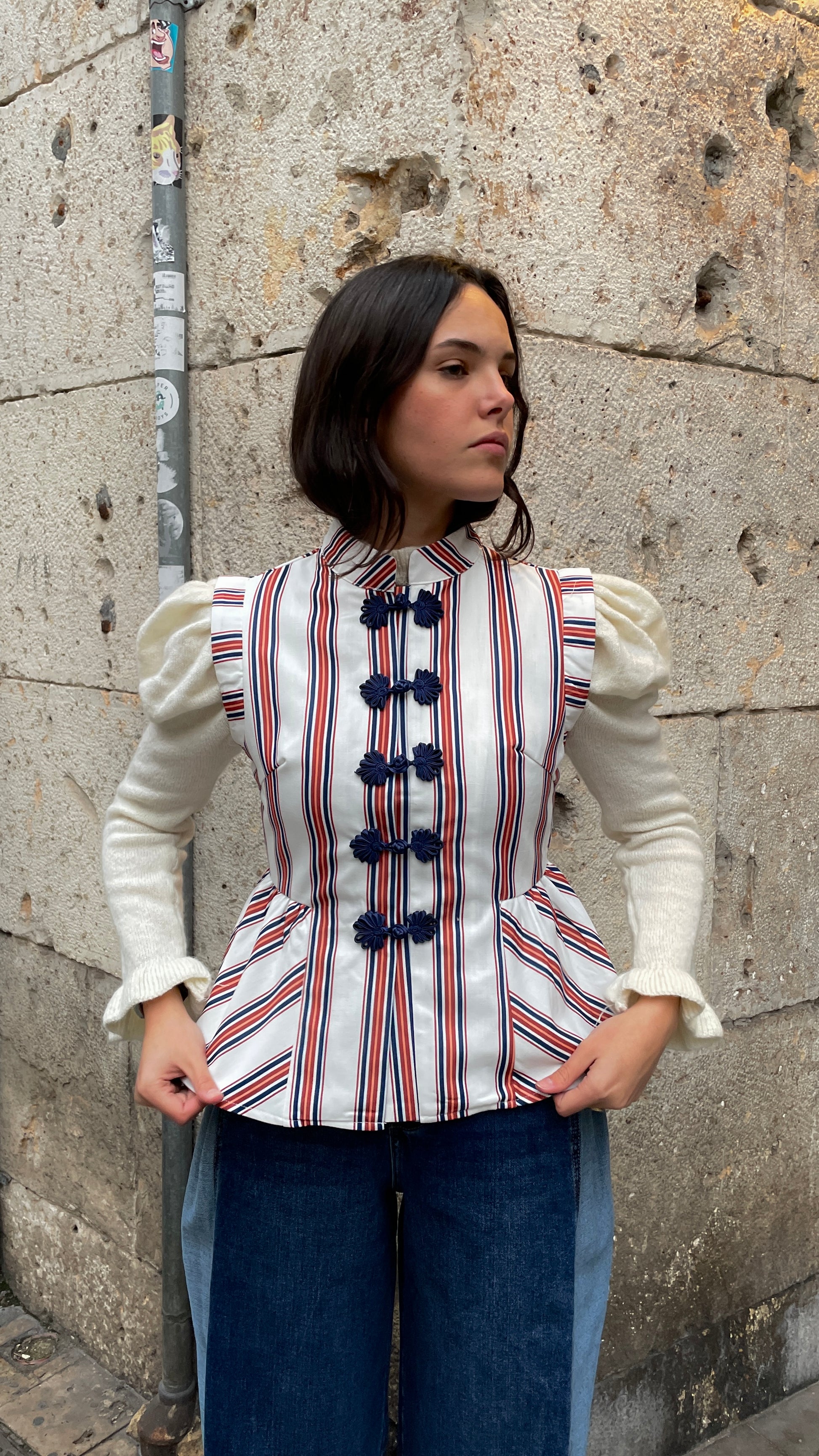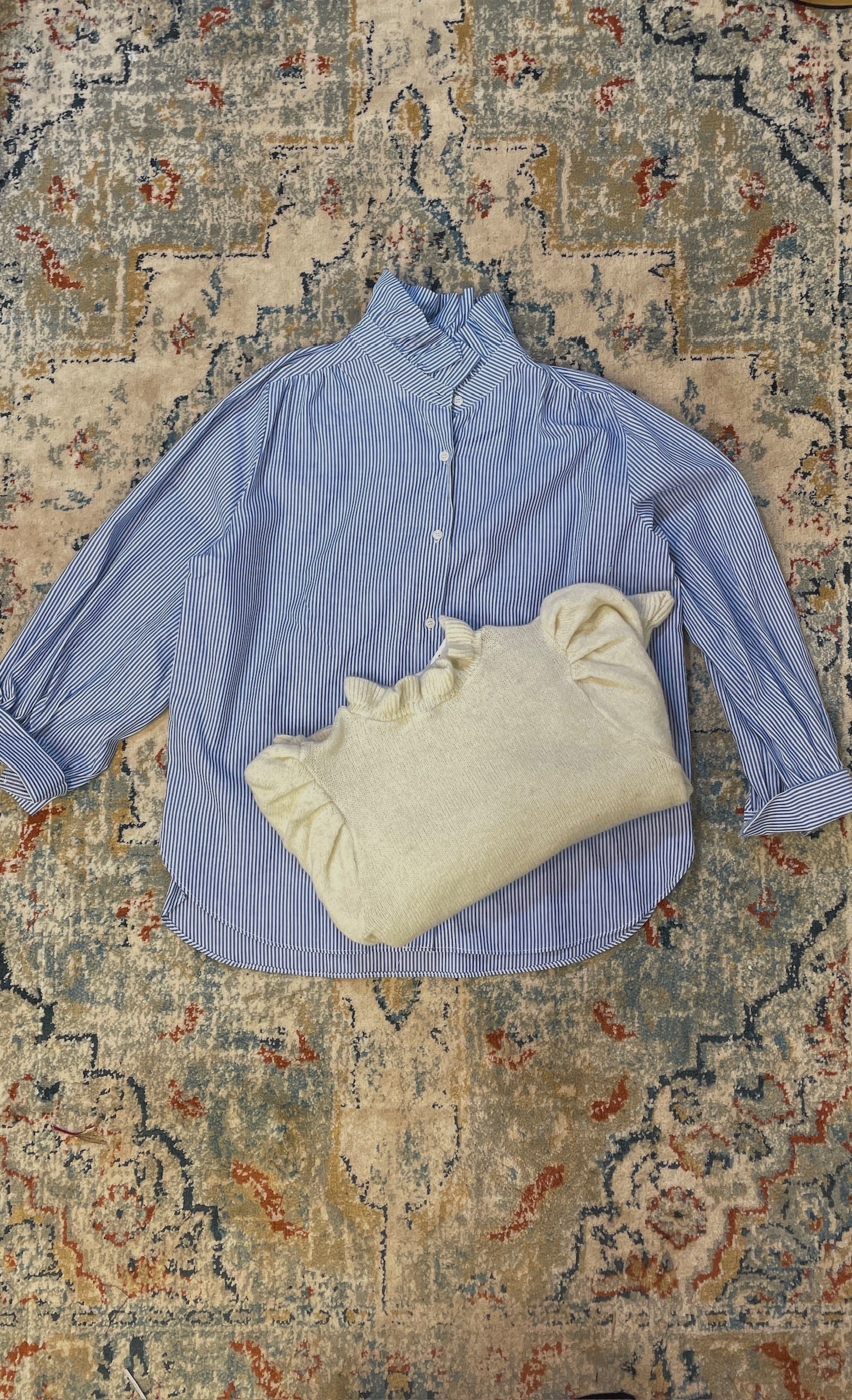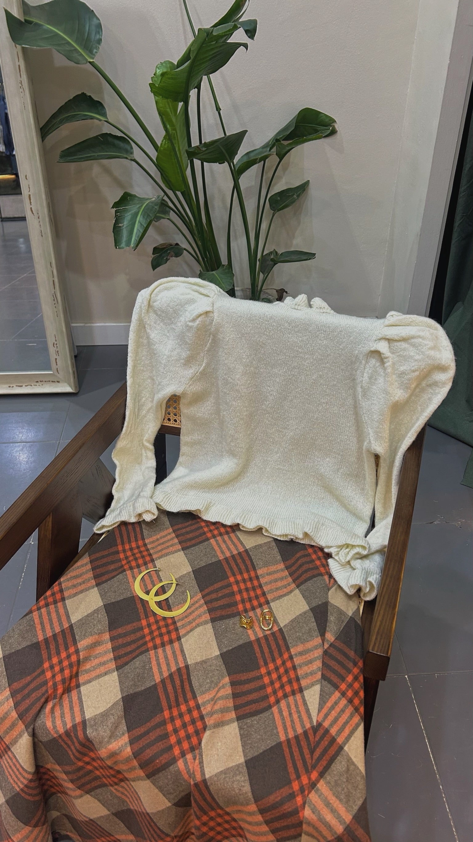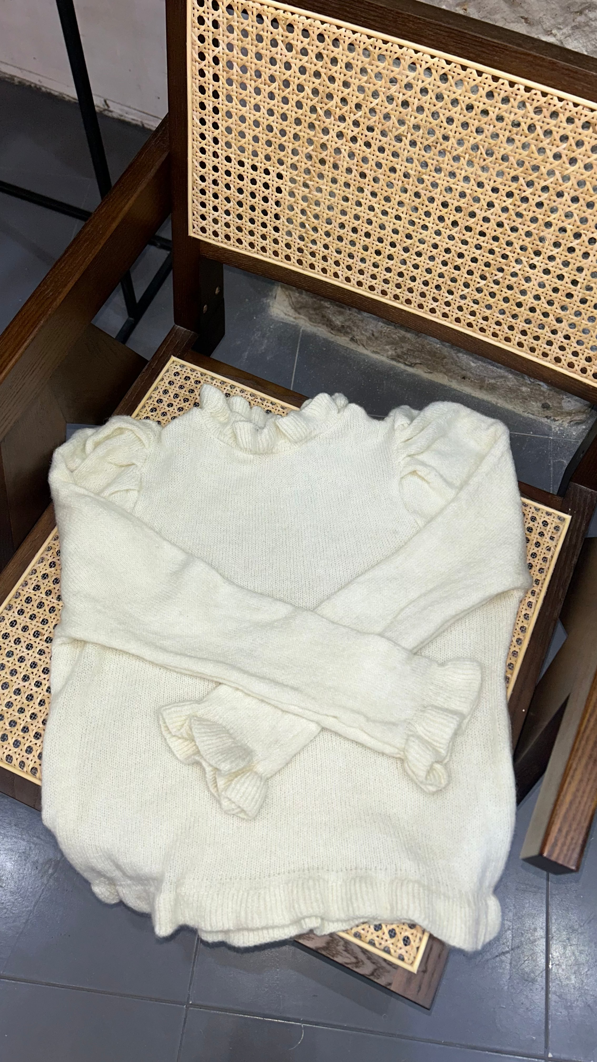 Jersey con cuello fruncido con un pequeño volante, confeccionado en punto fino y mangas abullonadas en los hombros y un pequeño volante en los puños.