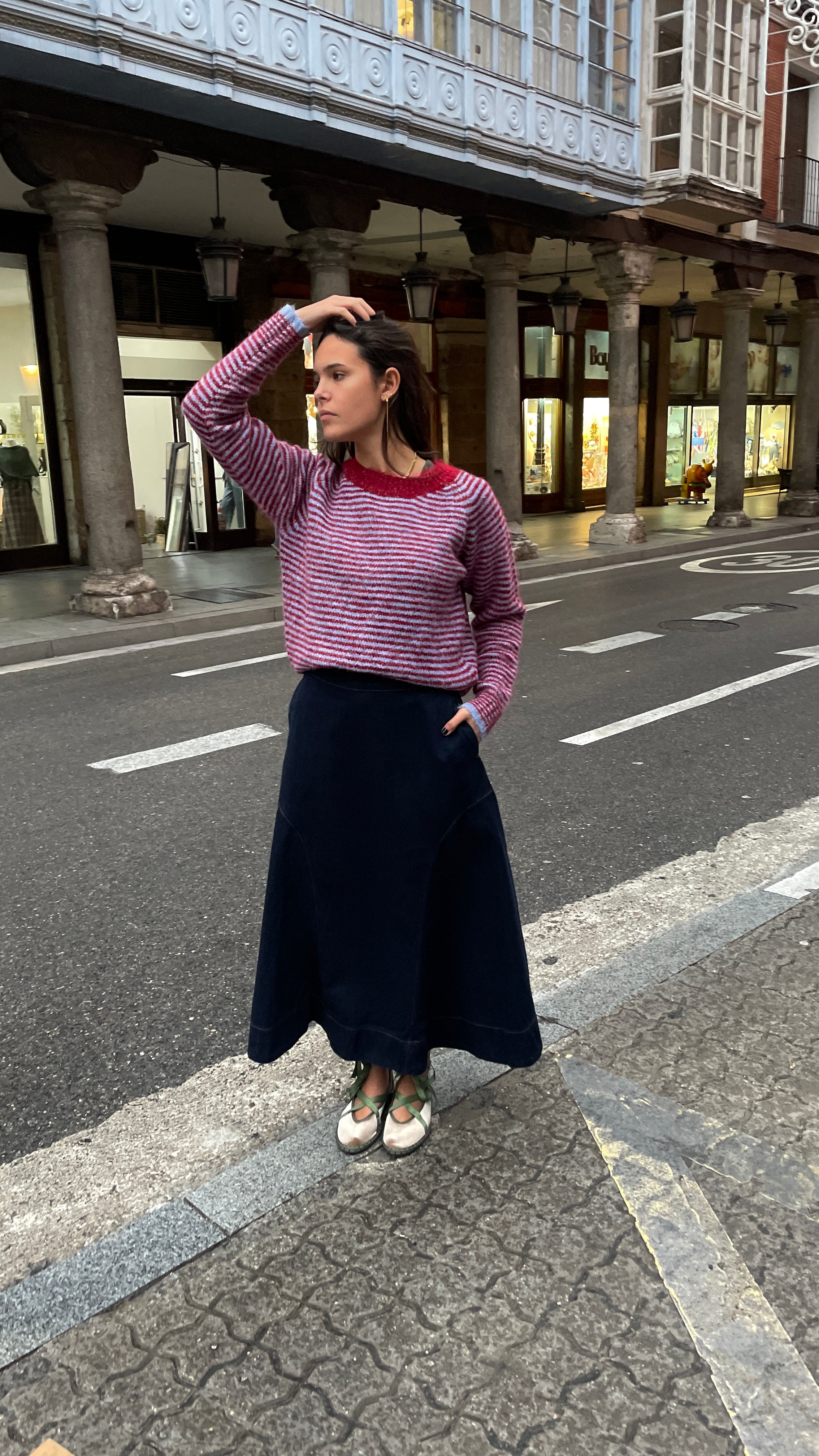 Jersey cuello redondo confeccionado en un punto muy calentito y suave. Detalle en otros tonos en las mangas y cuello.