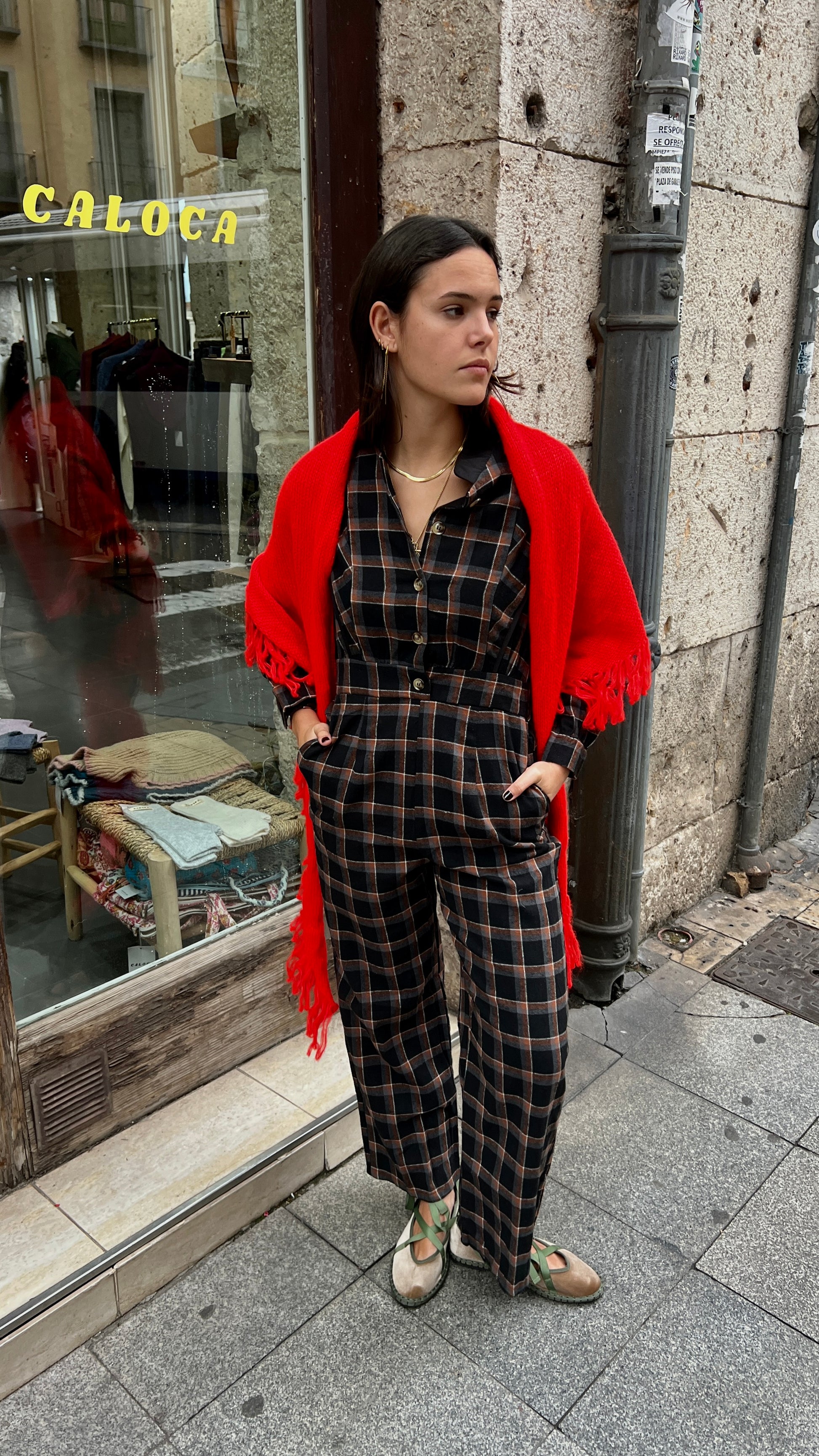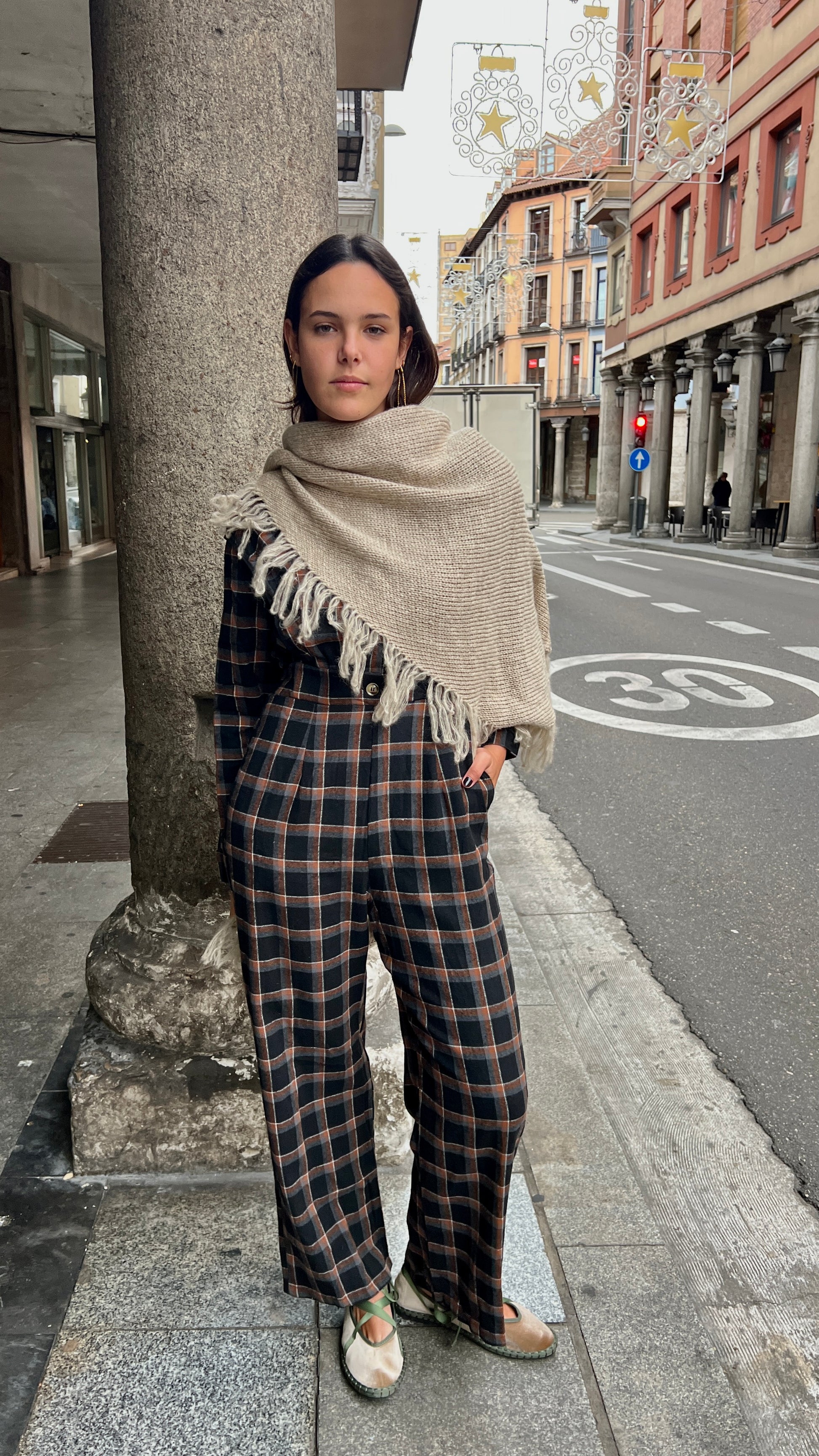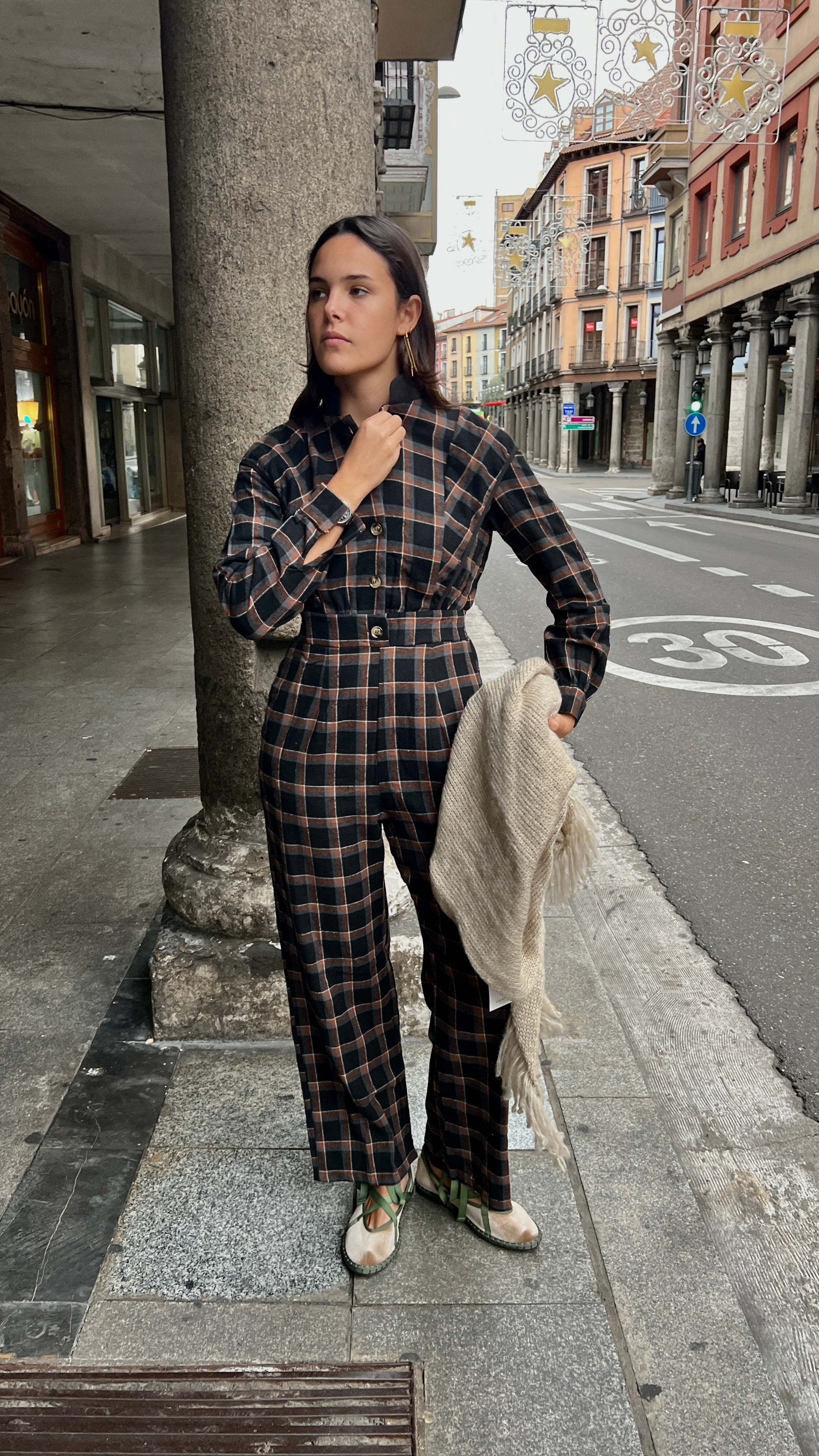 Mono confeccionado en algodón 100%, estampado en cuadros con tonos beige y grises.