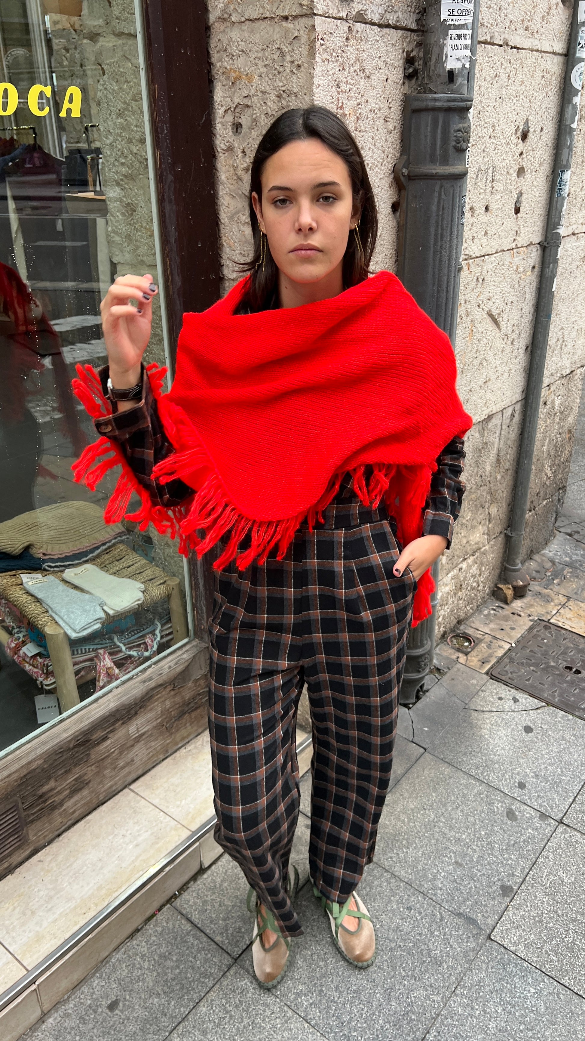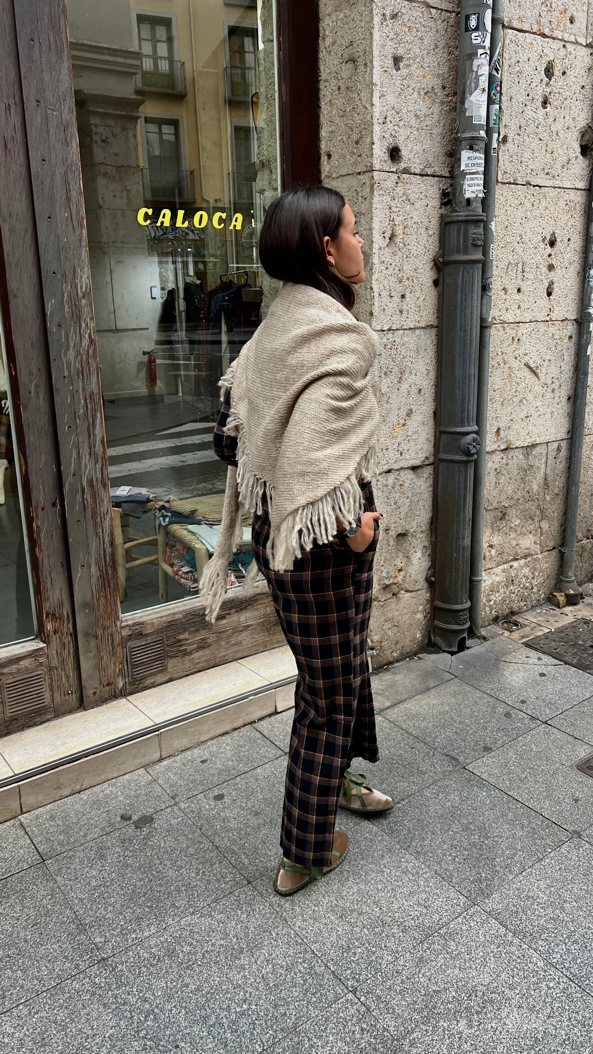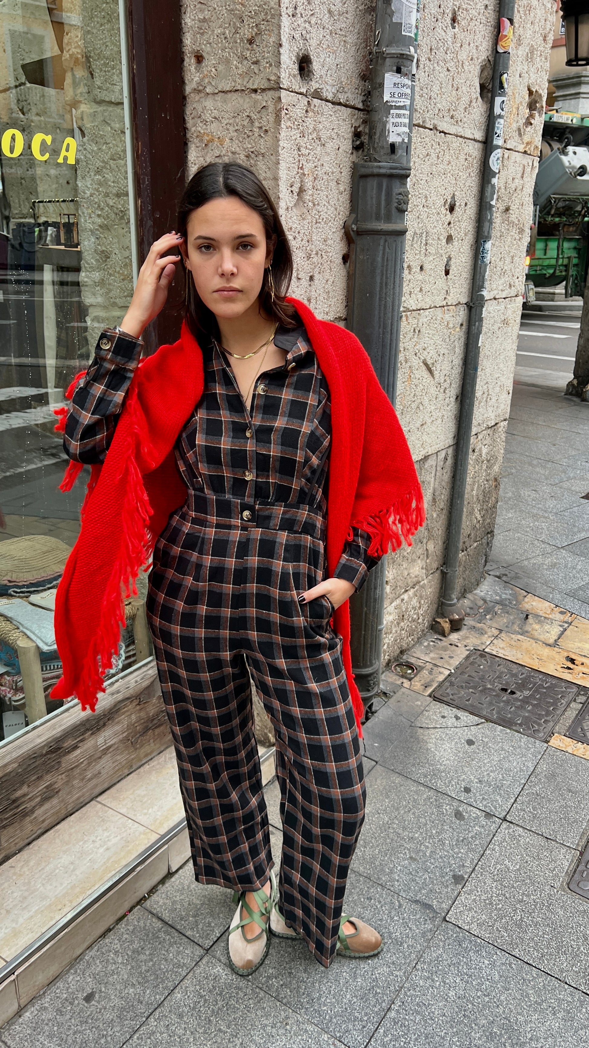 Mono confeccionado en algodón 100%, estampado en cuadros con tonos beige y grises.