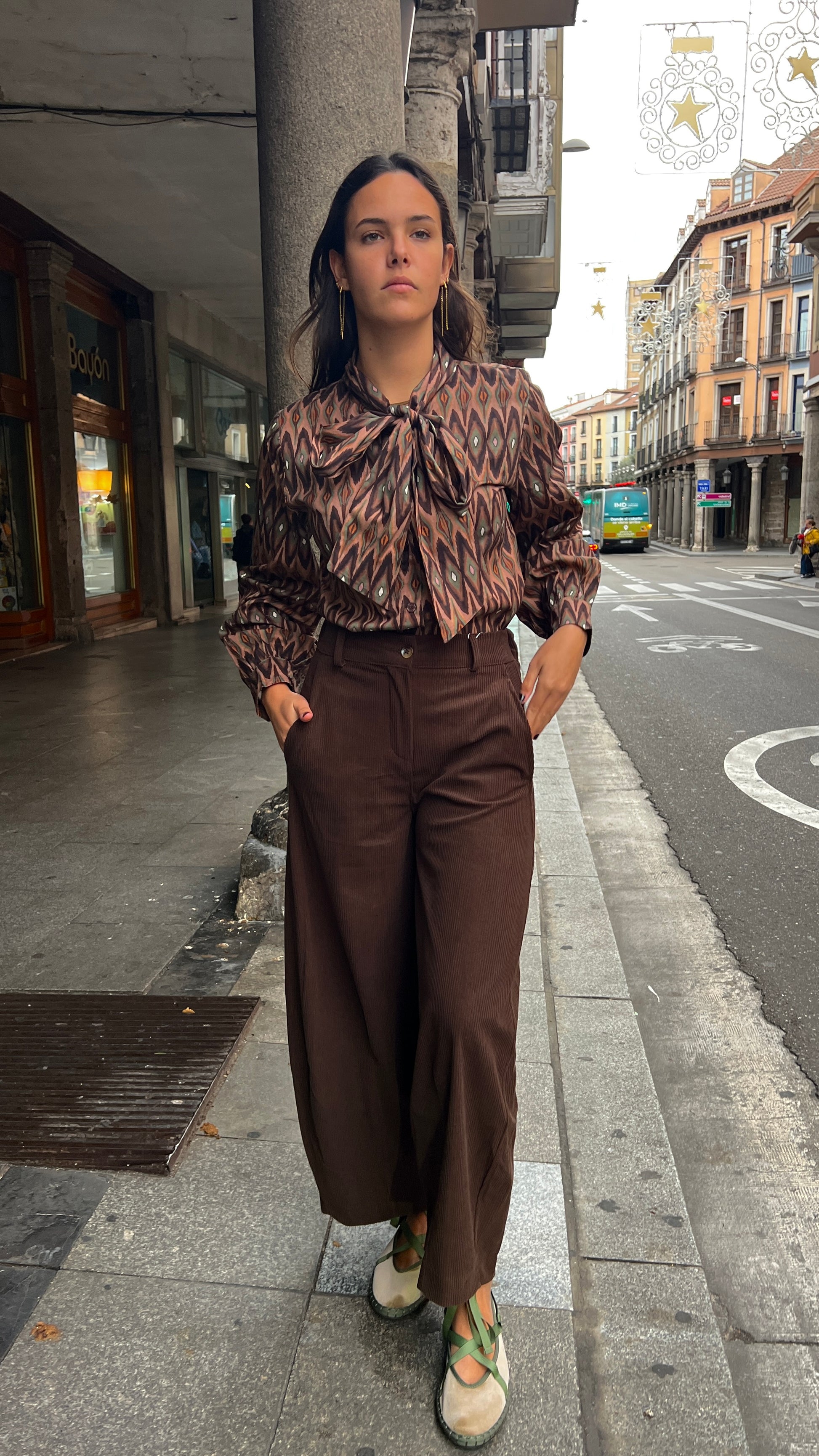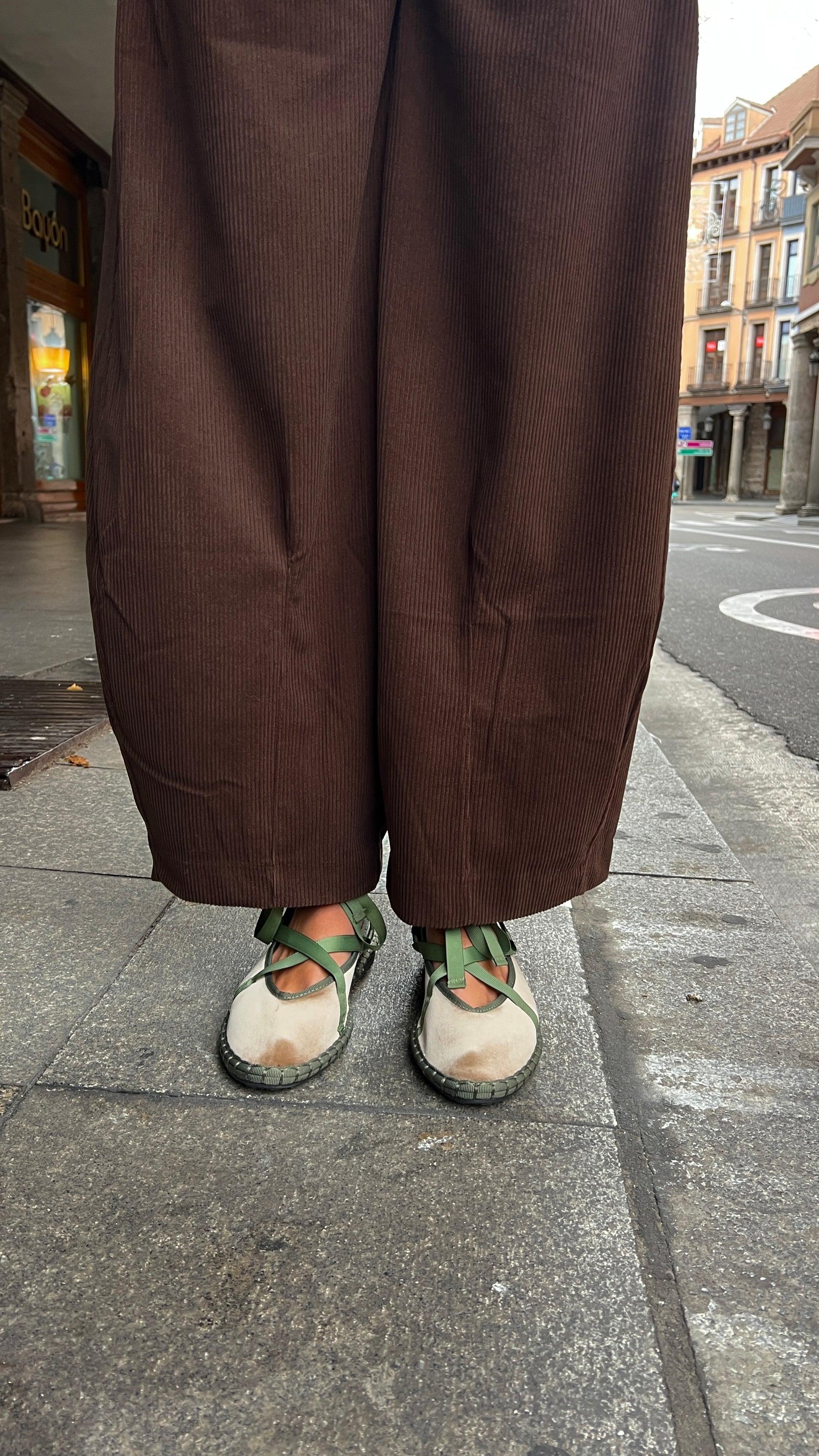 Pantalón globo confeccionado en pana. Con un patrón que estiliza debido a la fluidez del tejido. Es un pantalón cómodo y perfecto para el día a día.