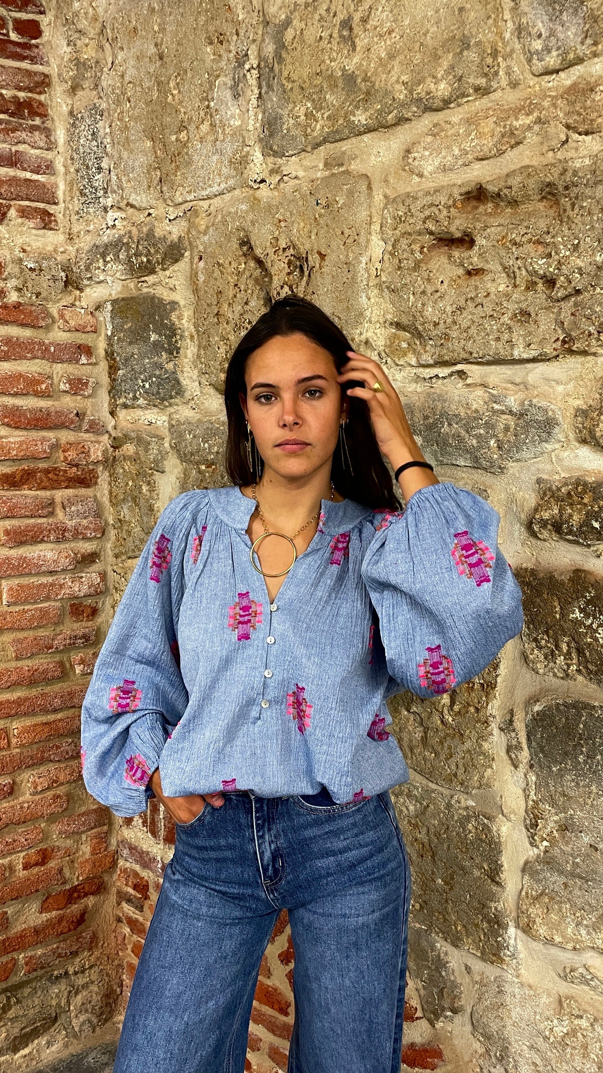 Blusa abotonada con manga abullonada de tela vaquera con estampado fucsia.